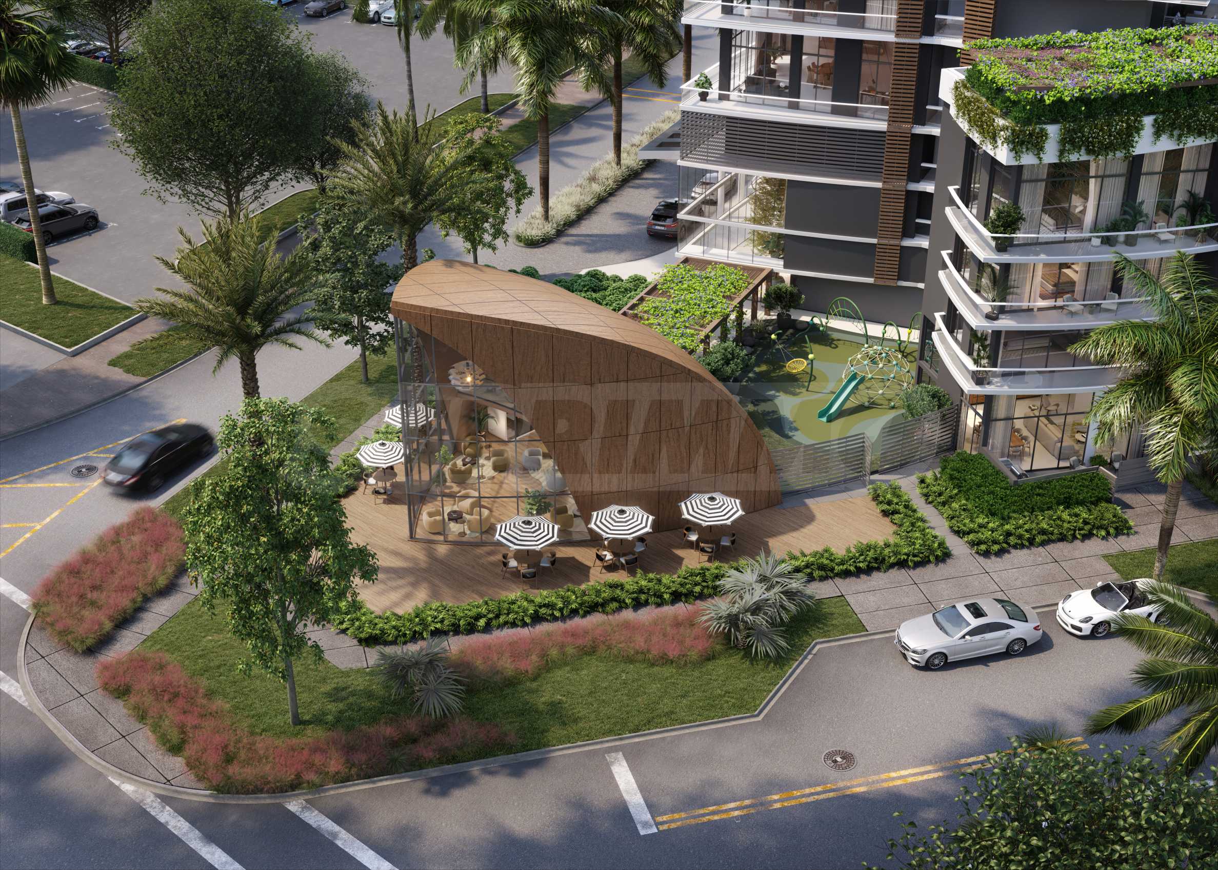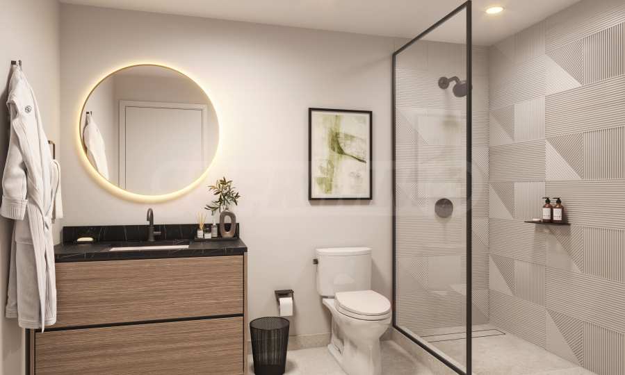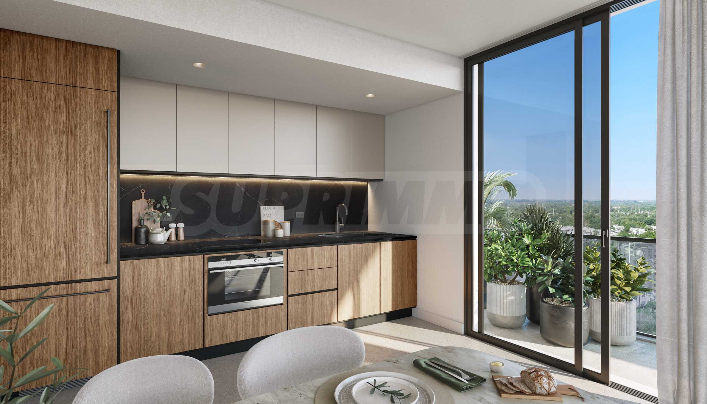The comfort continues outside – the glazed terraces not only expand the living space, but also enrich the architectural vision of the building. The kitchens are equipped with high-end appliances, European cabinets and natural quartz countertops, emphasizing the feeling of elegance and quality.