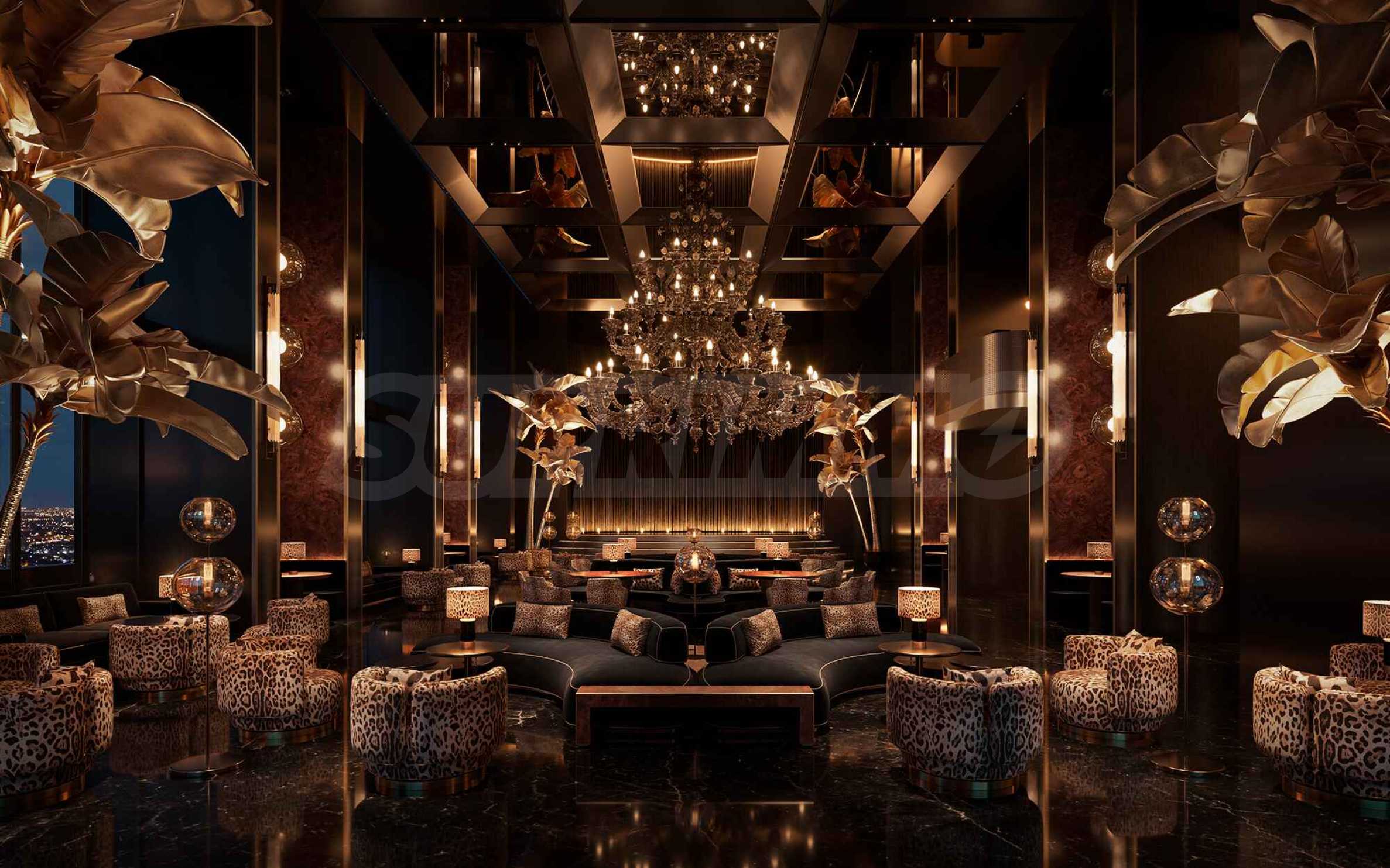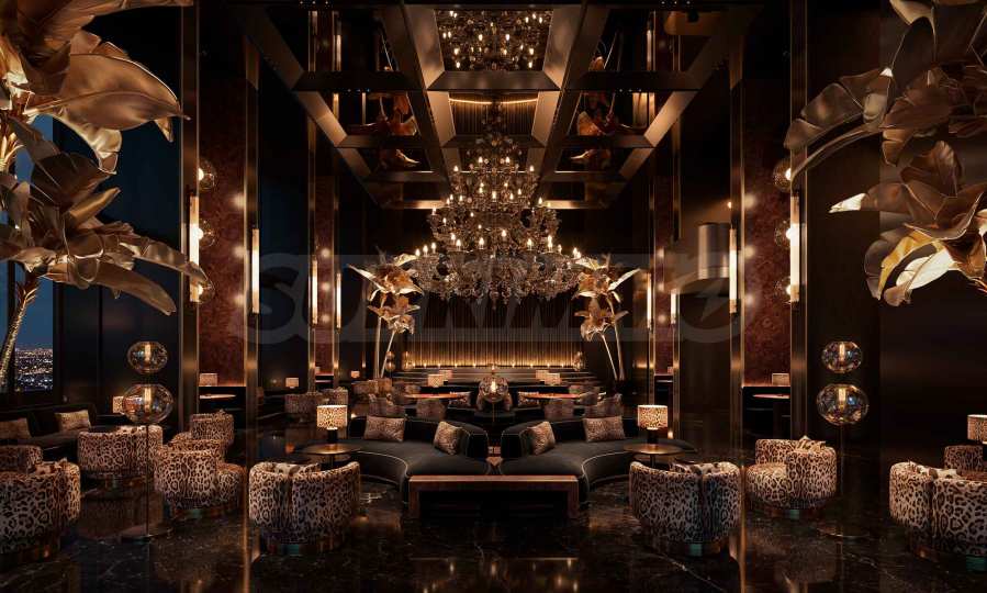 The tower's facade reflects Dolce & Gabbana's inimitable style - ivory travertine stone cladding complemented by elegant, mirrored black glass. The roof can be seen as a work of art in gold and glitter.