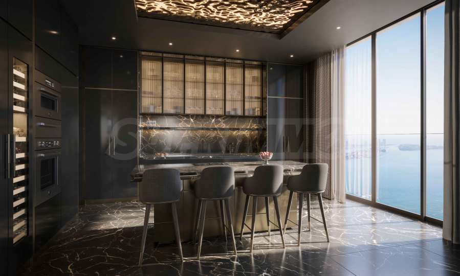 The ceilings throughout the building are high, thus enhancing the feeling of space and breadth, but the most impressive remains the lobby, which welcomes its visitors with a ceiling 6 meters high. The floor-to-ceiling windows not only expand the rooms, but also serve as natural frames for the incredible views. Especially in the evening, when the sun sets, Biscayne Bay and the Atlantic Ocean look like they were painted. Some of the apartments have views of Downtown, where skyscrapers create a fabulous cityscape.