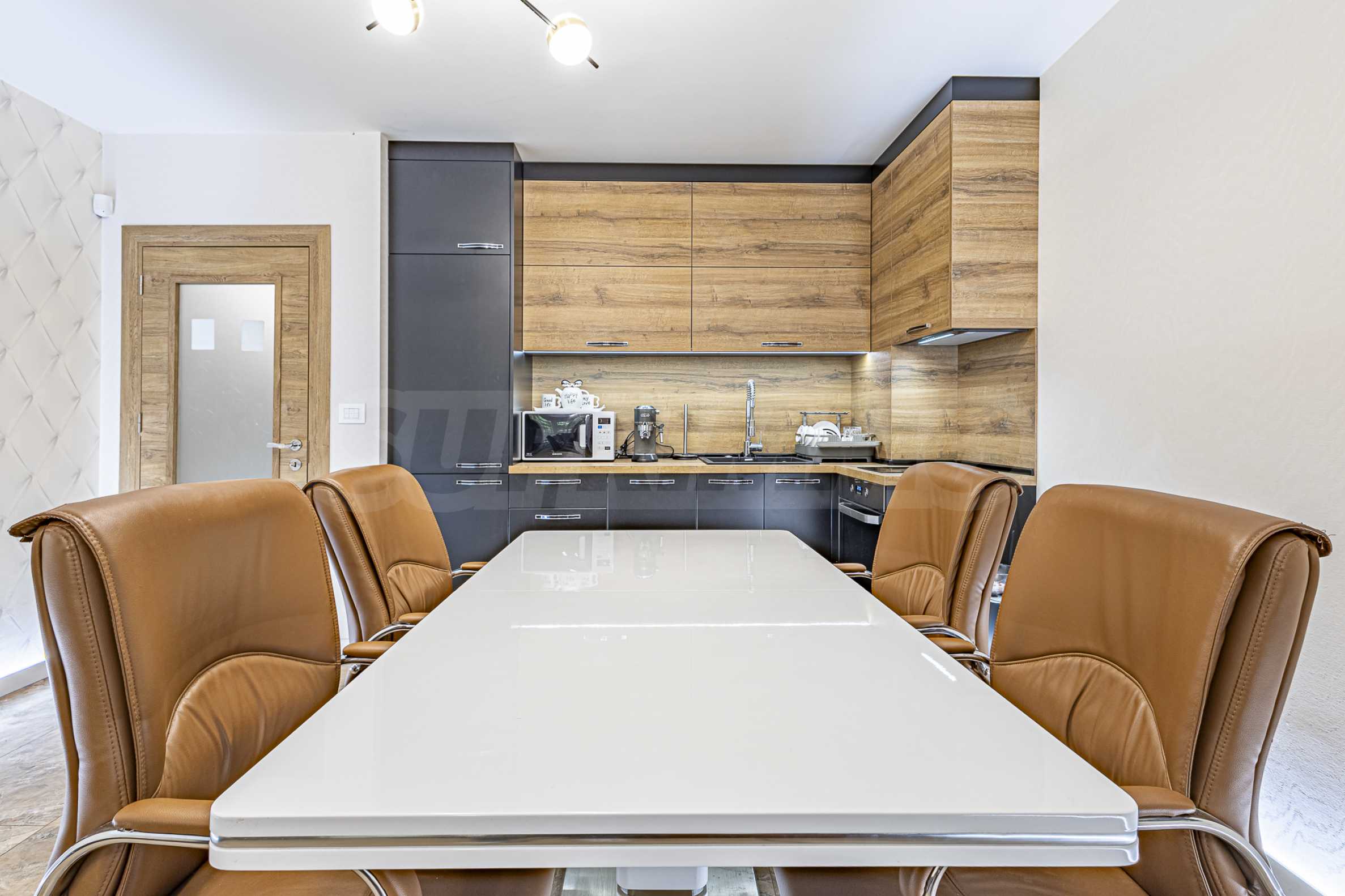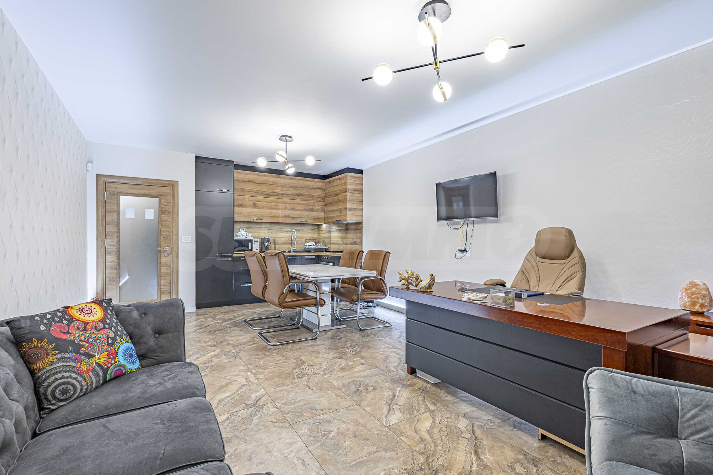 - a room with a representative desk, a table with four chairs, a sofa and a fully equipped, modern kitchen;