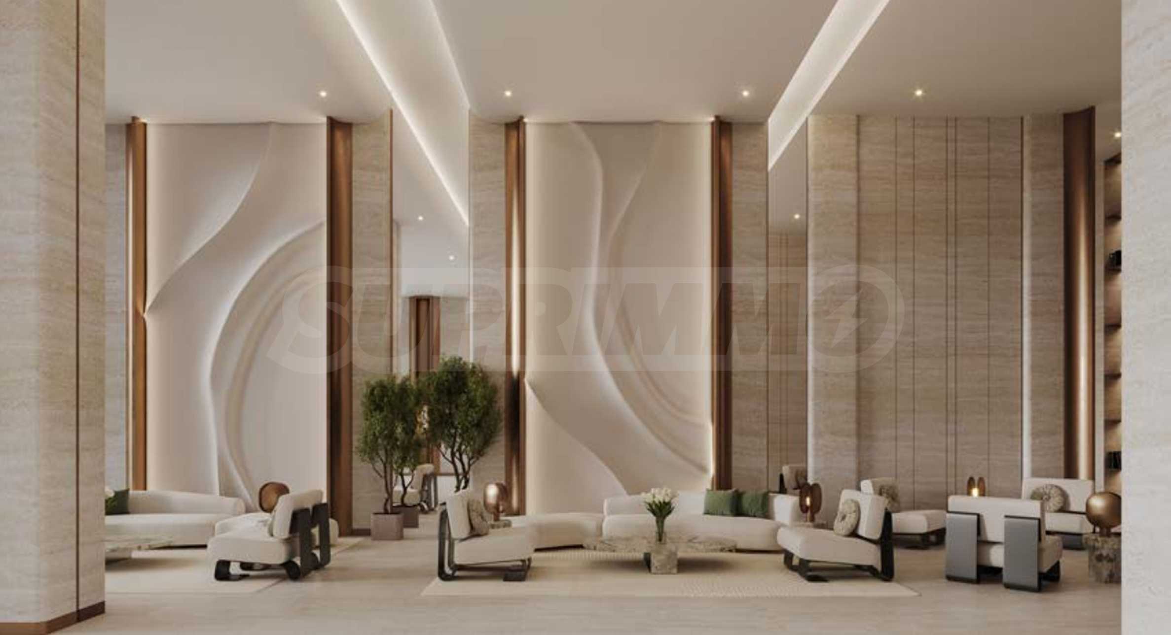 The building welcomes its residents with an elegant, spacious lobby with reception, as well as areas for relaxation and socialization. The interior architecture impresses with high ceilings and airy spaces, and the design of the common areas is based on a combination of light tones and wooden accents, which create warmth and a sense of coziness. The textures used, carefully selected furniture and the presence of natural plants add life and harmony to the interior. In addition, the ground floor has a shop and a green corner for relaxation.