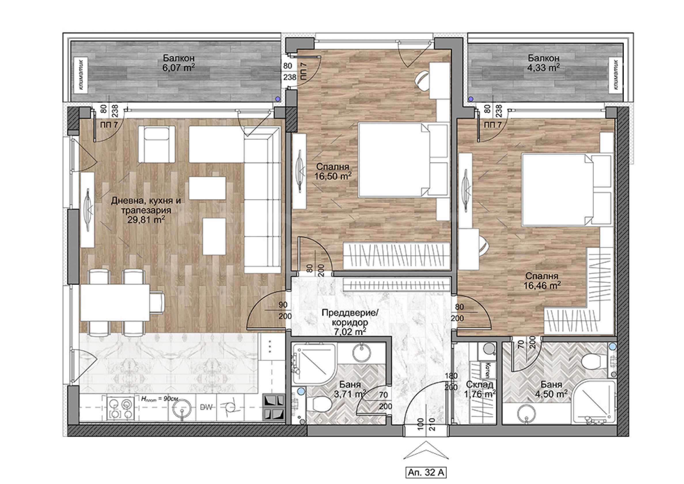 The apartment is offered for sale with high-quality finishing according to Bulgarian Standards, with plaster and screed.