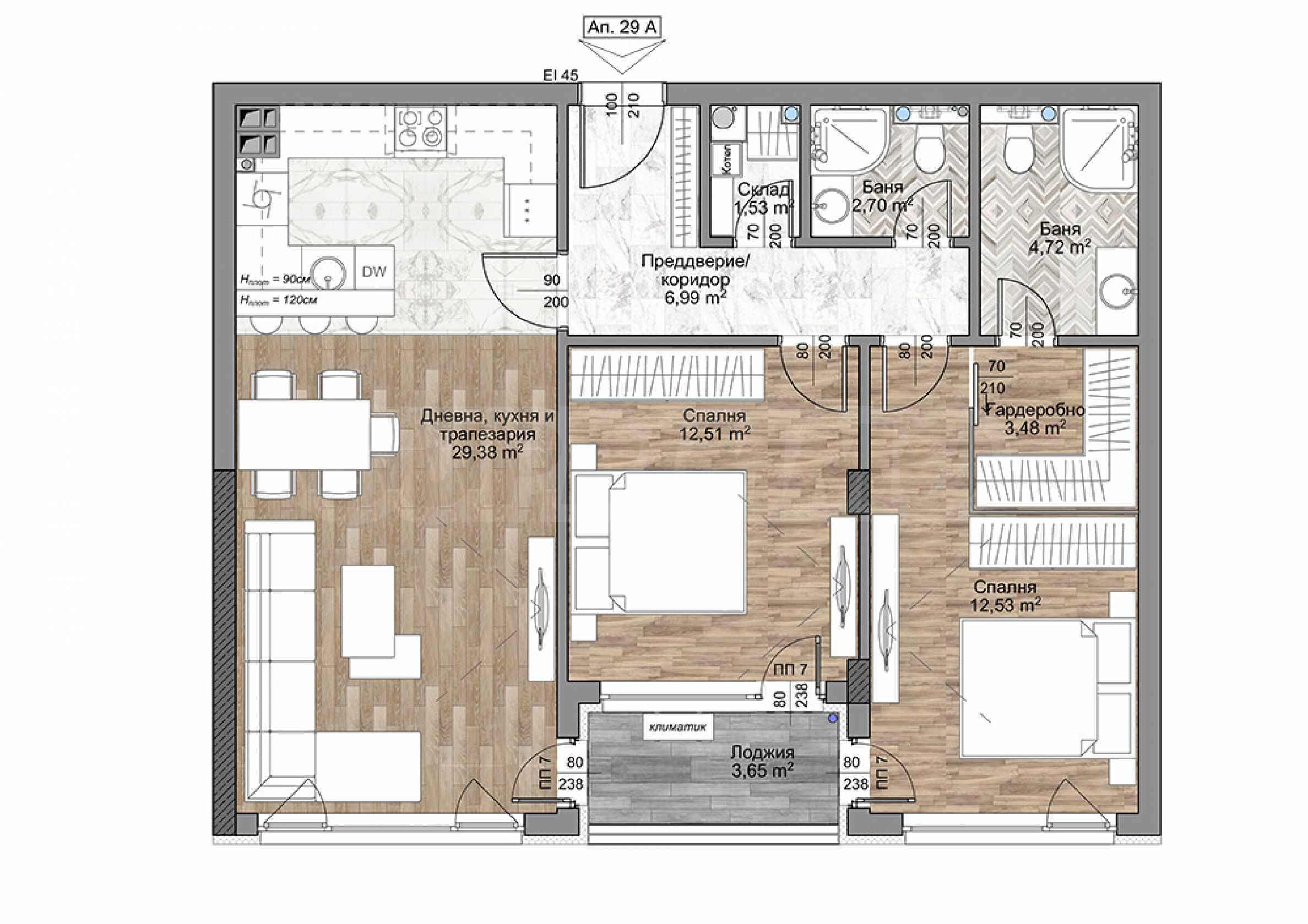 The apartment is offered for sale with high-quality finishing according to Bulgarian Standards, with plaster and screed.