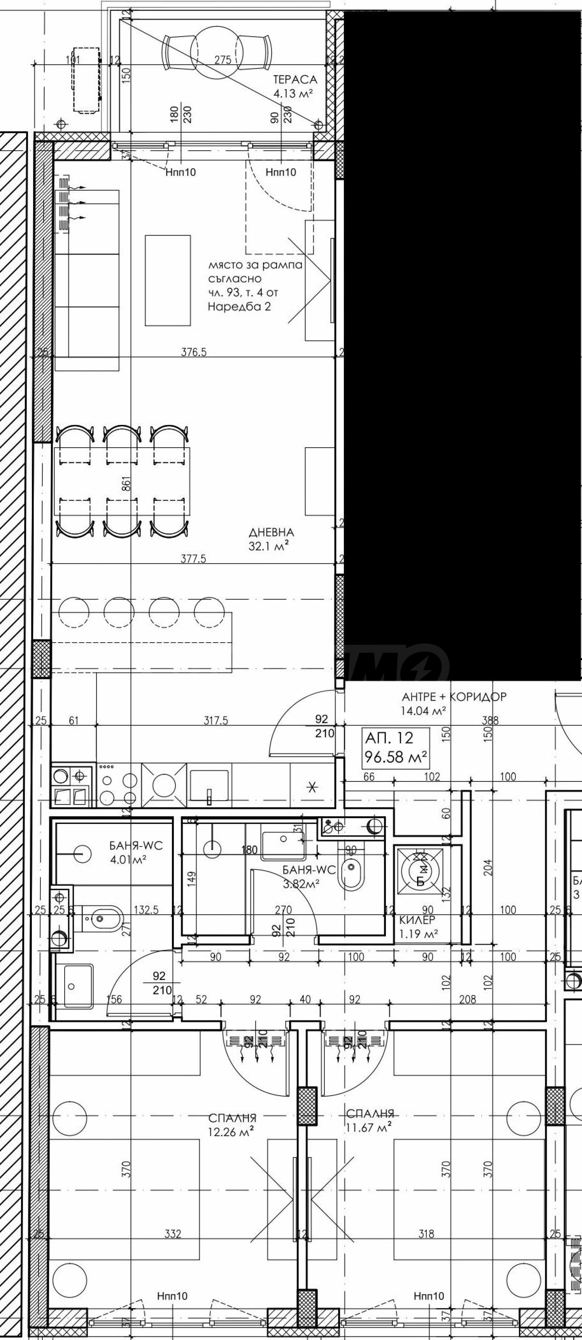 The apartment is offered for sale with high-quality finishing according to Bulgarian Standards, with plaster and screed.