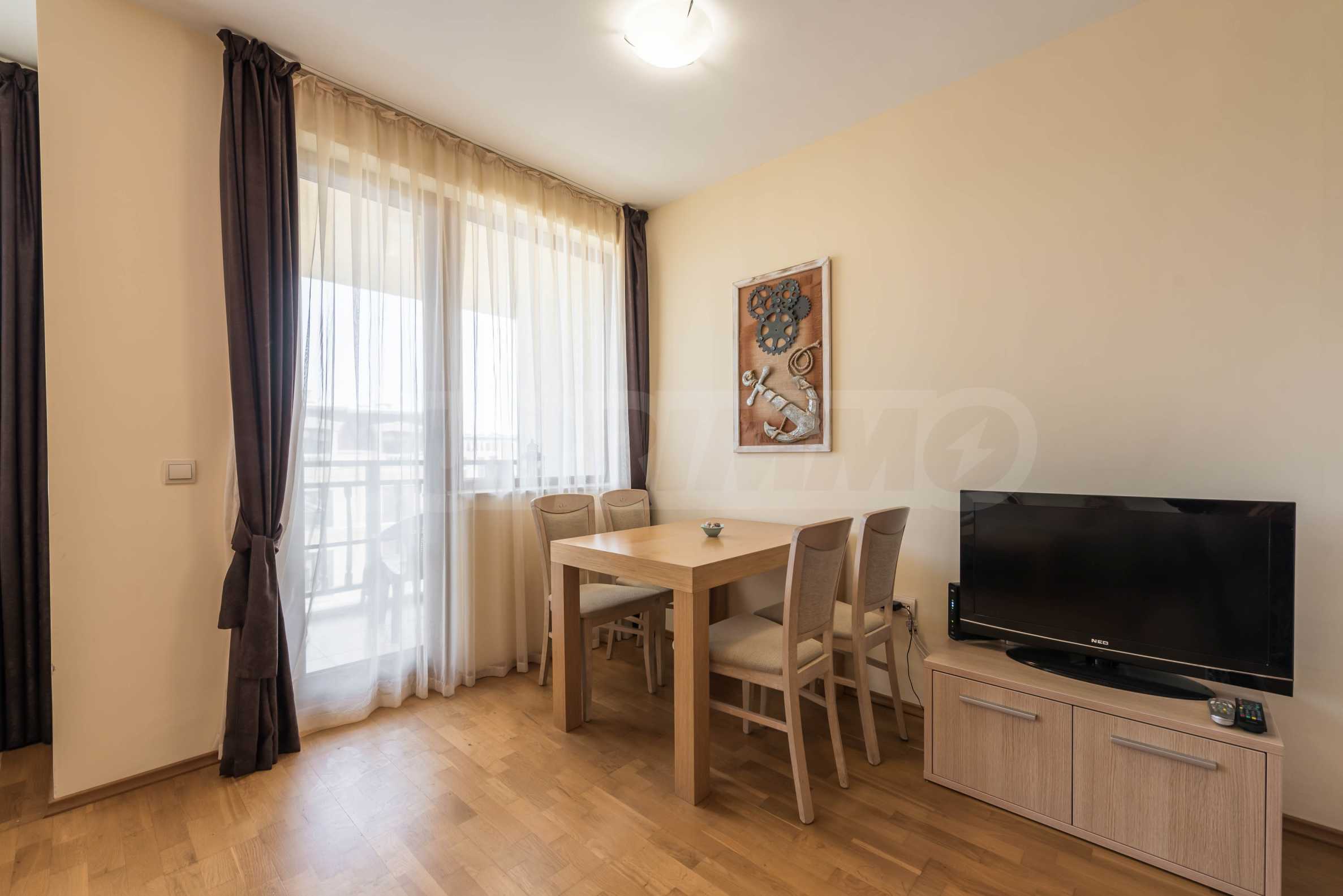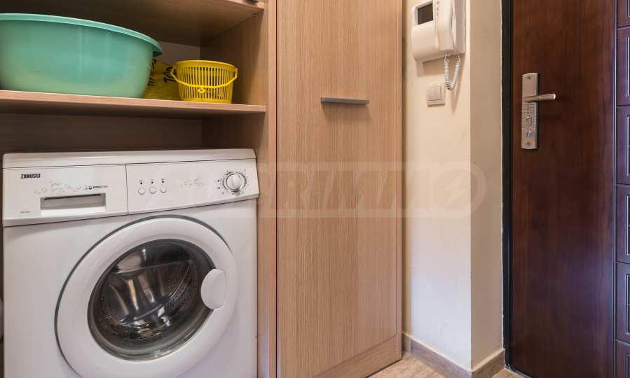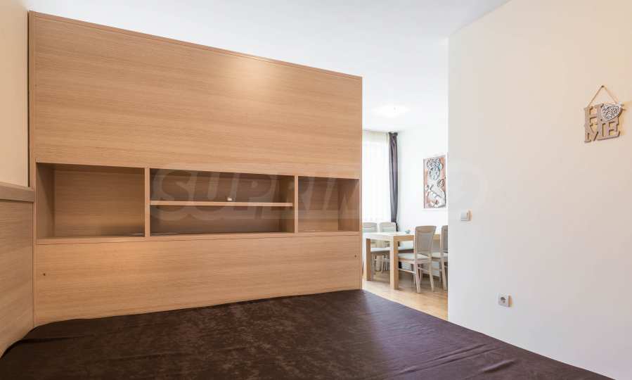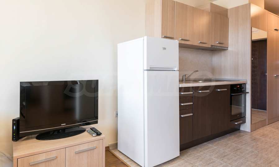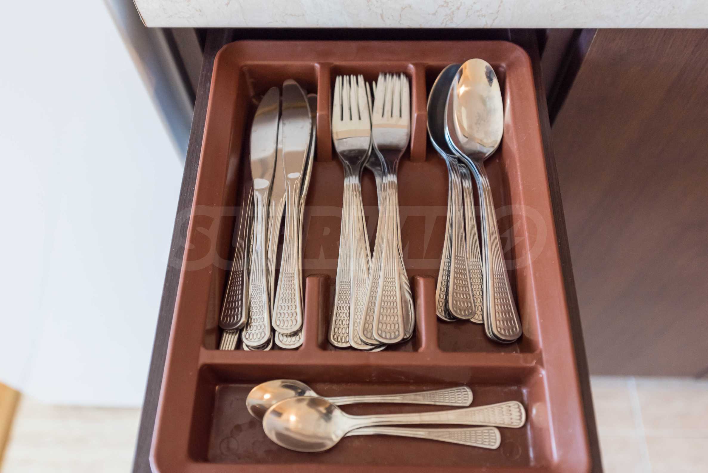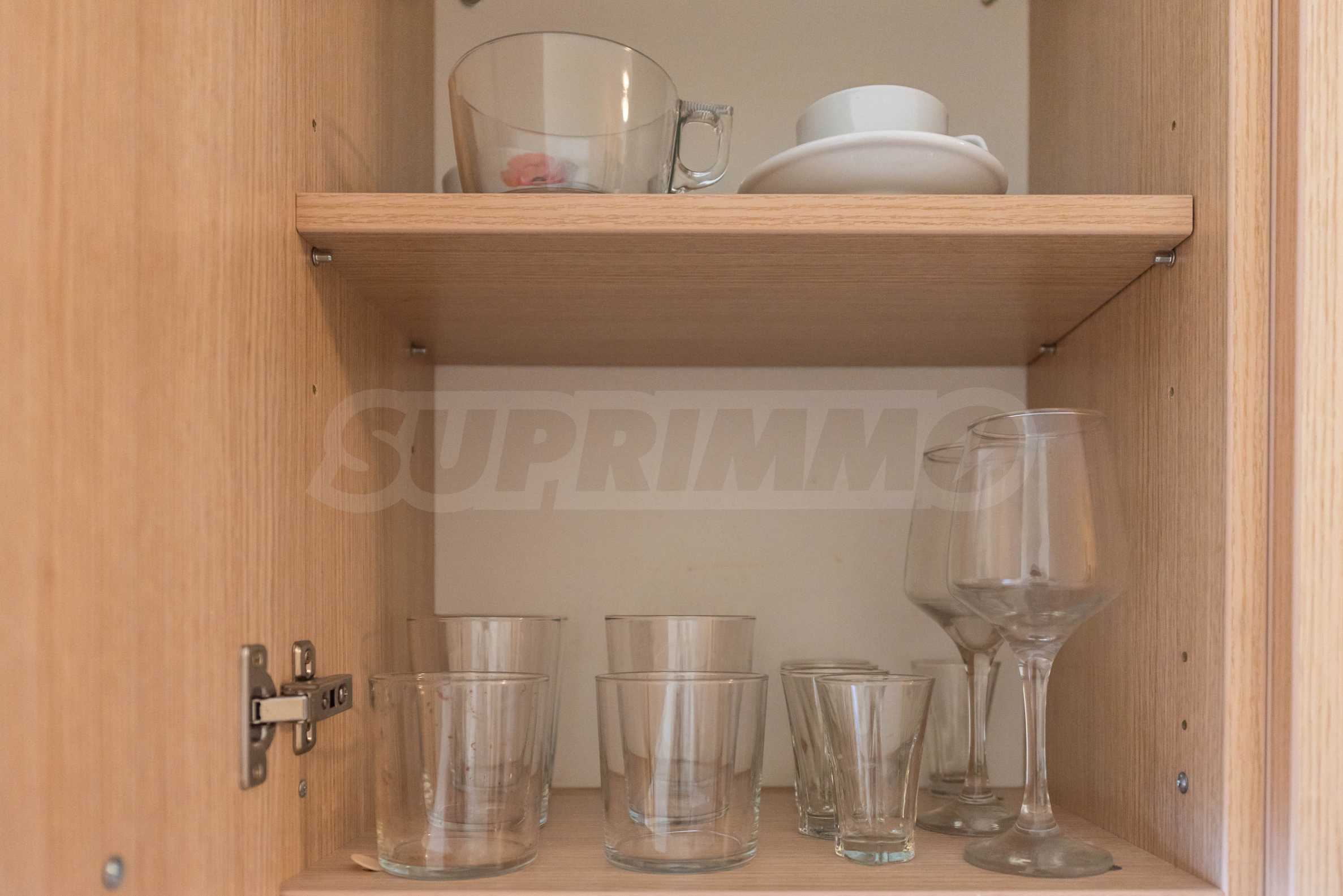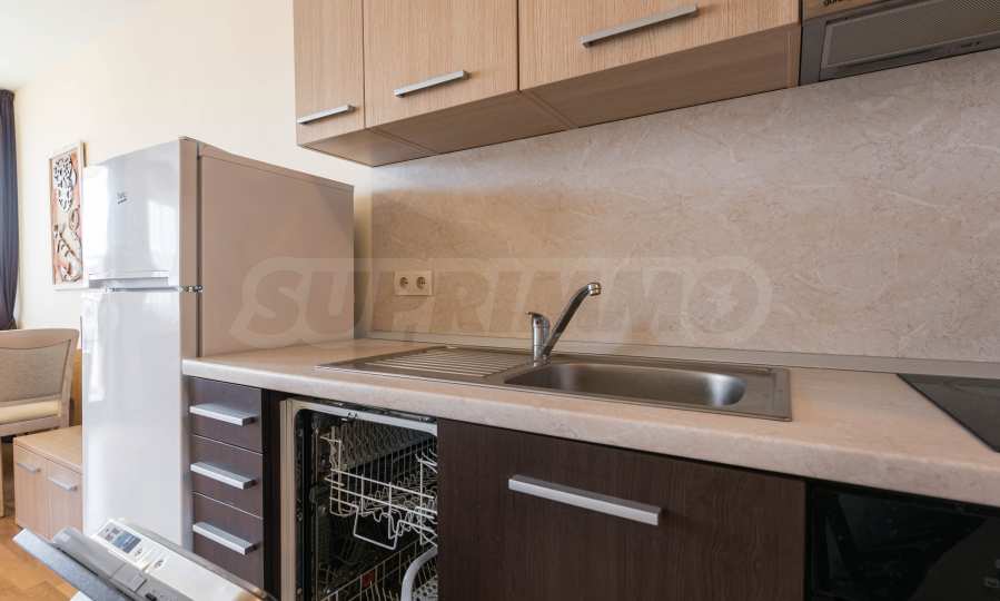 The studio is fully furnished and equipped with everything necessary for comfortable living, such as furniture and electrical appliances - air conditioning, TV, washing machine, stove, refrigerator, dishwasher, kitchen utensils.