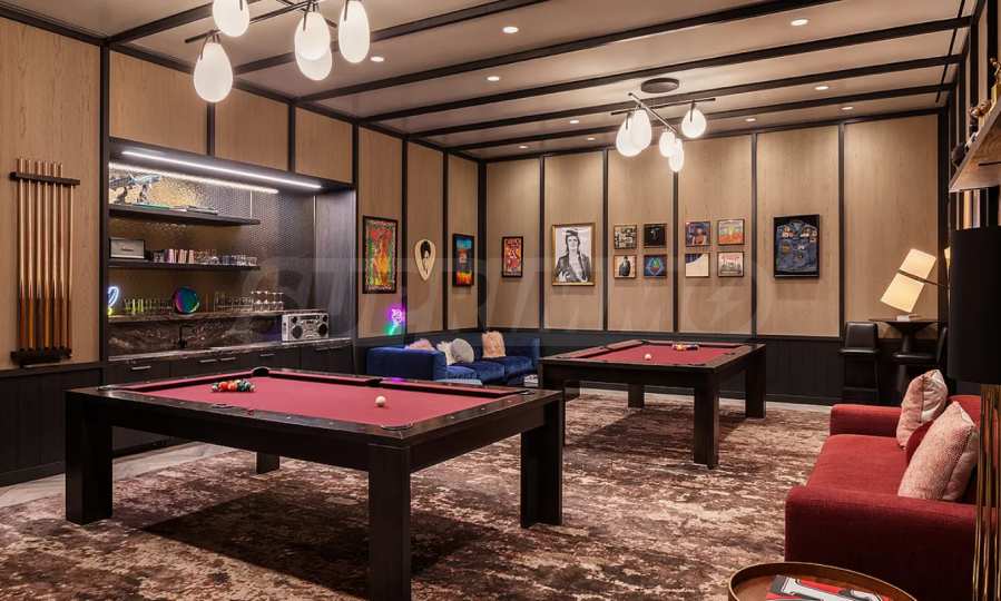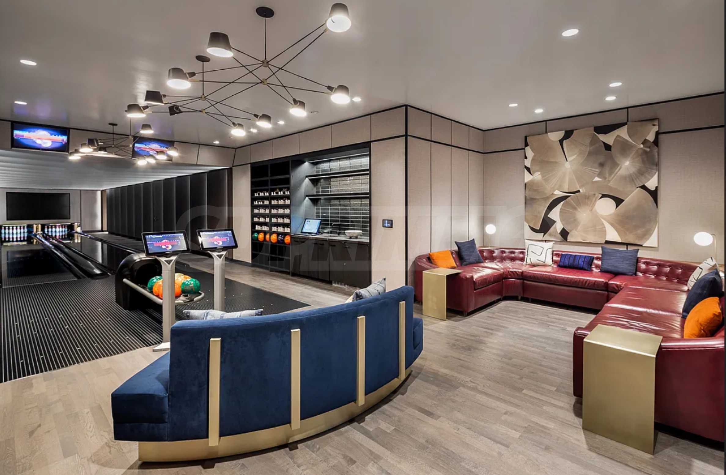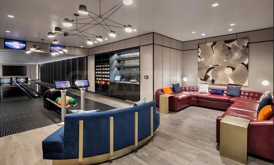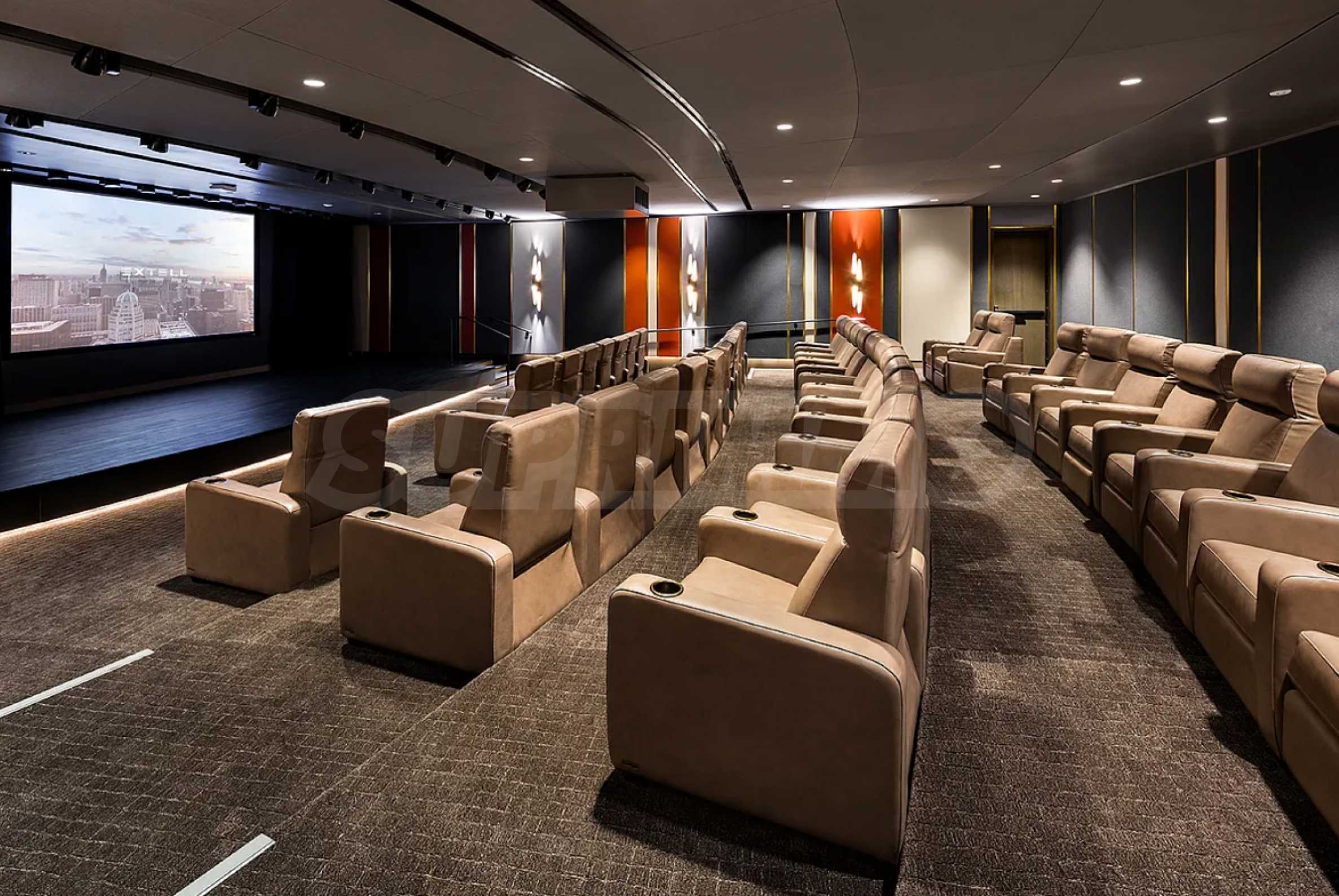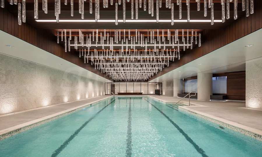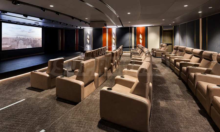 The spa area is a peaceful retreat with a heated indoor pool, a separate children’s pool, and dedicated relaxation zones. For entertainment and socializing, residents enjoy access to a 70-seat movie theater, golf simulator, two-lane bowling alley, and various game rooms.