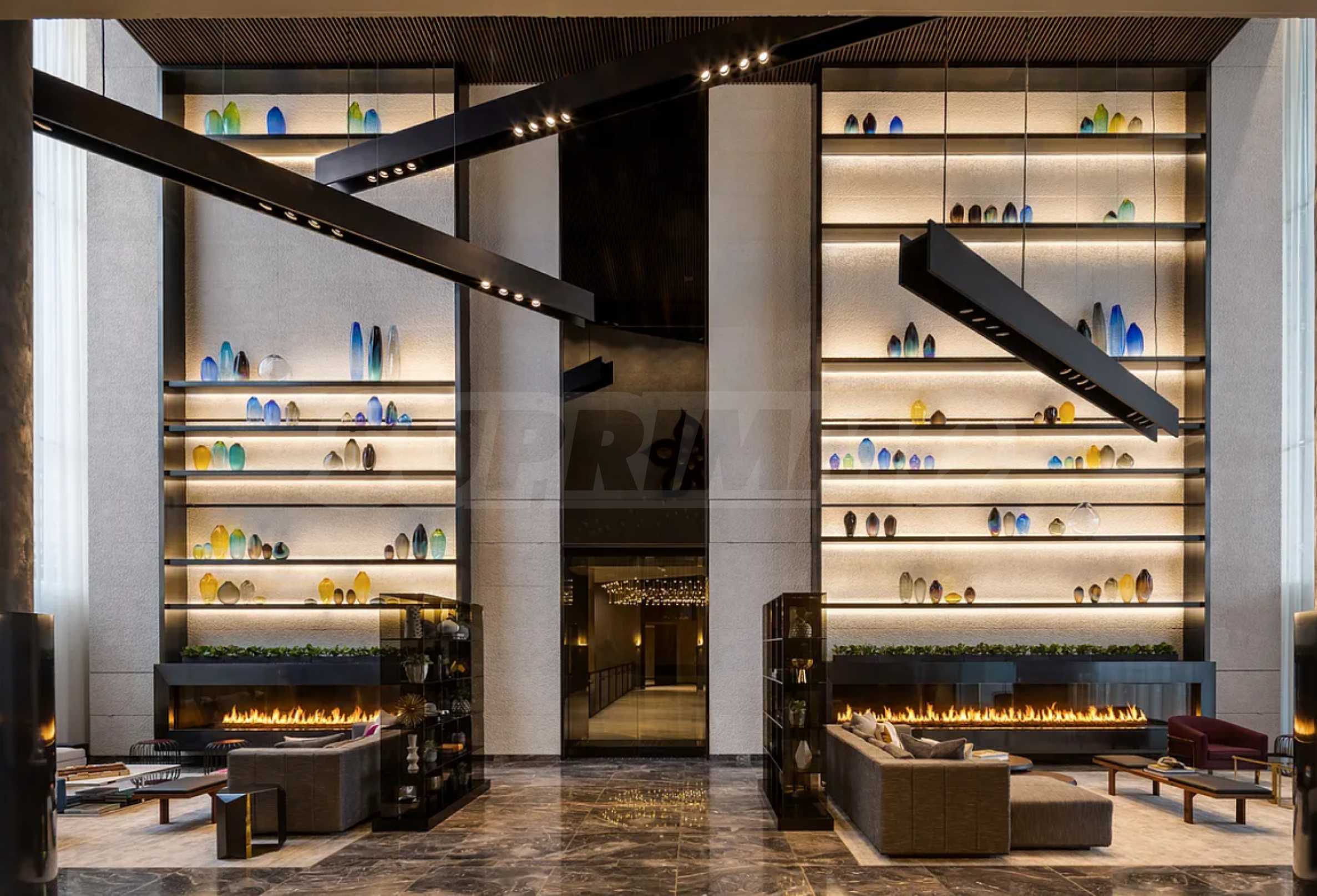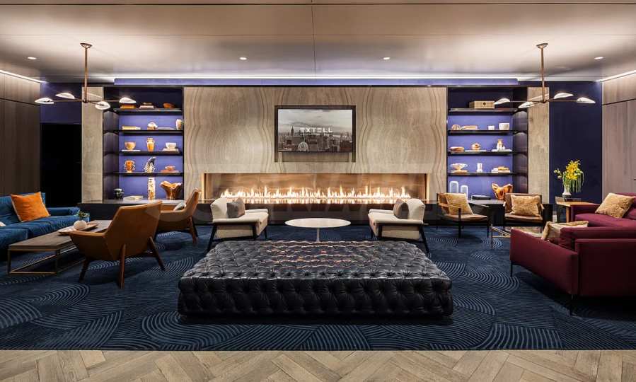 The lobby spans three levels and is designed by the renowned Meyer Davis Studio – the creative force behind some of the world’s most celebrated hotels. It features contemporary elegance, custom design elements, and luxurious materials such as imported marble. Spacious seating areas with modern fireplaces and a grand chandelier above the concierge desk leave a lasting first impression.