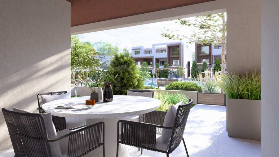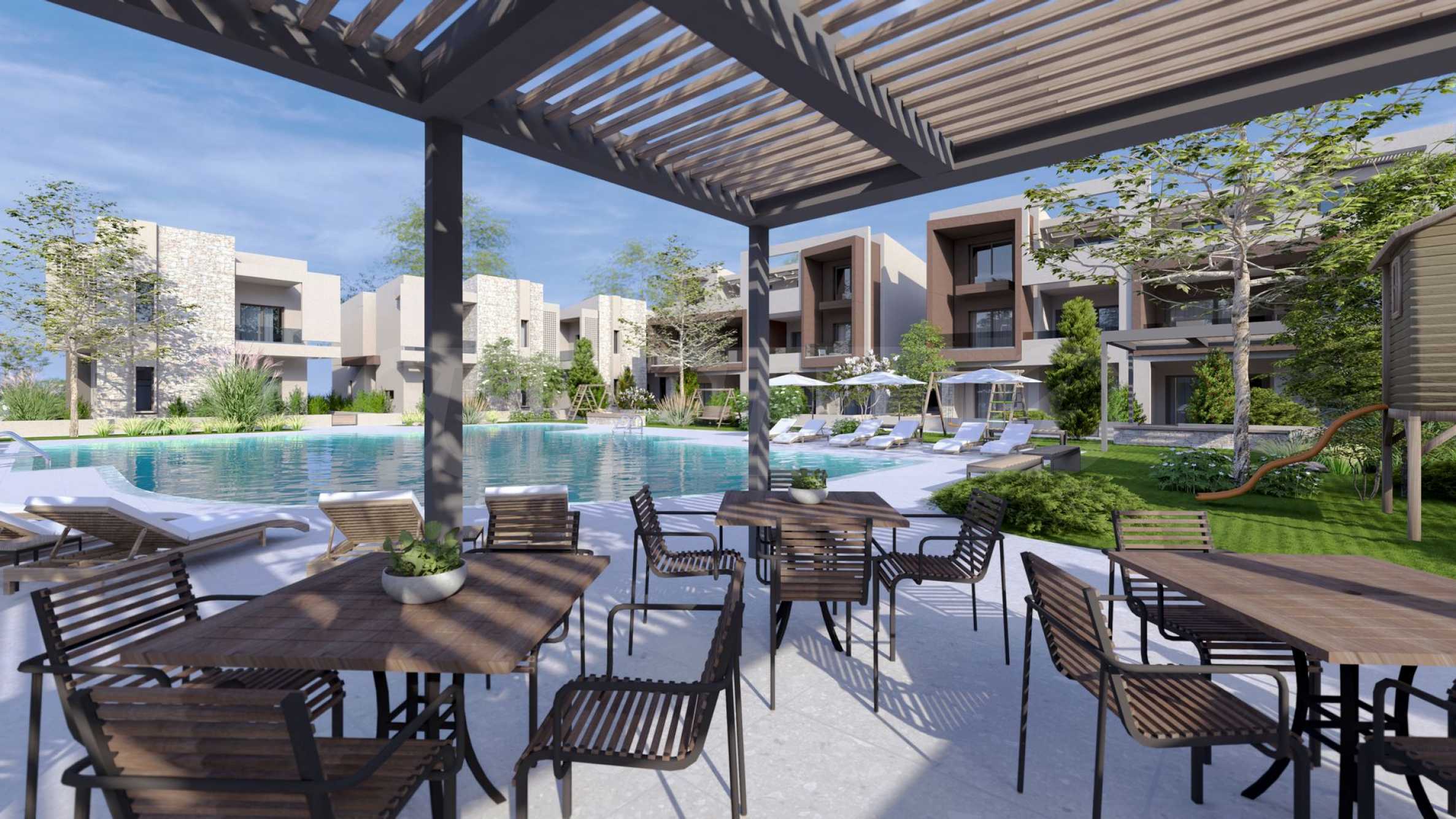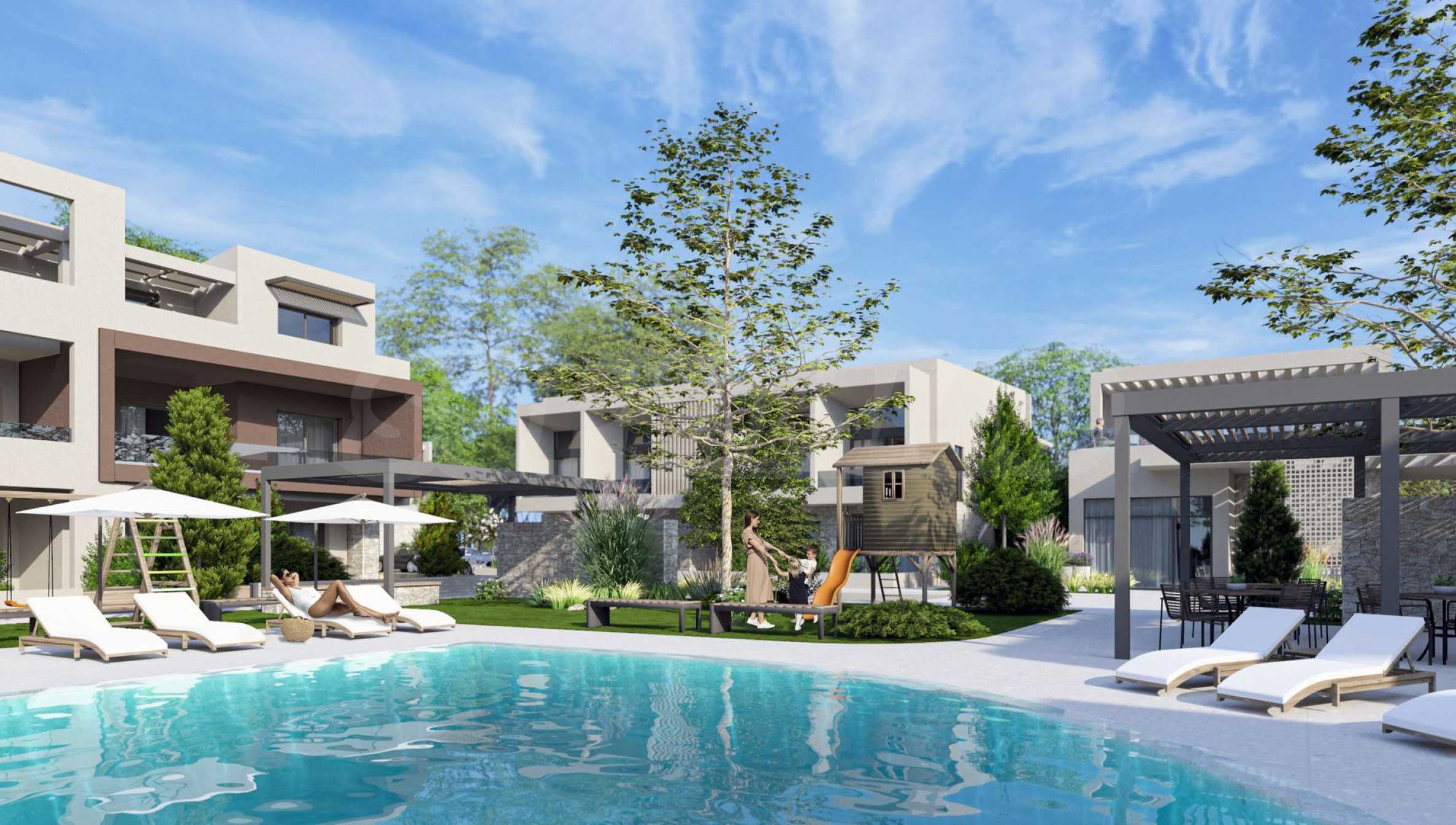 The development is built using carefully selected, high-quality materials, including large windows and glazed terraces – hallmark features of modern architecture. The landscaped grounds are adorned with natural stone elements and lush greenery, creating a serene environment ideal for relaxation. A large communal outdoor swimming pool offers a refreshing escape and a social hub for residents to enjoy time with family and friends. Around the pool, you’ll find designated relaxation areas and a children’s playground where the little ones can have fun while you unwind.