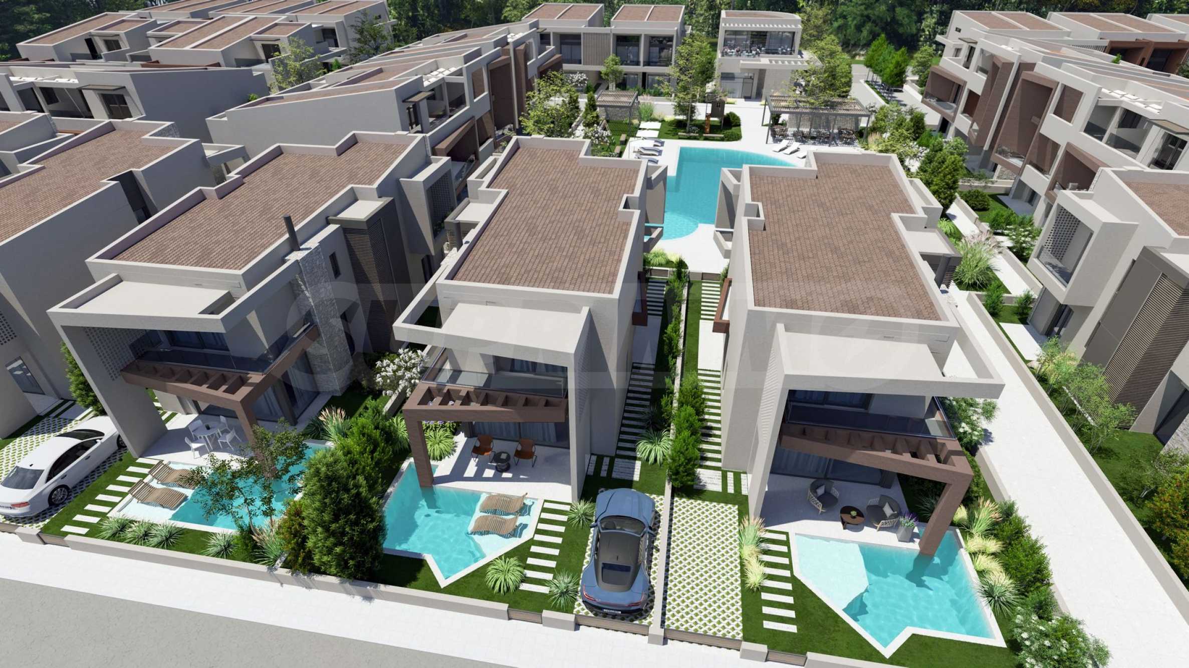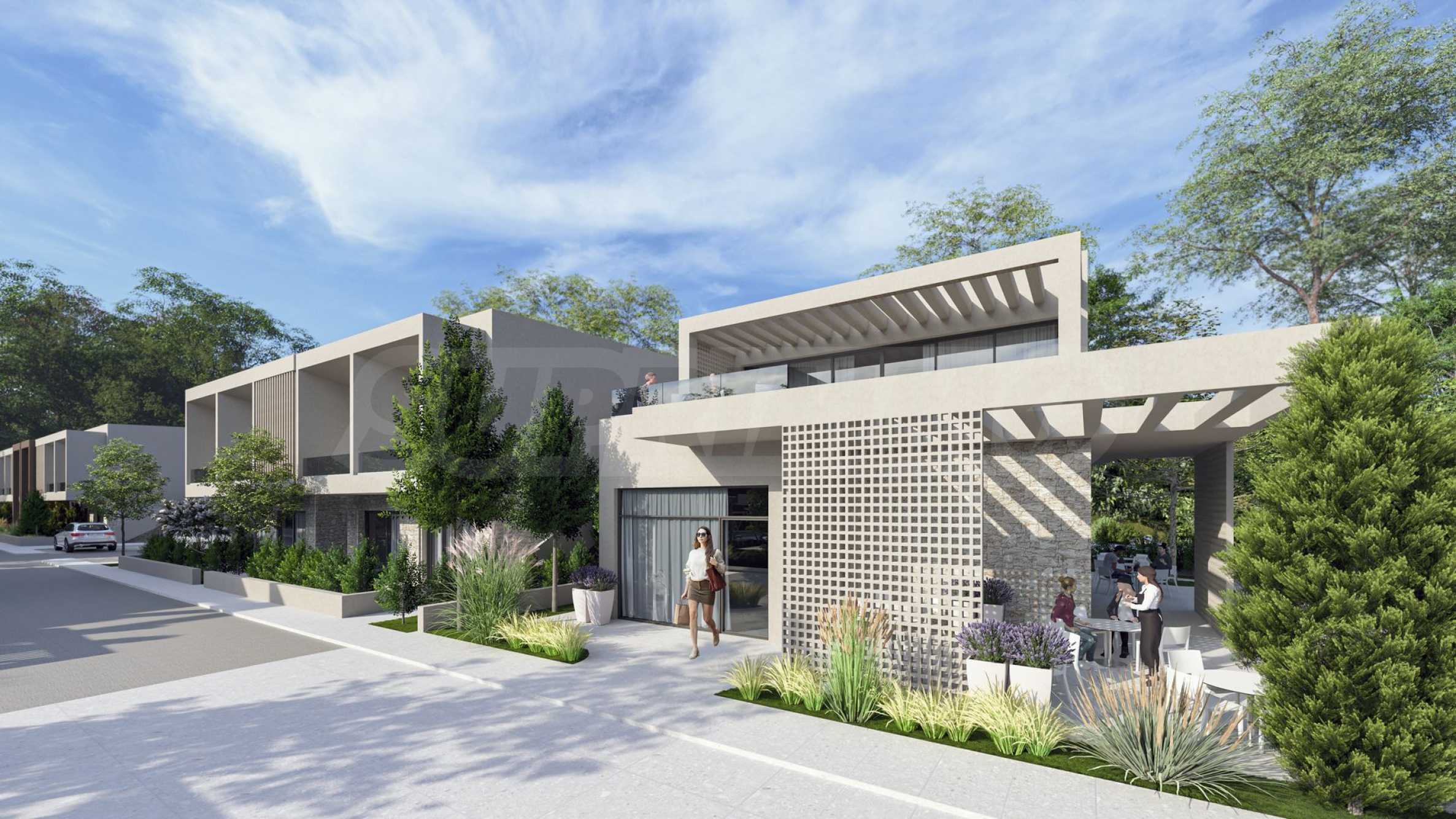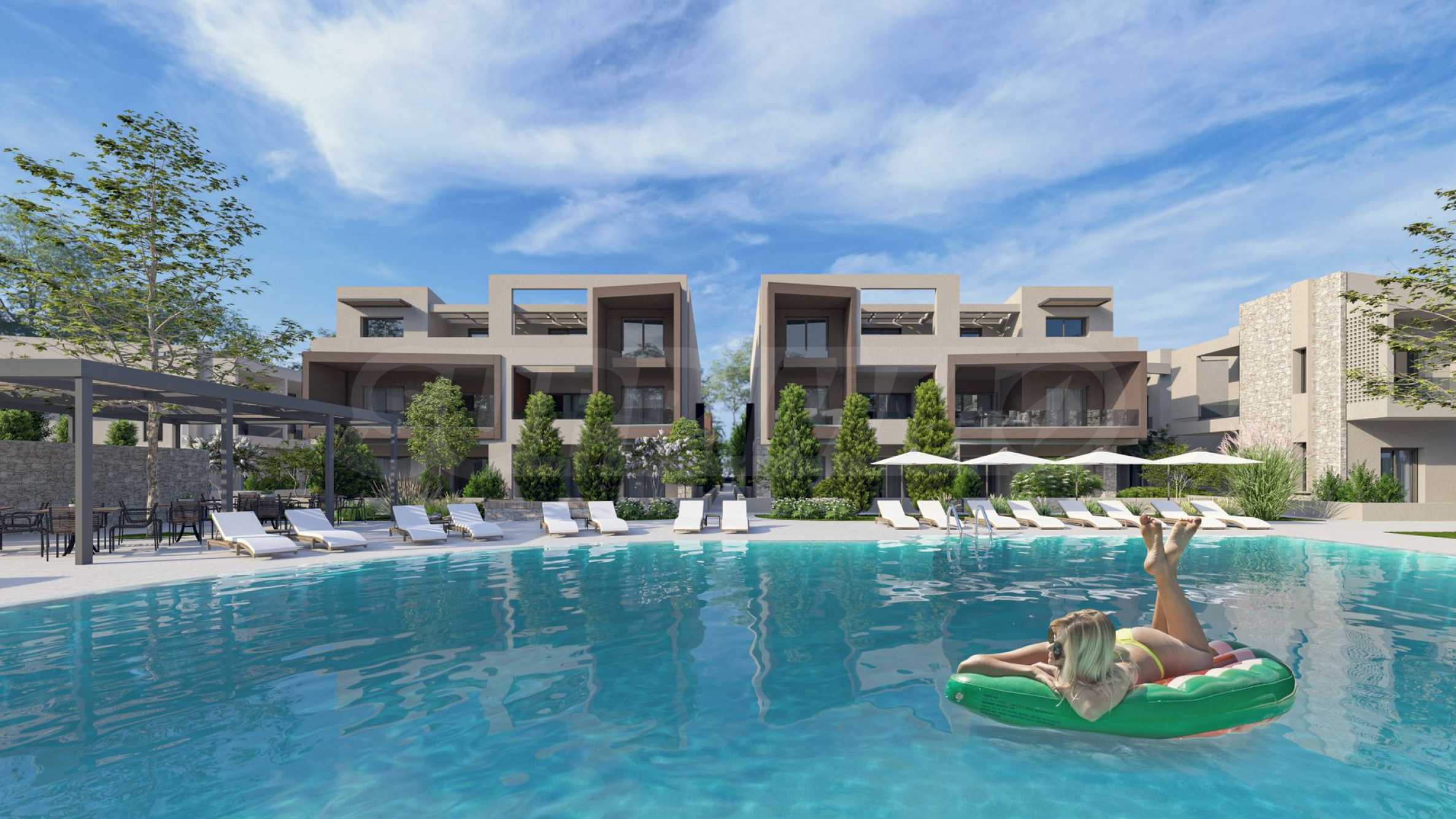 The development is built using carefully selected, high-quality materials, including large windows and glazed terraces – hallmark features of modern architecture. The landscaped grounds are adorned with natural stone elements and lush greenery, creating a serene environment ideal for relaxation. A large communal outdoor swimming pool offers a refreshing escape and a social hub for residents to enjoy time with family and friends. Around the pool, you’ll find designated relaxation areas and a children’s playground where the little ones can have fun while you unwind.