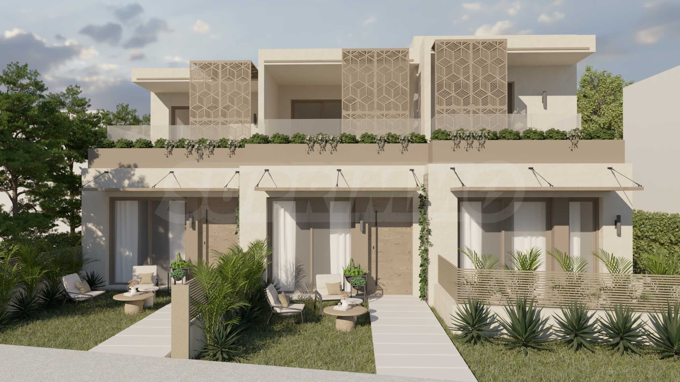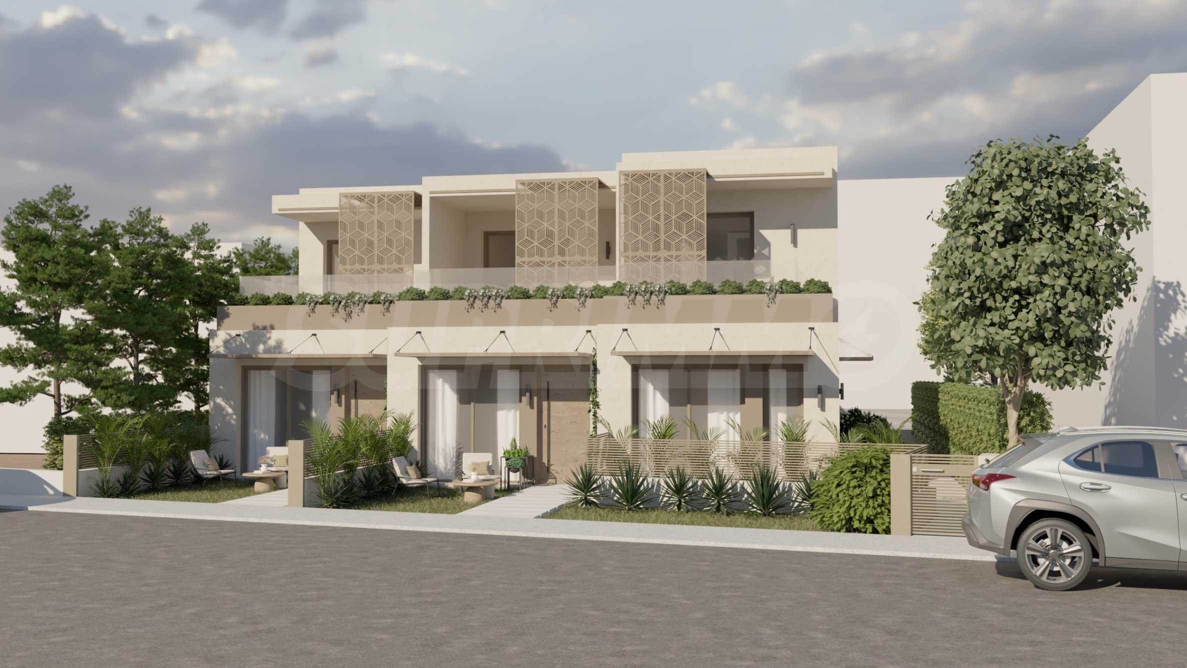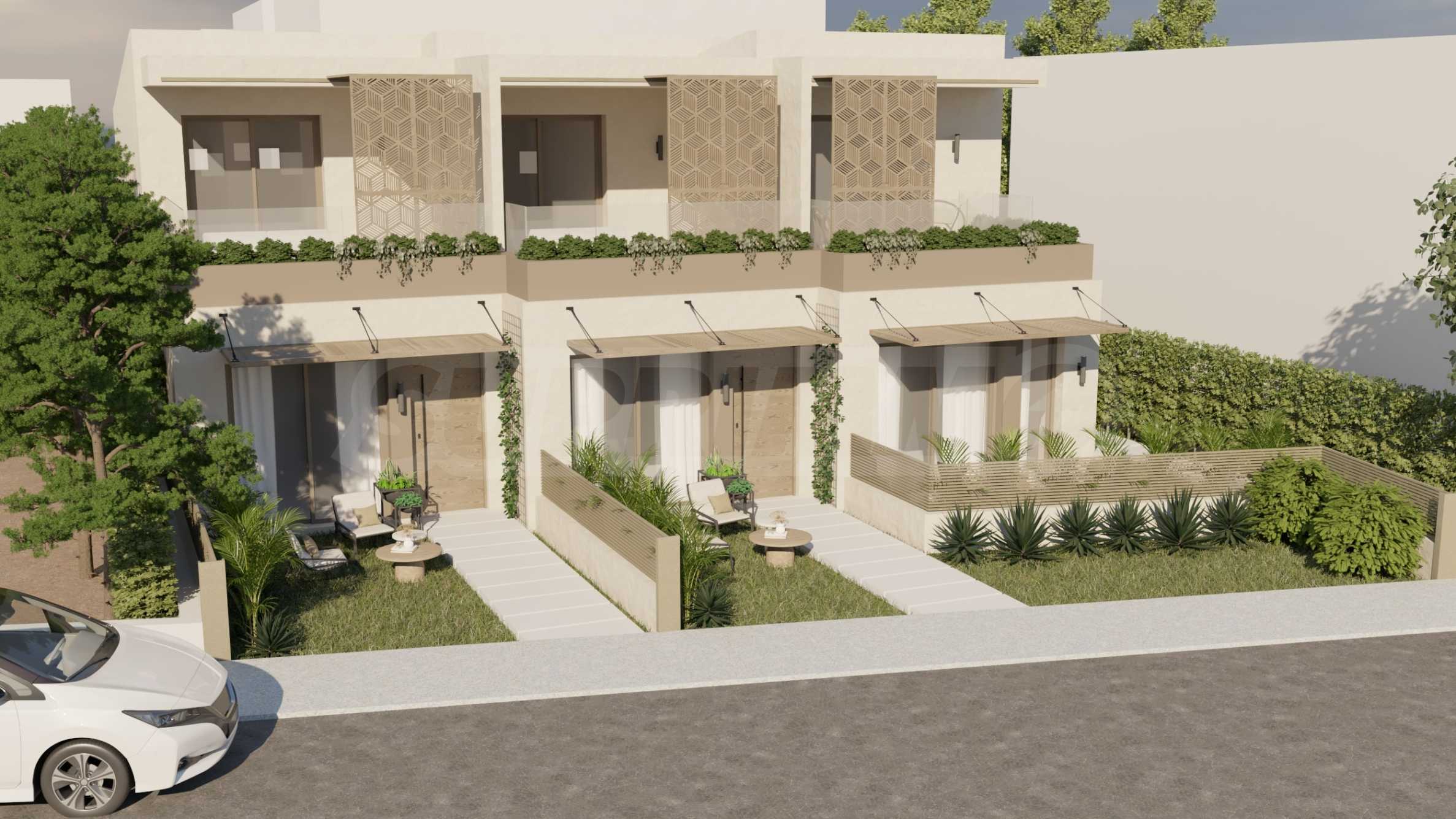 The complex consists of three stylish terraced houses, featuring clean architectural lines and carefully selected façade details. Aluminium decorative elements add a touch of modern elegance and enhance the contemporary look of the buildings. The spacious garden is beautifully landscaped with green areas and peaceful corners – an inviting setting for relaxed afternoons and cosy evenings outdoors.