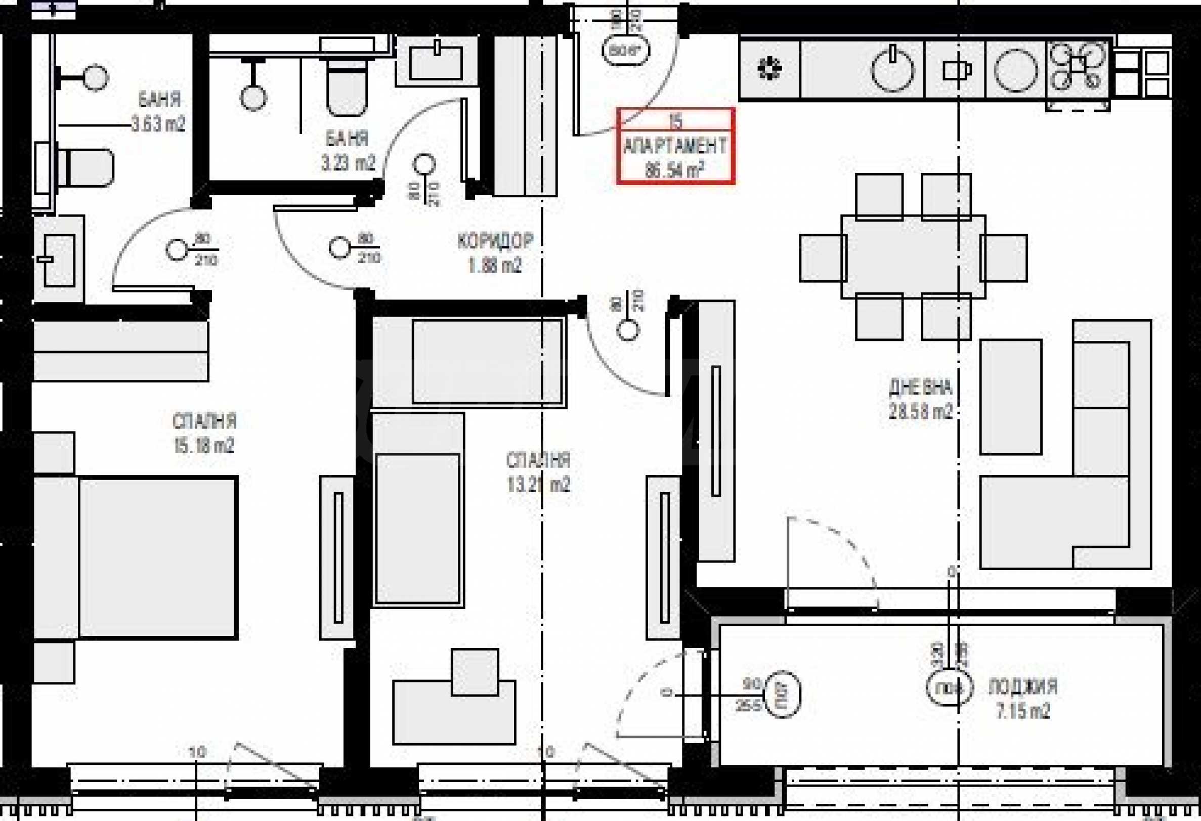 Apartment No. 15 is located on the 3rd floor, facing south and with a total area of 100.75 m2.