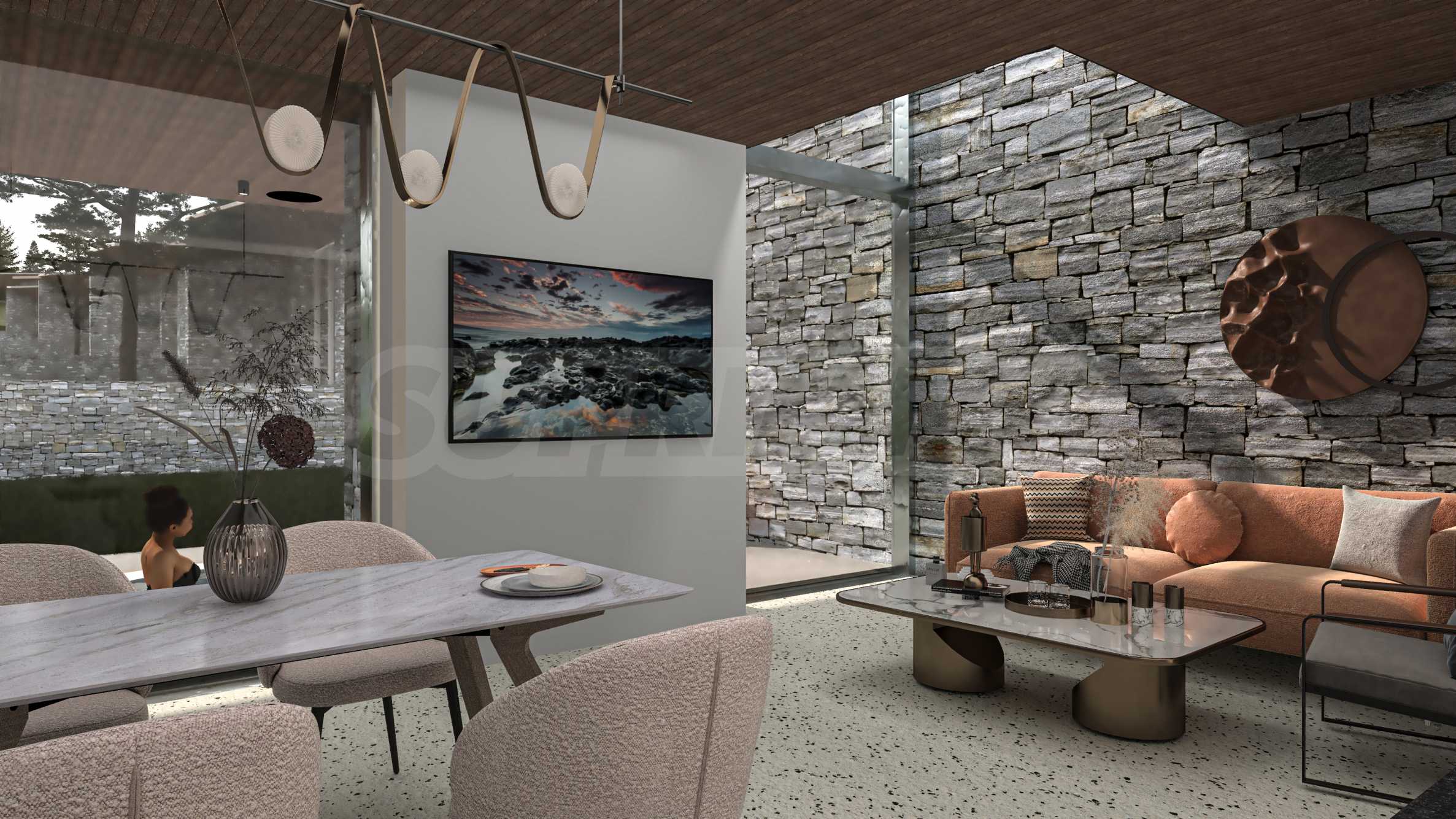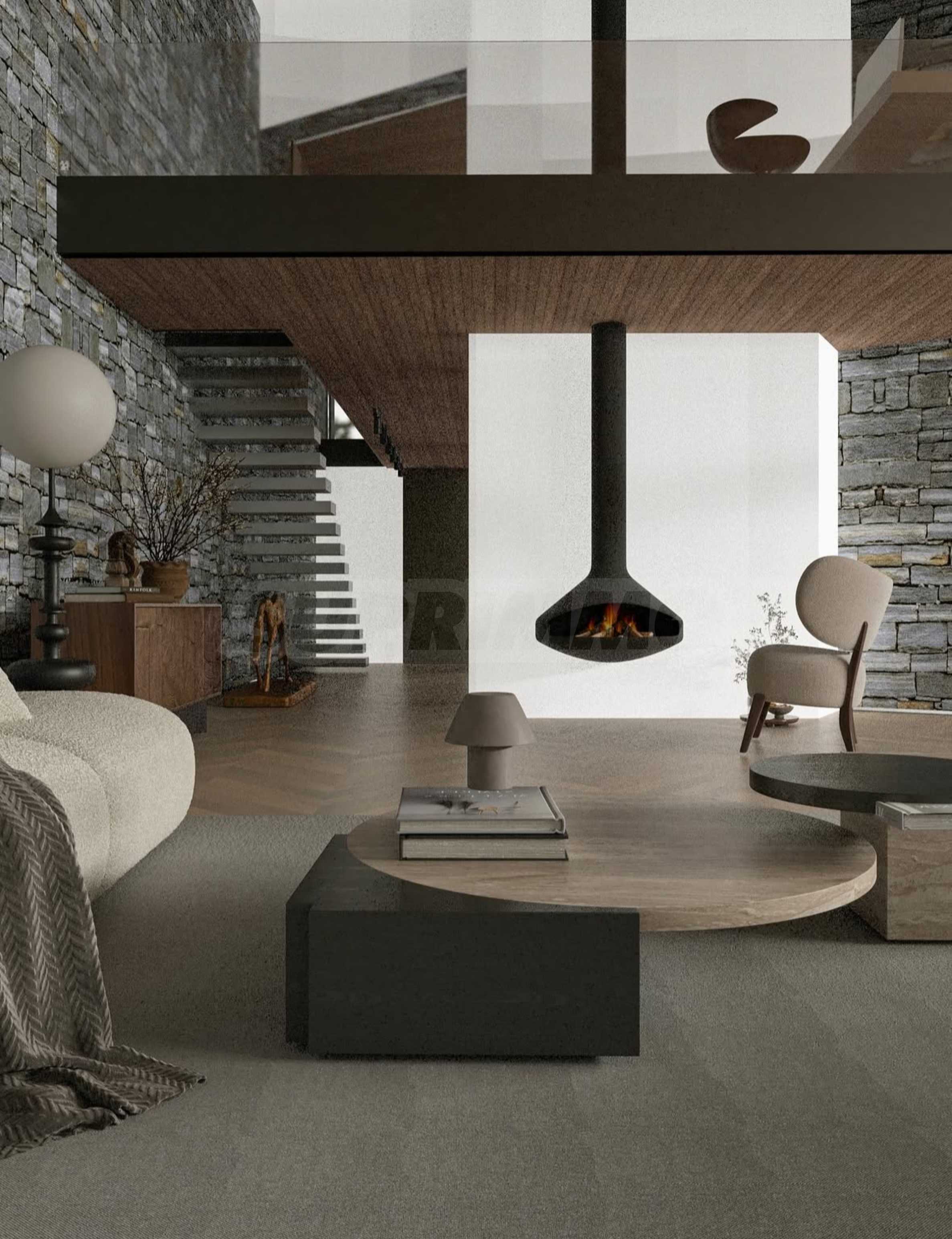 Construction and materials: monolithic building with reinforced concrete structure, enclosing and internal walls: Porotherm Light ceramic bricks, roof with visible wooden structure and 20 cm of thermal insulation, stone cladding and wooden cladding on facades - style combined with nature, aluminum joinery Aliplast Genesis 75 with triple glazing and increased tightness, entrance door with electronic lock - contactless cards + Bluetooth control.