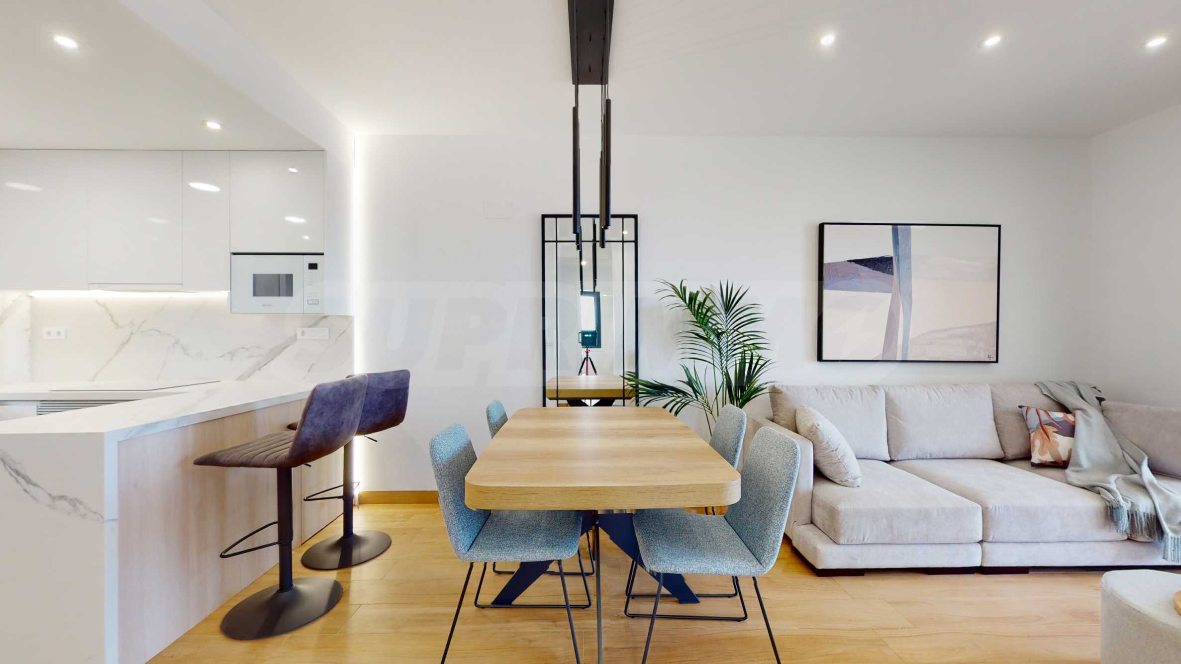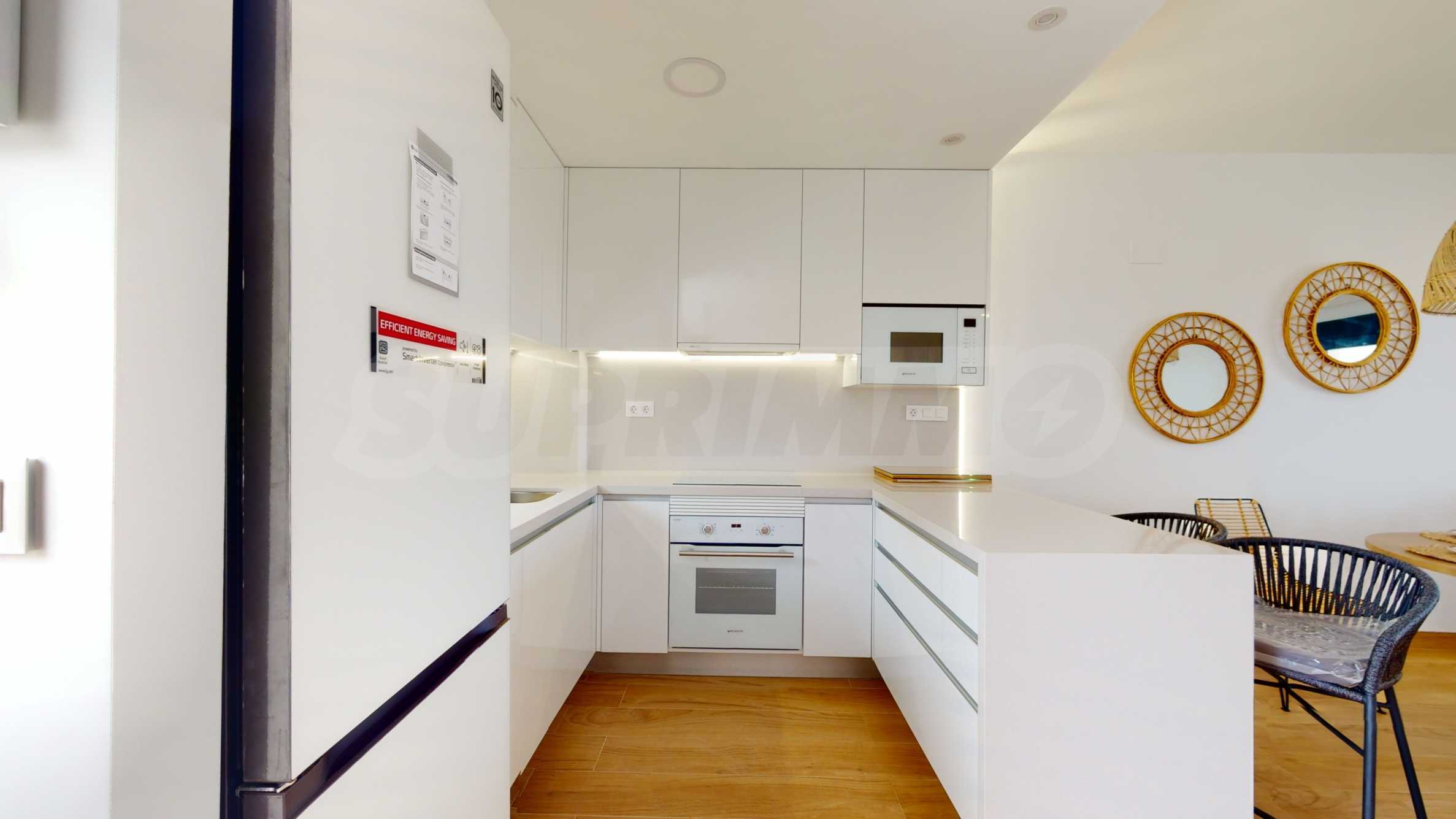 Kitchens are fully fitted with custom cabinetry with hidden handles, porcelain countertops, and stainless steel under-mounted sinks. Appliances are provided by a trusted premium brand.
