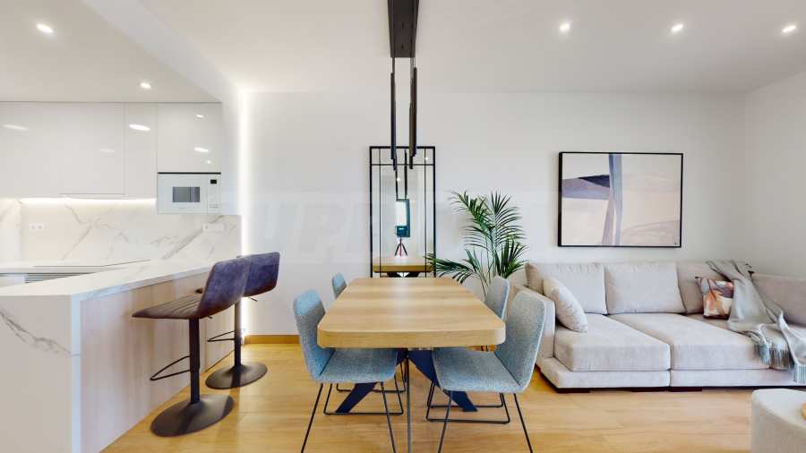 Flooring is finished with wood-effect porcelain tiles, and walls are painted with white latex paint. Outdoor areas feature non-slip porcelain tiles in the same colour palette, ensuring a seamless and cohesive aesthetic throughout the home.