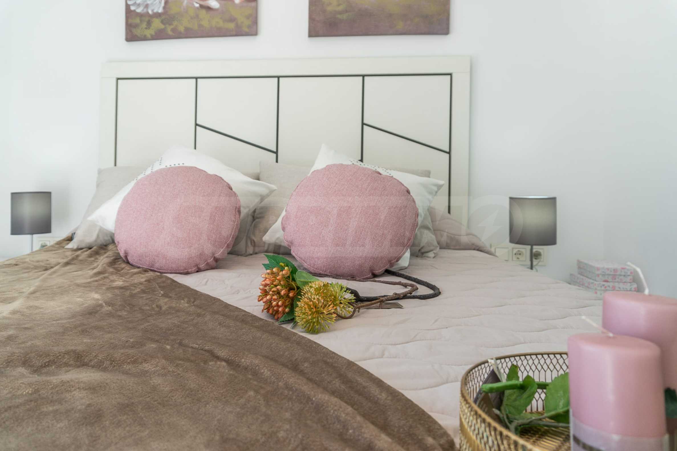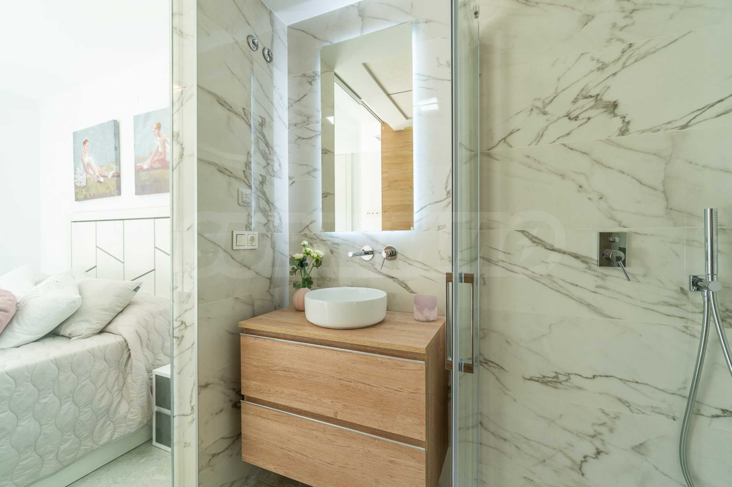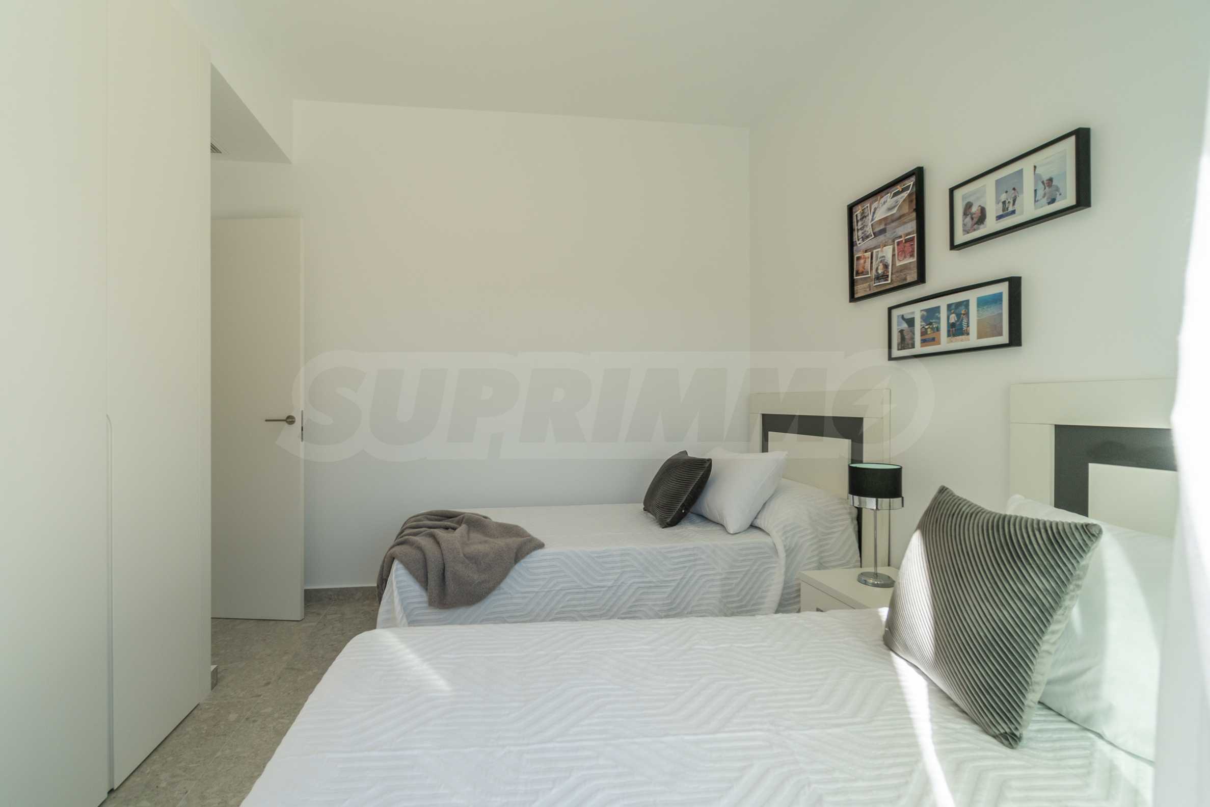 The architecture stands out with its elegant simplicity – white façades, clean lines, and large windows that flood the interiors with natural light. Pergolas on the rooftop levels add an extra touch of charm, while the lush landscaping and well-maintained walkways create a sense of harmony. At the heart of the complex, spacious swimming pools with attractive sunbathing areas and decorative elements form a stylish and inviting communal space.