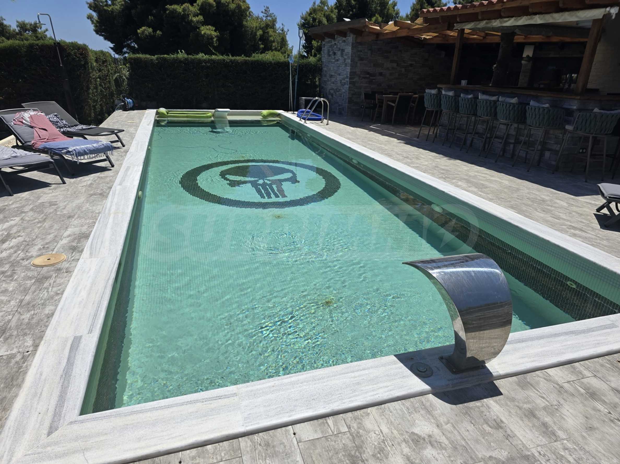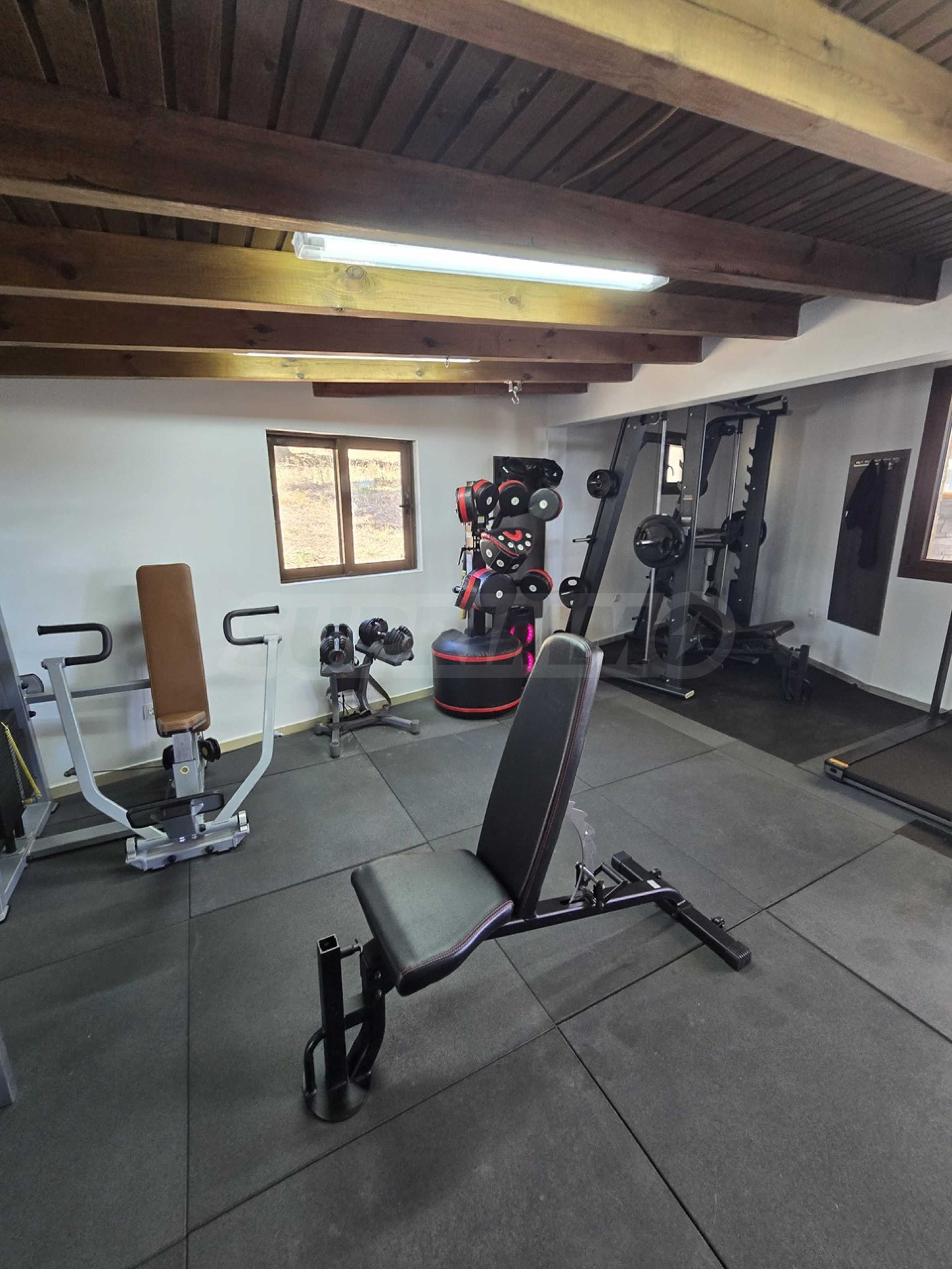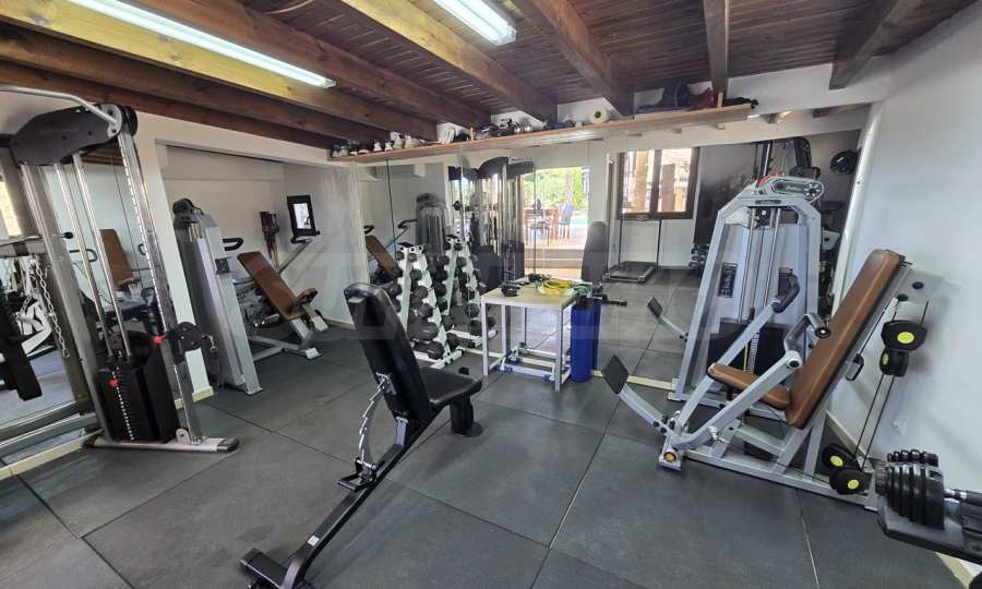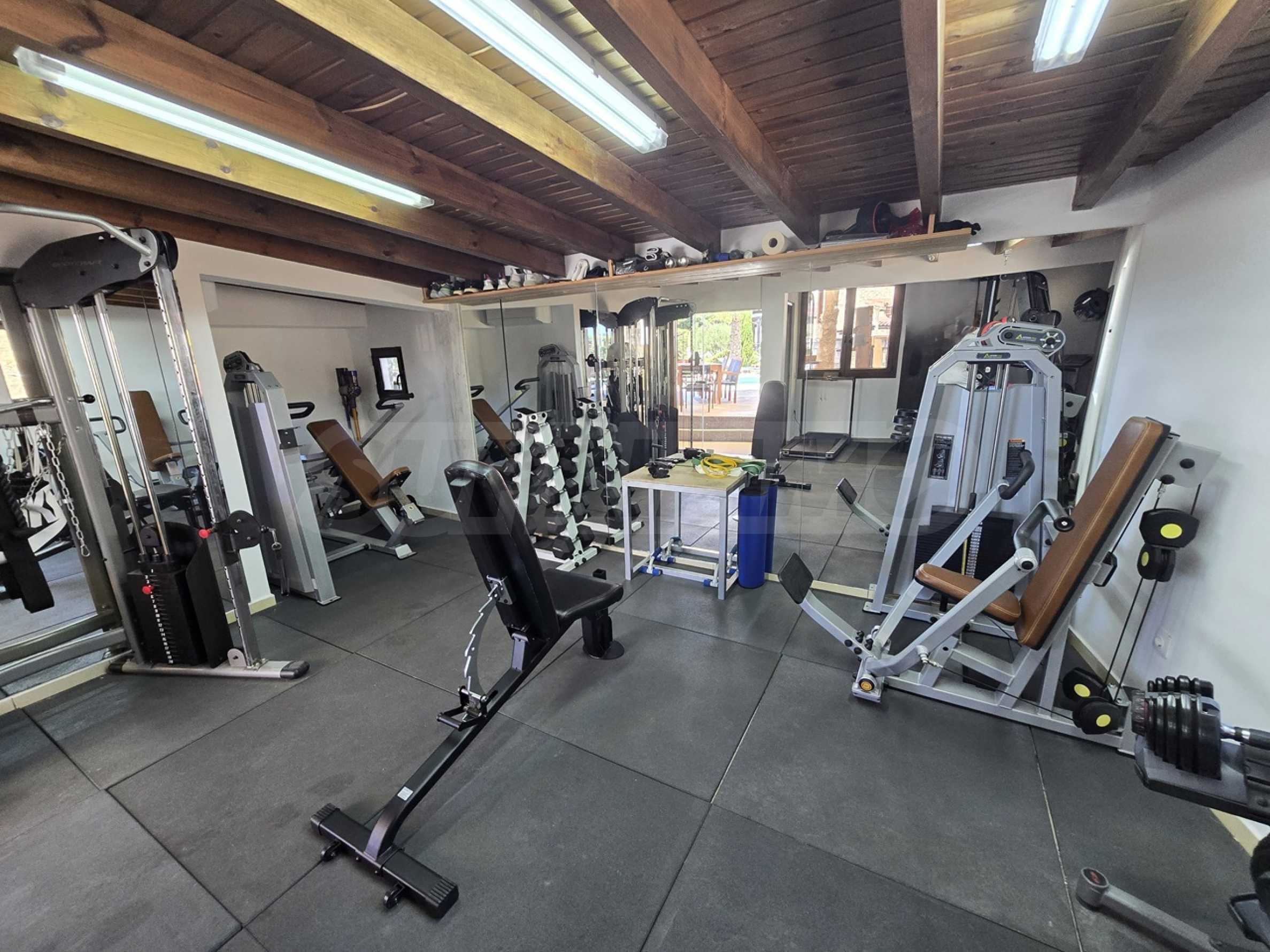 Swimming pool, gym and bar.