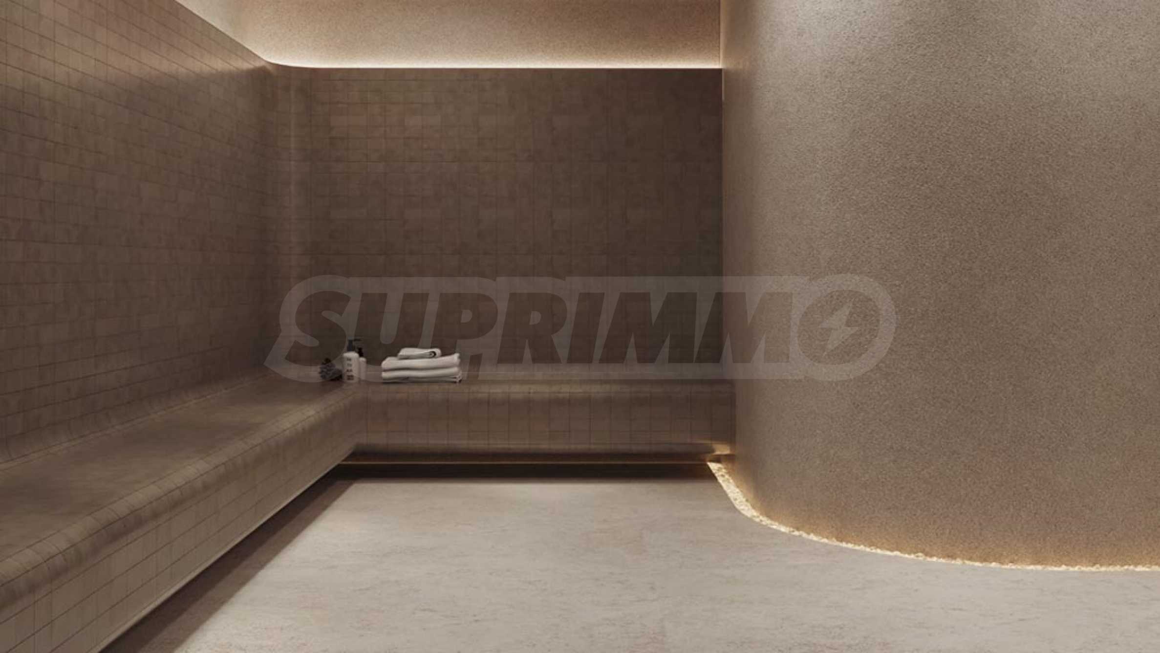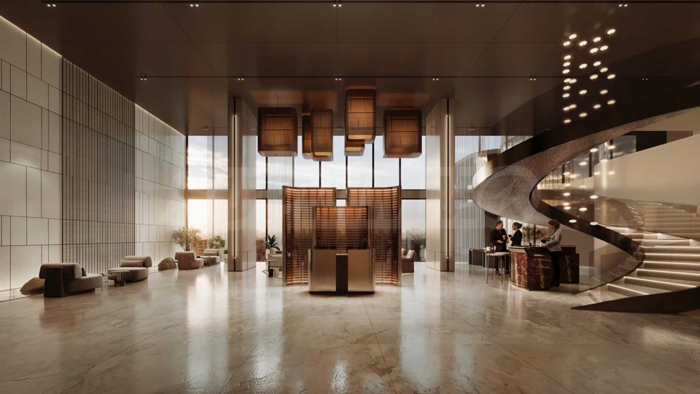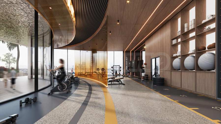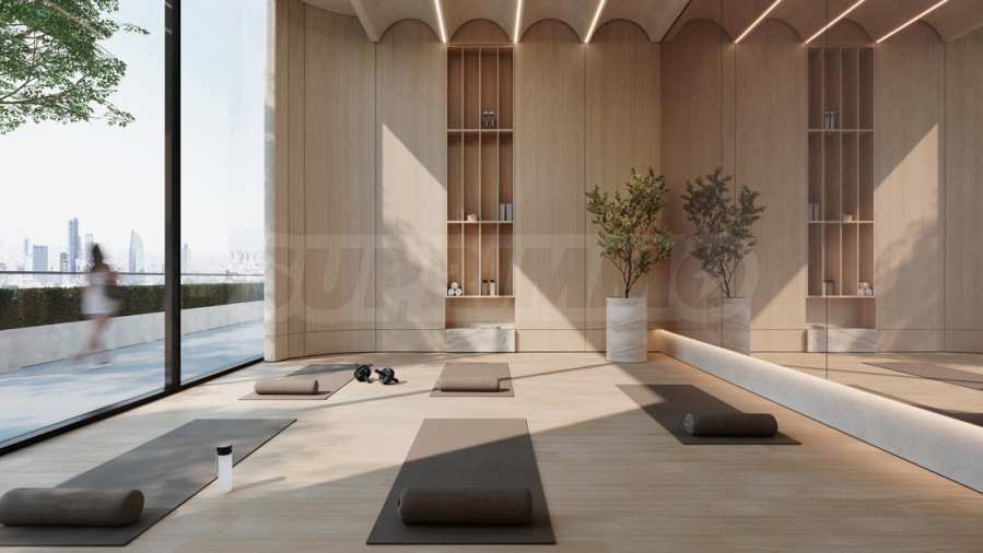 Beyond its striking façade, adorned with golden elements and glass, the building stands out with an exceptionally spacious lobby, featuring lounge areas for relaxing or meeting with friends and neighbors. Residents will also enjoy a large outdoor swimming pool, a gym with a dedicated yoga area – the perfect place for training and recharging – as well as a spa zone designed for relaxation. The lush landscaped gardens of the development provide the ideal setting for both leisurely walks and jogging.