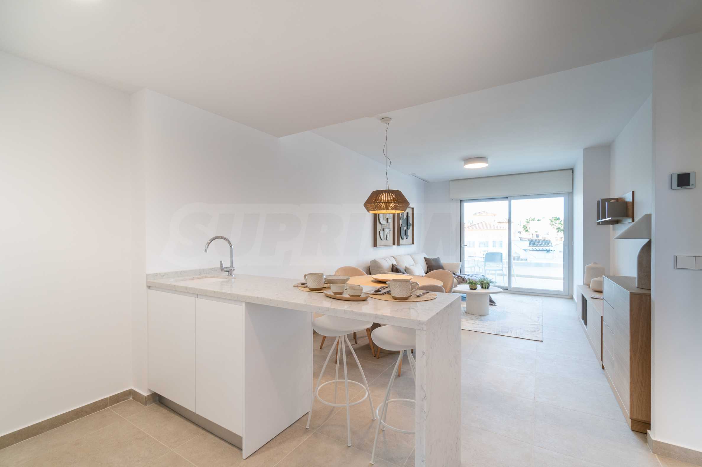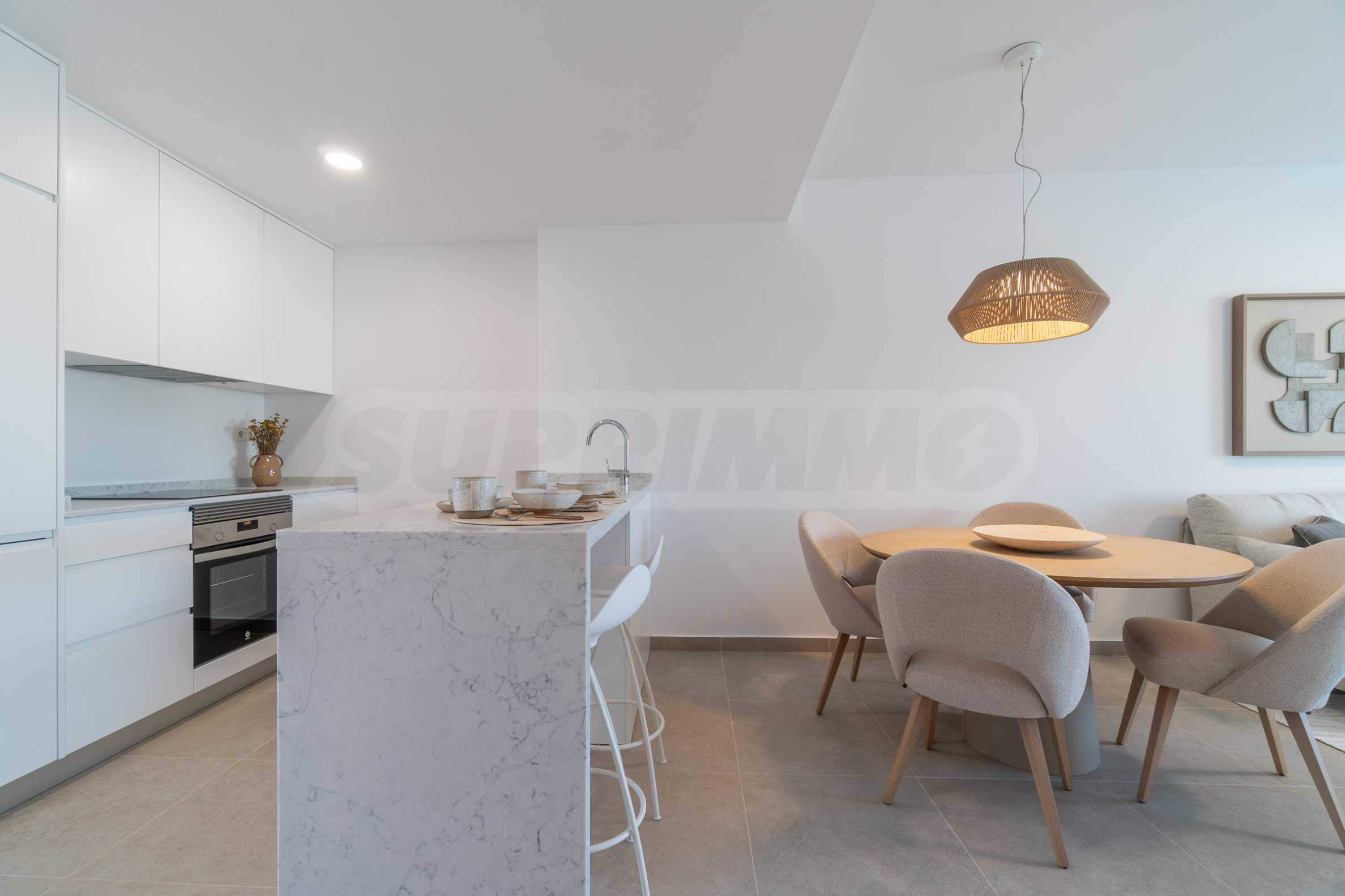 Every home includes a fully fitted kitchen with an island and upper cabinets, ready to be equipped with appliances. The countertops are made of top-quality quartz composite such as Compac, Silestone, or similar, combining elegance with lasting durability.