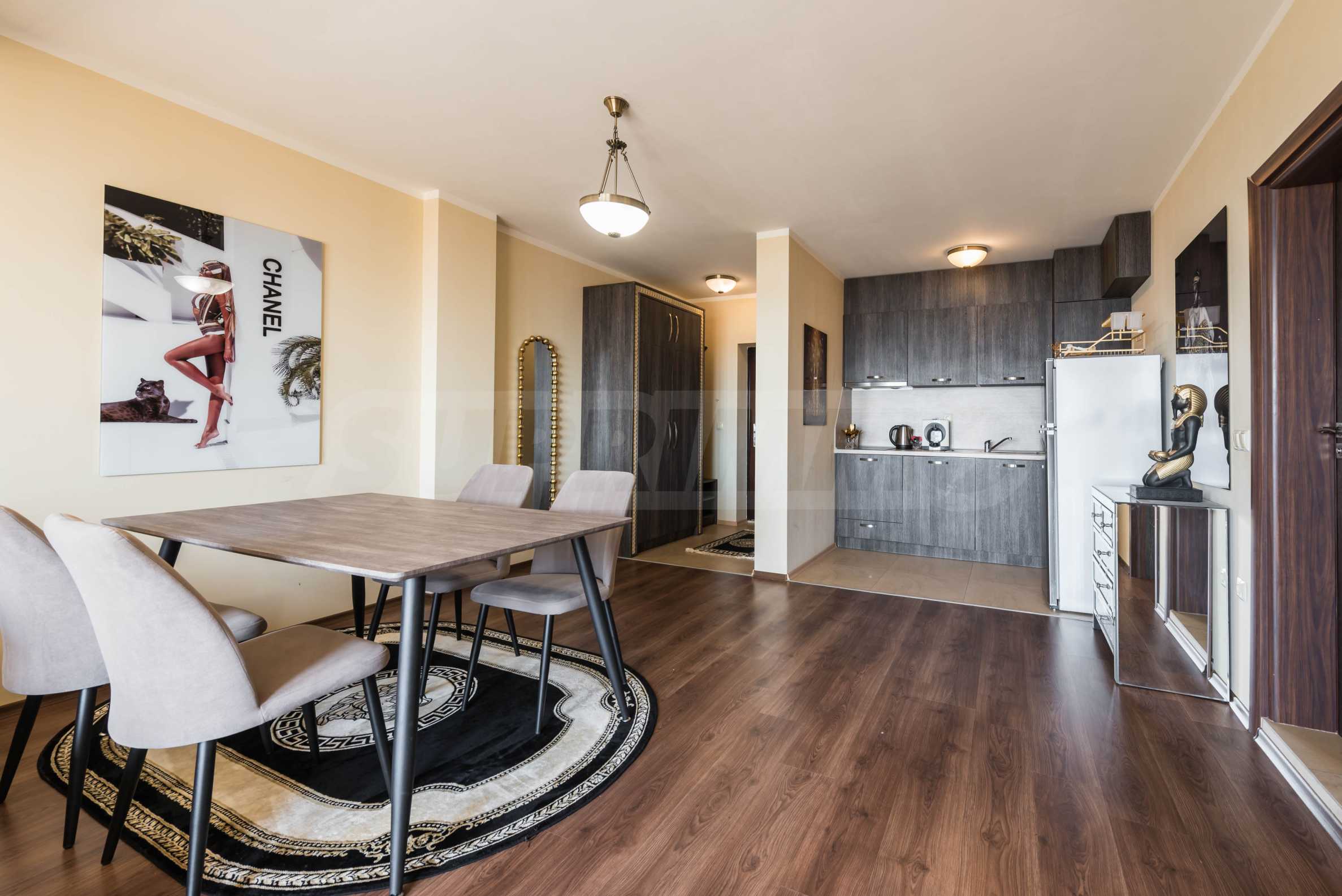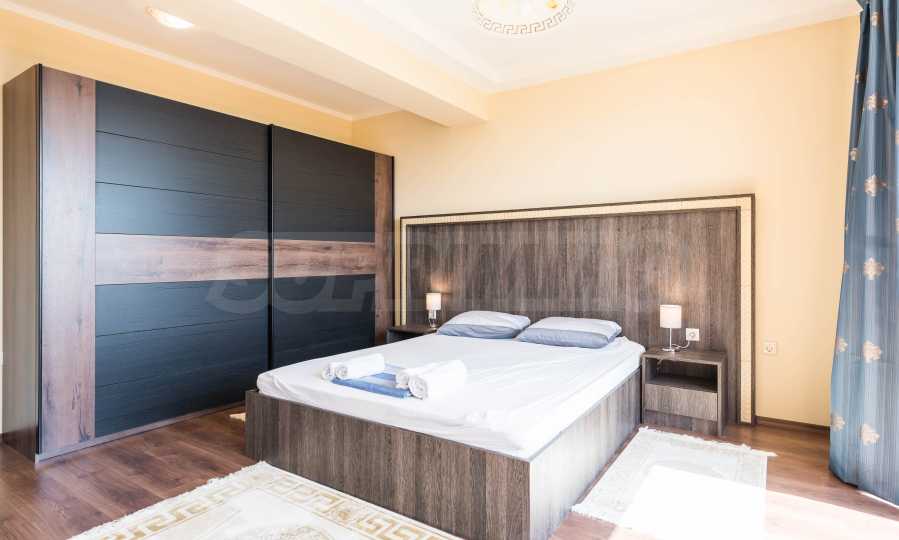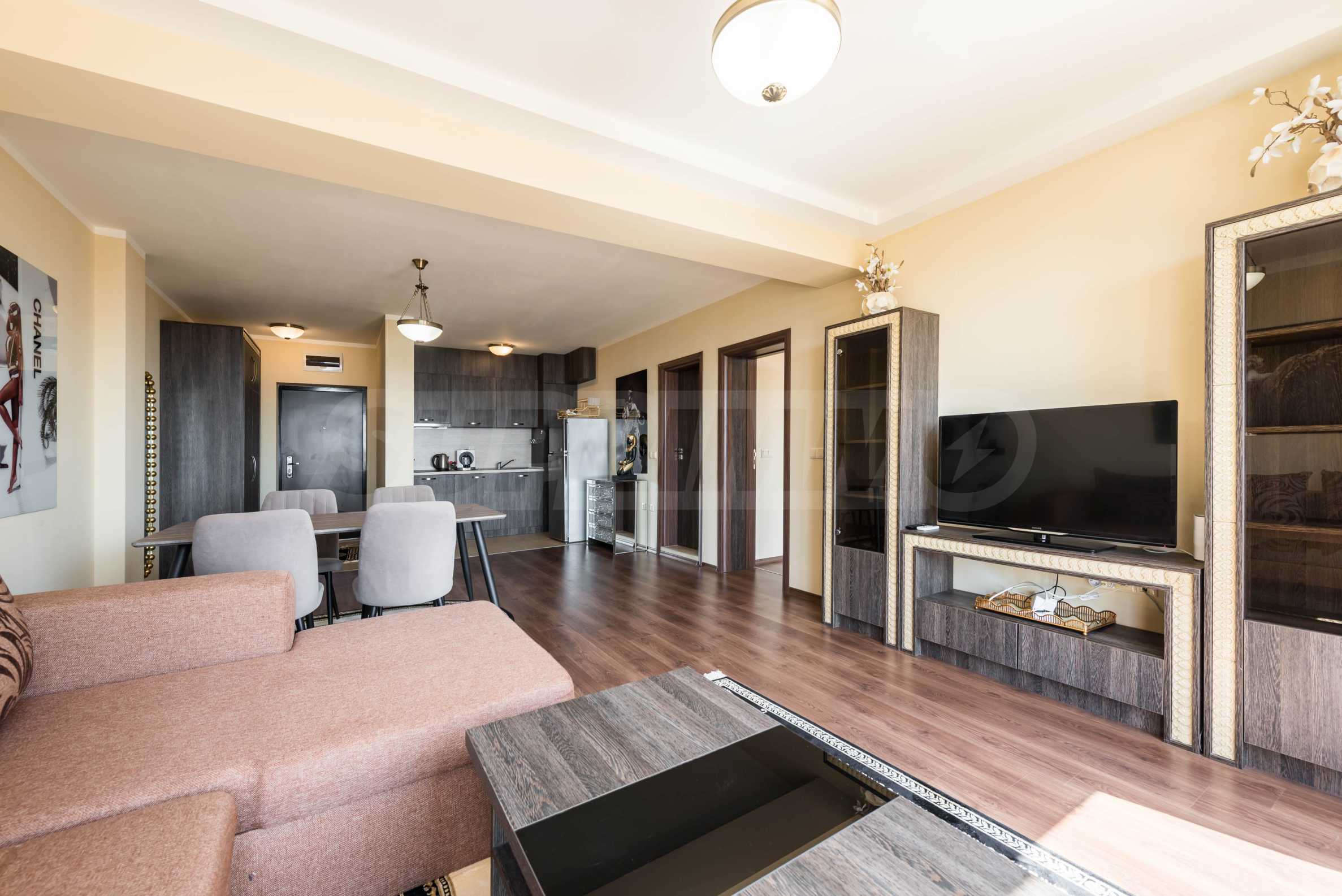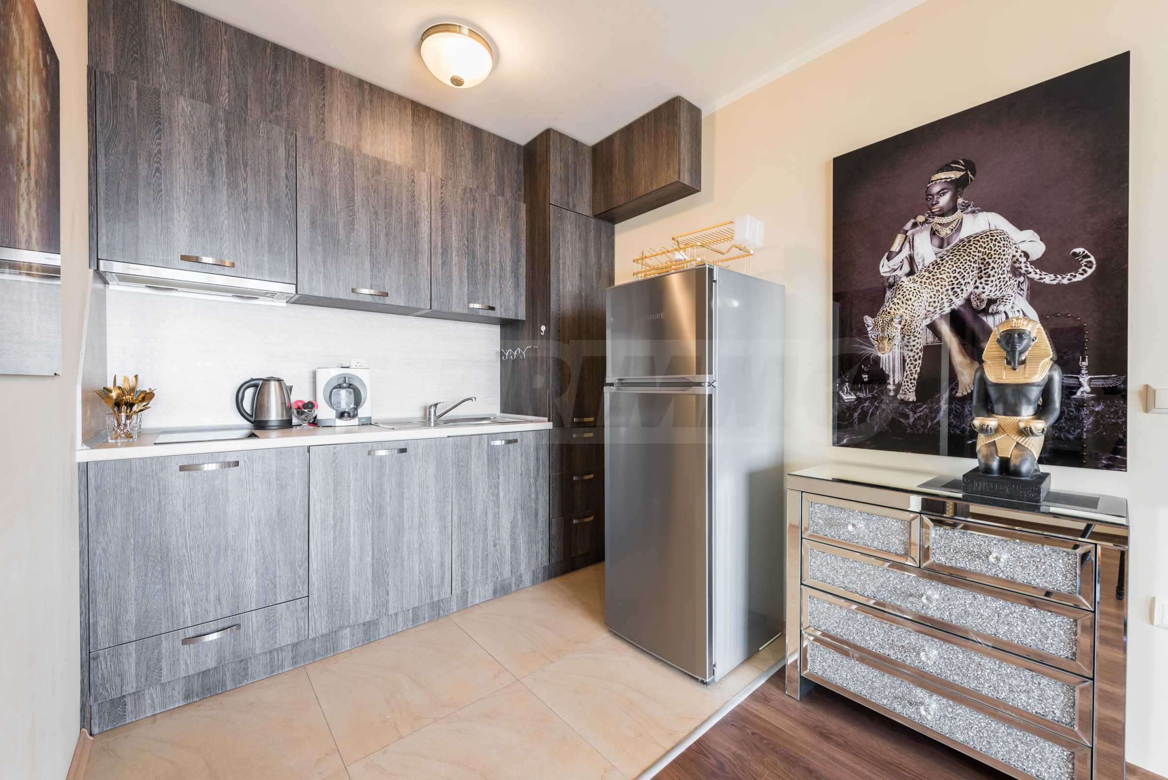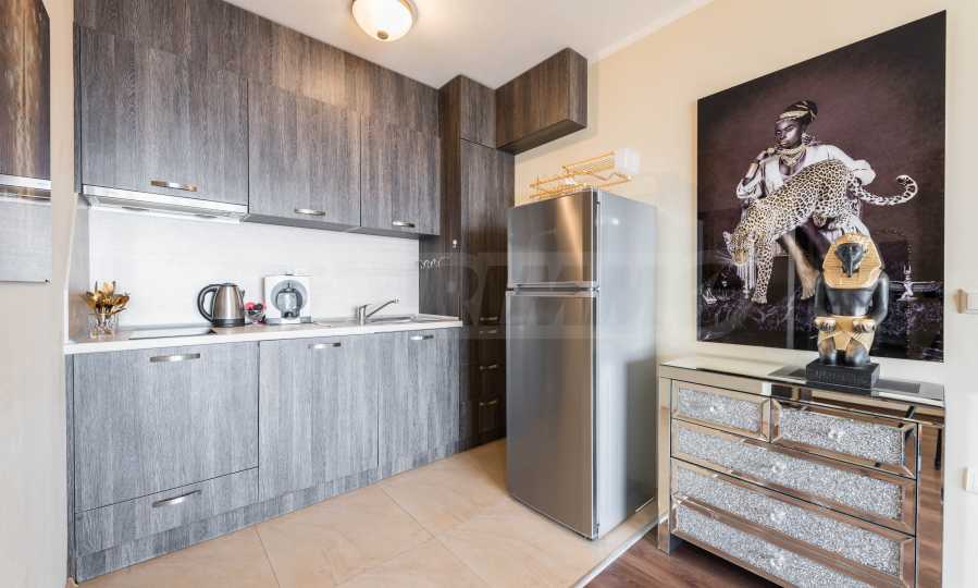 The apartment is furnished with attention to detail and a high standard of quality and comfort. The furniture is functional and stylish. The bathroom is equipped with a shower cabin, washbasin, toilet and bidet. The kitchen and the living room are fully equipped. Each room is air-conditioned.