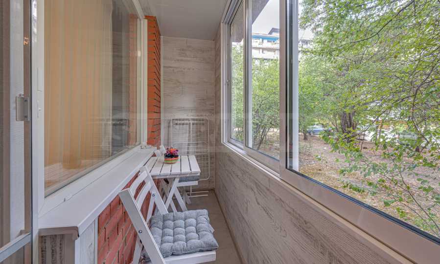 The functional layout includes a spacious living room with kitchenette, a transitional bedroom, a second separate bedroom, a bathroom with toilet, a laundry room, a corridor and a glazed terrace with access from the living room. The apartment is fully furnished and equipped, ready to move in.