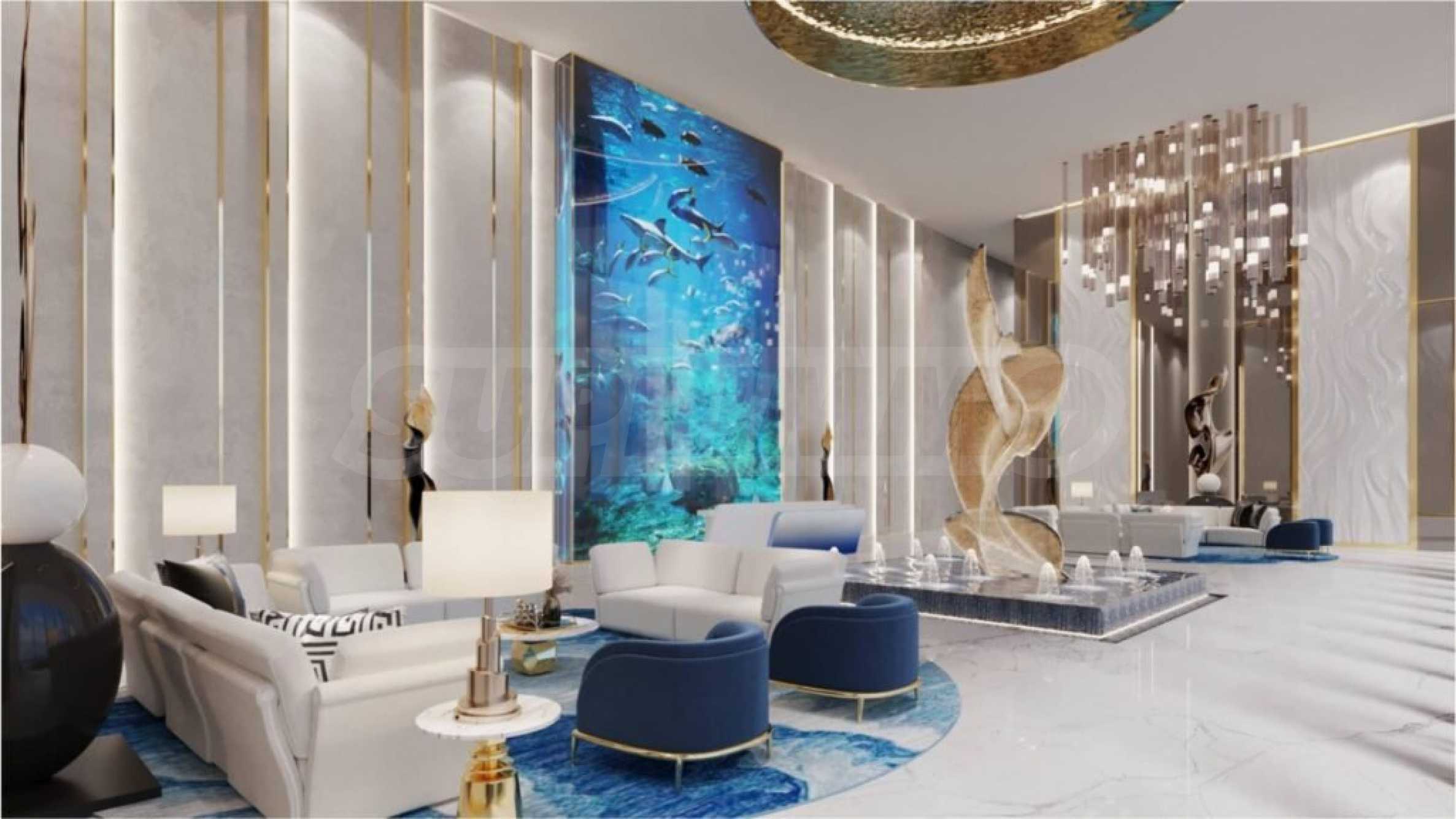 From the moment you step into the lobby, you are immersed in an atmosphere of uncompromising luxury. The soaring double-height ceilings create a sense of endless space, while a cascading water installation flowing into the central fountain evokes the calming essence of the sea. The reception desk resembles a sculptural masterpiece, lighting fixtures recall modern art installations, and serene lounge areas invite you to relax or socialize. The undeniable highlight, however, is the impressive 140 sqm aquarium reaching nearly 6 meters in height – a living masterpiece that adds a distinctive character to the space.