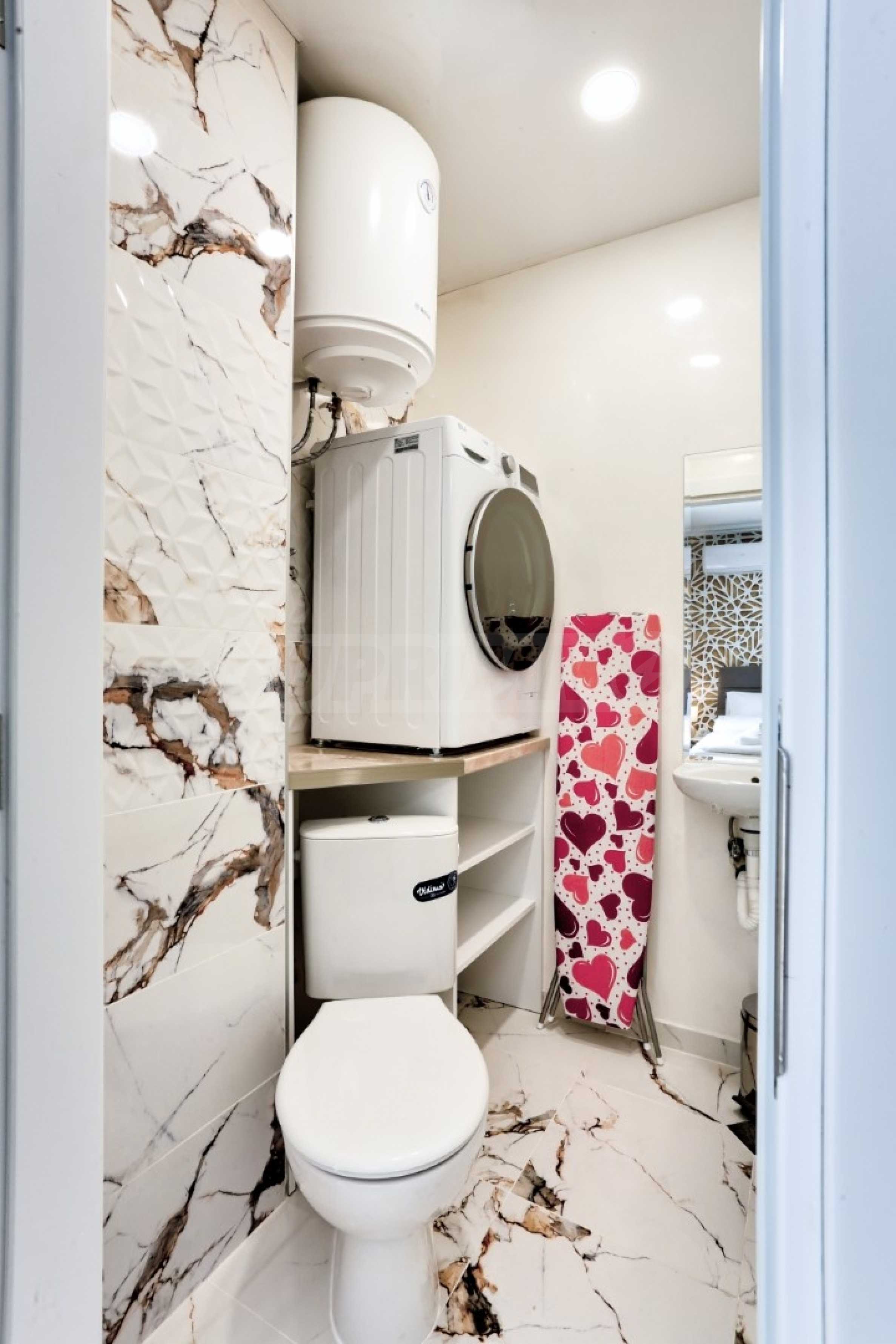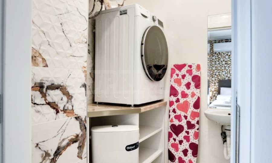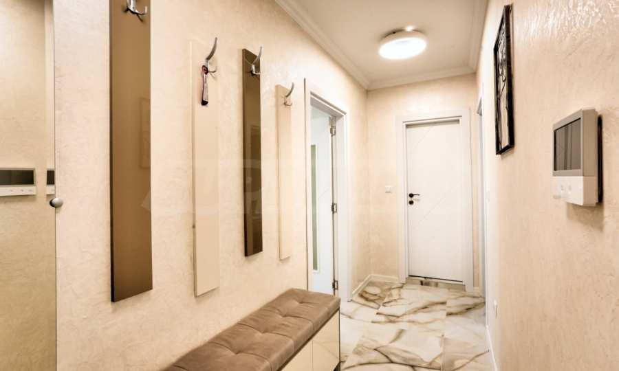 The apartment is luxuriously furnished and equipped with everything necessary for living - built-in washing machine, stove and large refrigerator, TV, water heater, etc. The interior is decorated in light tones, with modern furniture and appliances, and all rooms have air conditioners installed.