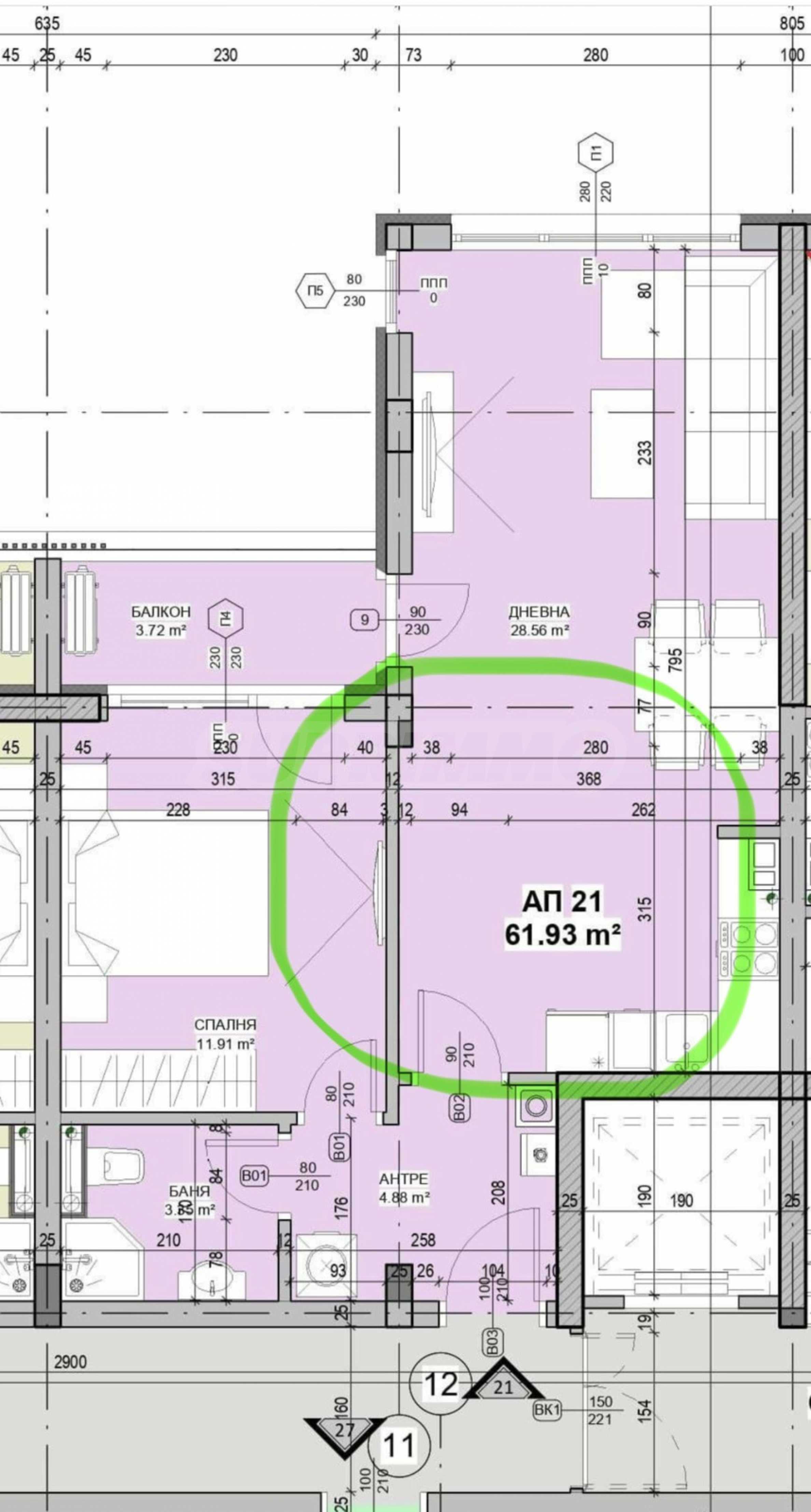The apartment has the option to purchase an underground parking space at a price of 39,000 euros (76,277.37 BGN) and a storage room at a price of 5,000 euros (9,779.15 BGN).