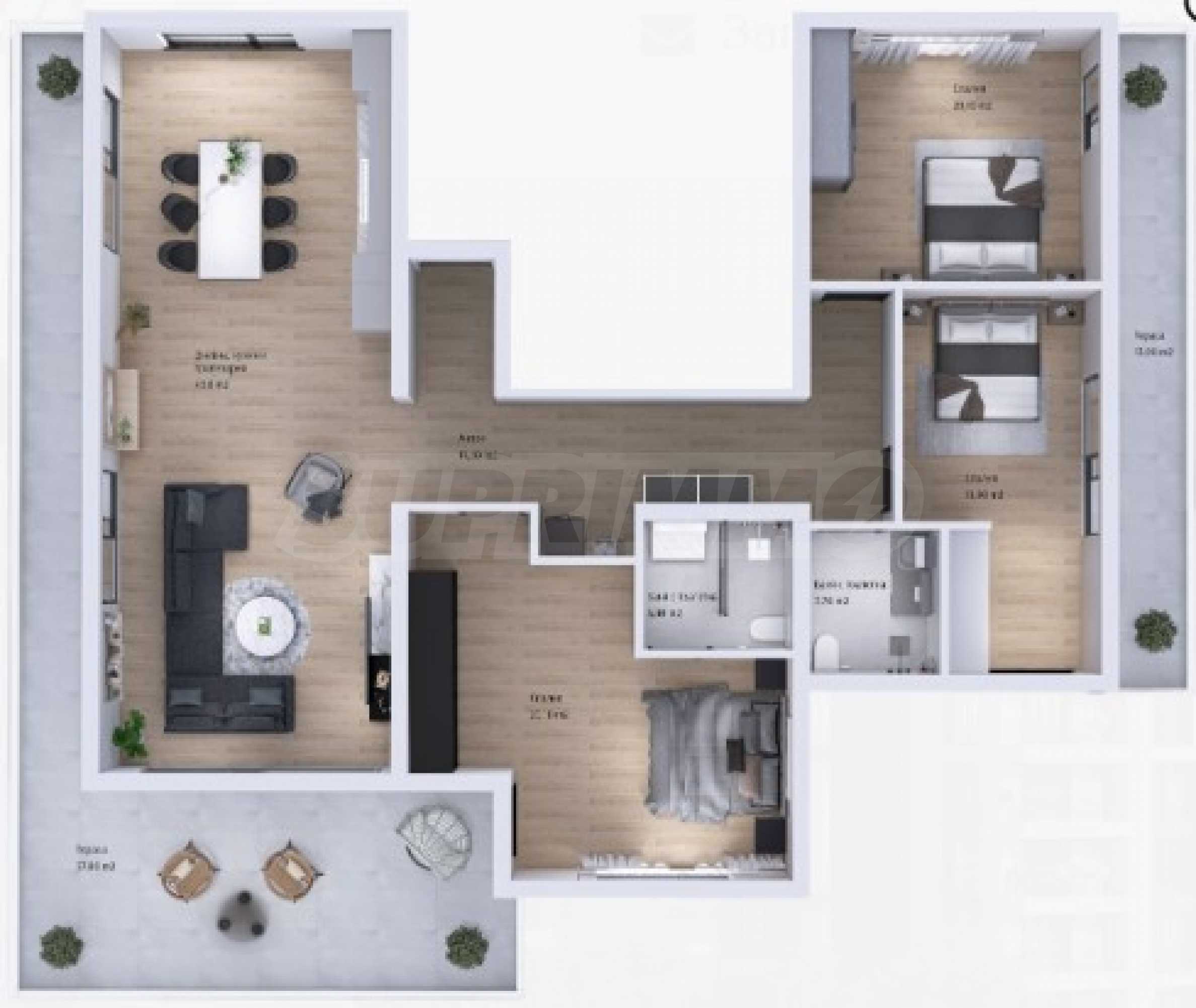 We present a four-bedroom apartment in a modern gated complex of high-class new construction, in a park environment in the "Kamenitsa 2" district. The buildings are located in close proximity to Mall Plaza, with direct pedestrian access between the complex and the shopping center. This provides convenient access to shops, services, restaurants and leisure areas - without the need for a car. A few minutes walk away are "Lauta" Park, a large hypermarket, as well as main road connections that connect the area with the central part of the city. The location offers practicality, good organization and easy access to everything that matters in everyday life.
