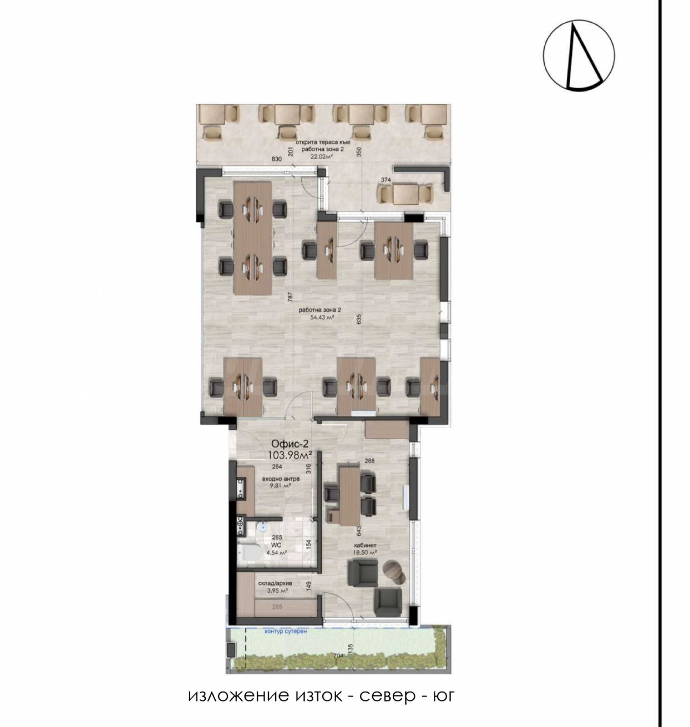 The office building has a total area of 1148.50 m2. It consists of 4 above-ground floors, the first three of which are with a standard layout. Each office has a secured bathroom, balcony/terrace and an individual entrance from the common areas of the building.