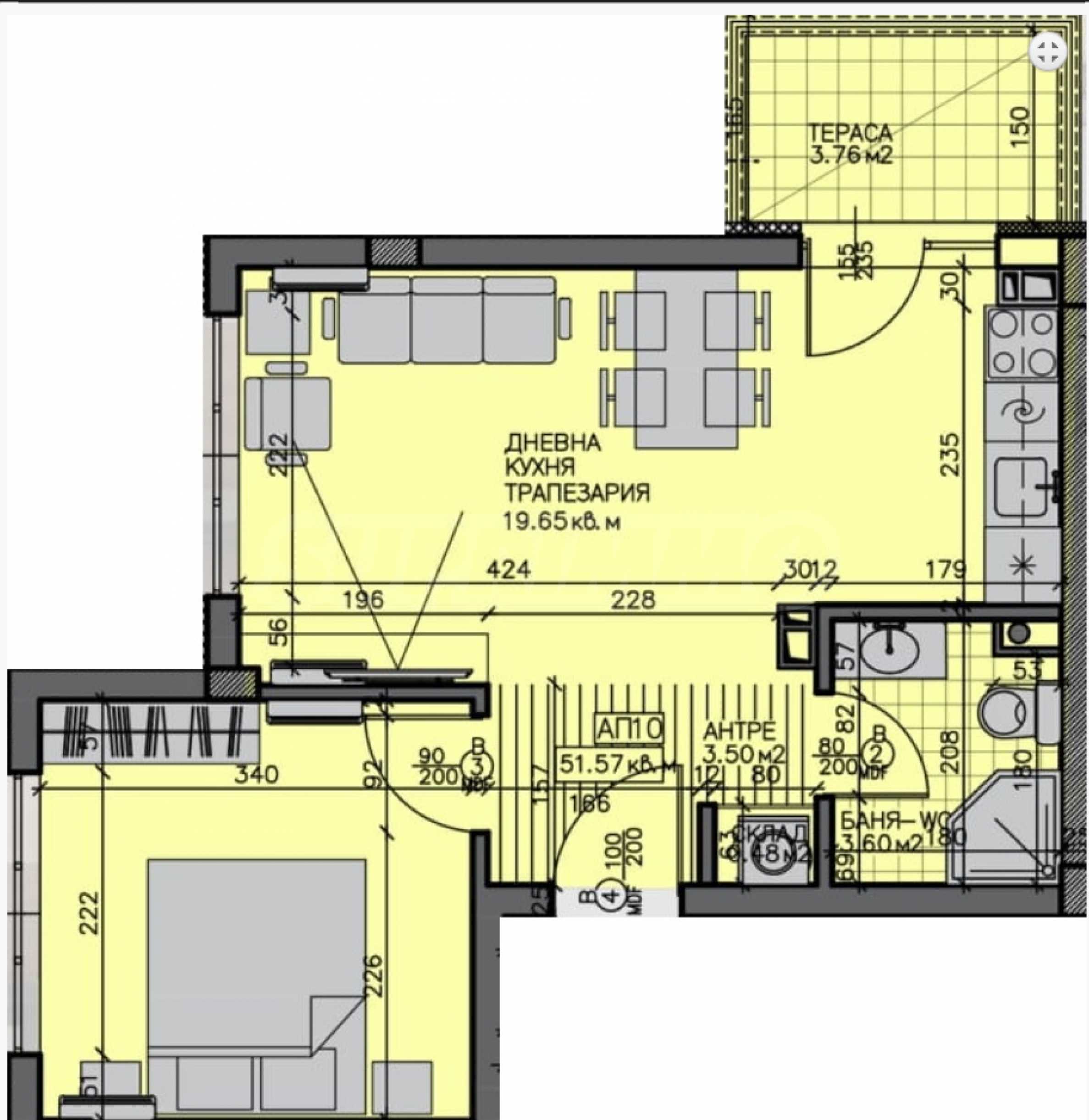 • Layout: spacious living room with kitchen and dining room, comfortable bedroom, bathroom with toilet and terrace.
