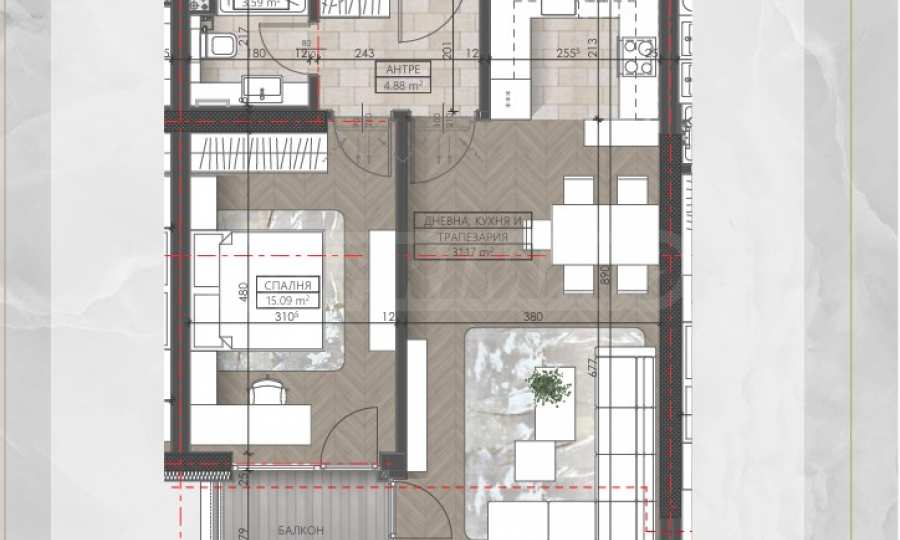 We present a one-bedroom apartment in Synerga Premium Complex, a project that combines the rhythm of the dynamic city with the coziness of green spaces. Located in the heart of the "Mladost" district and just steps from the "Alexander Malinov" metro station, right next to a picturesque park, the complex provides peace and quiet, a balance between city life and proximity to nature - a rare privilege in modern Sofia.