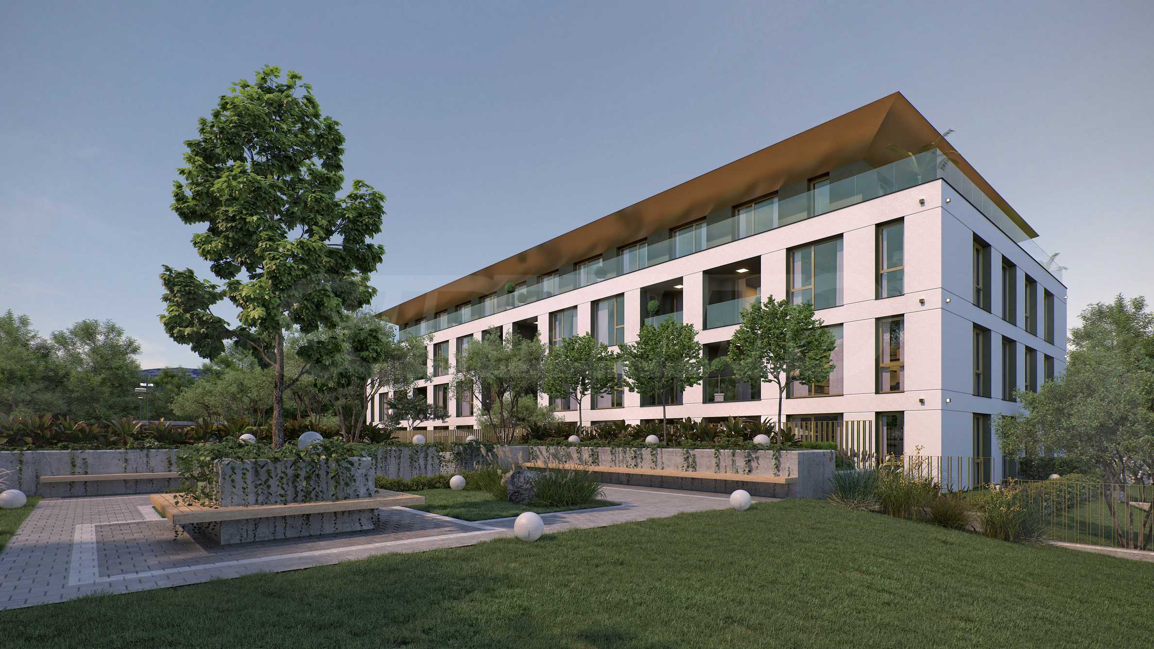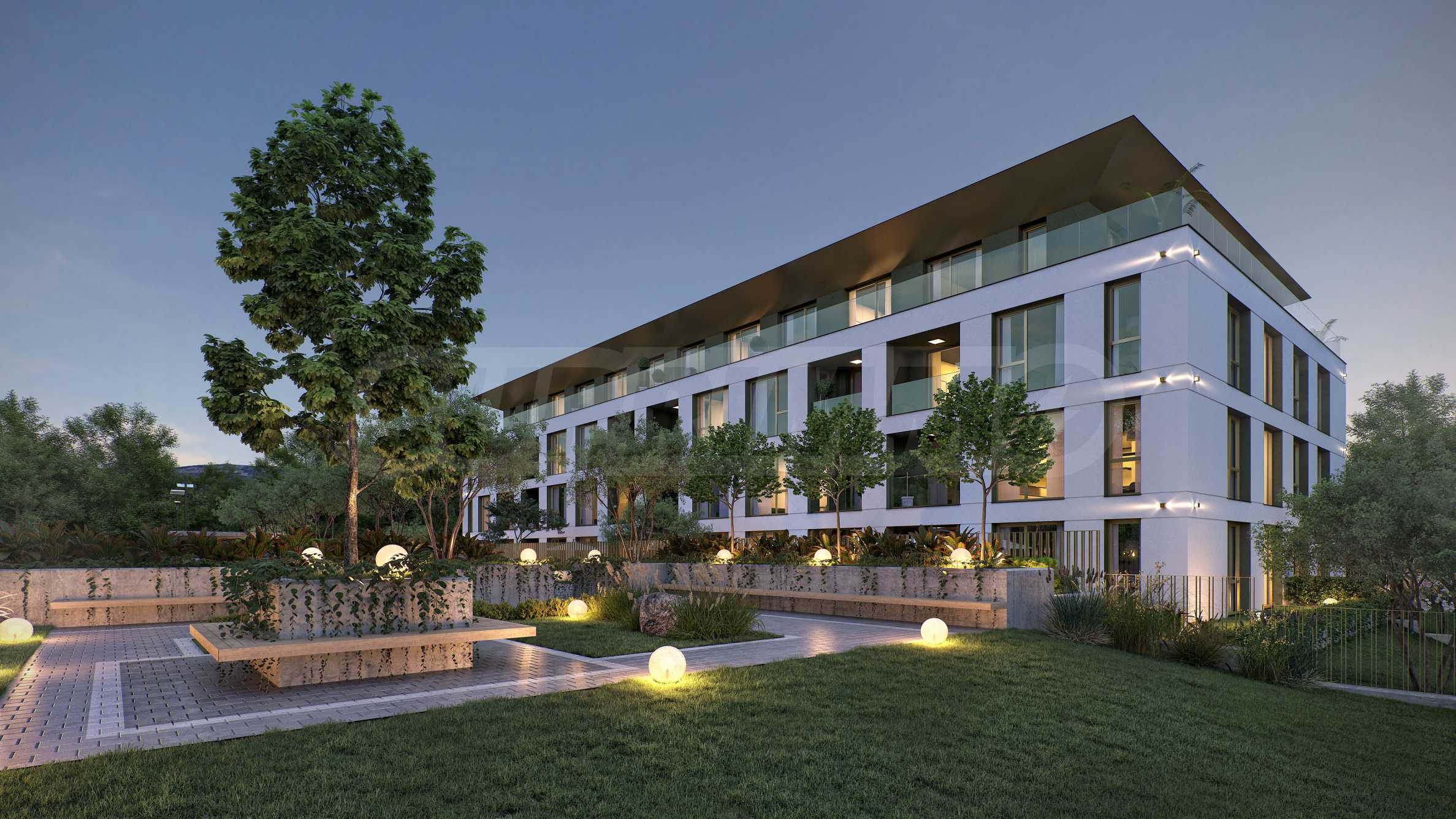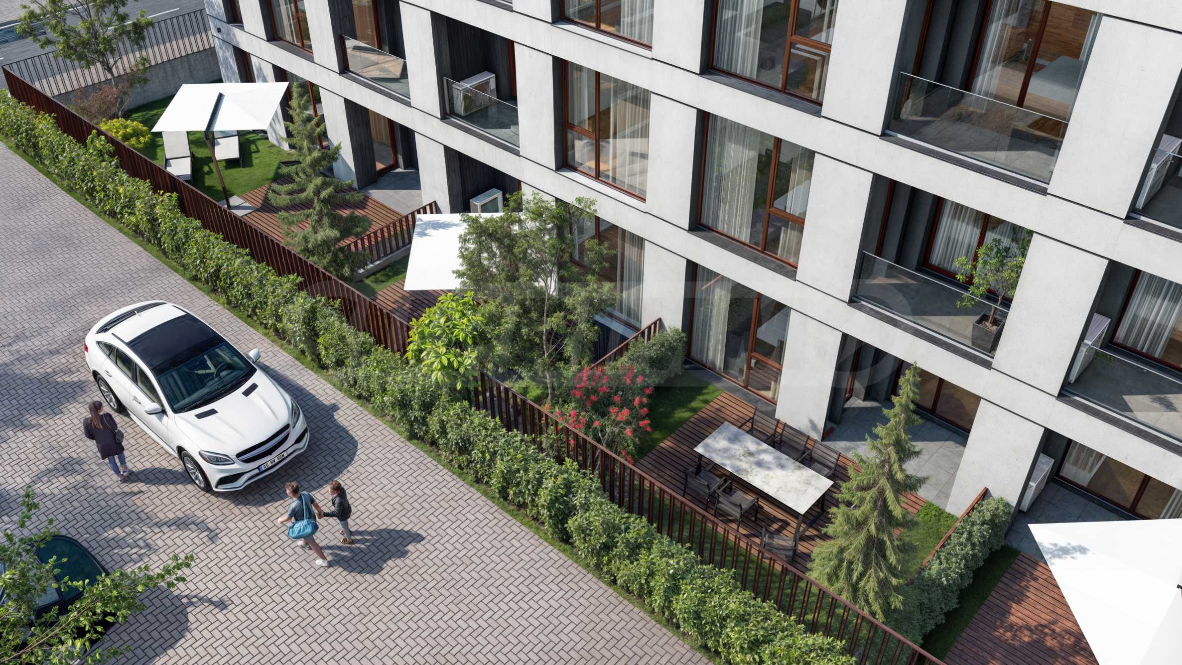 The landscaping is a key element in the overall design of the complex. The spaces around the building include rich vegetation, ornamental trees, shrubs and lawns, which create a sense of harmony and natural environment. Special attention is paid to the green areas with integrated recreation areas, pedestrian alleys, lined with decorative paving and outdoor LED lighting, which highlights the architectural details at night.