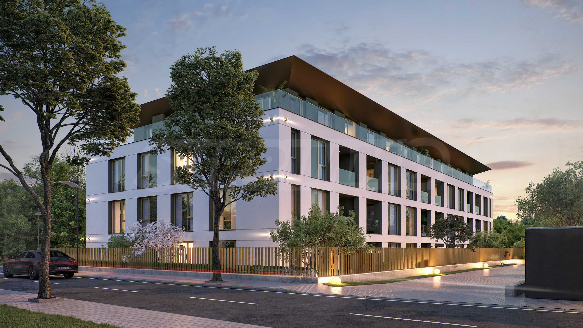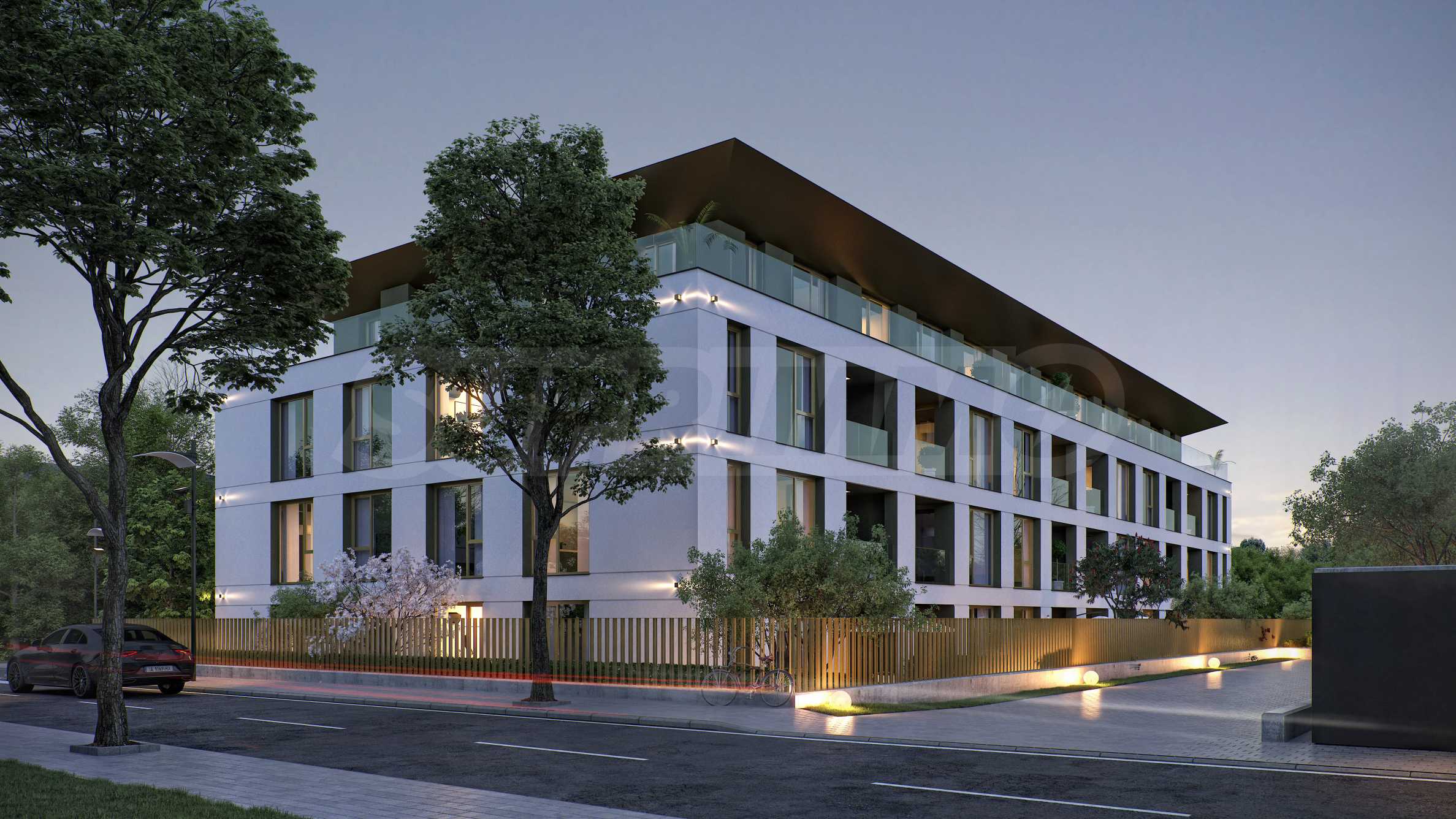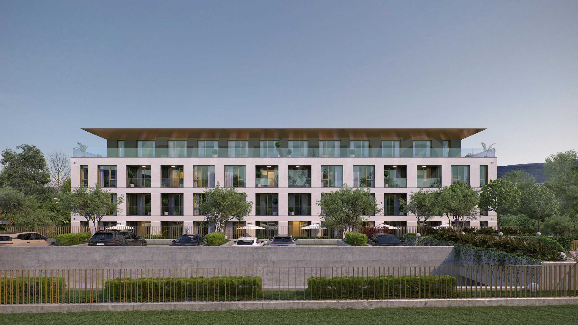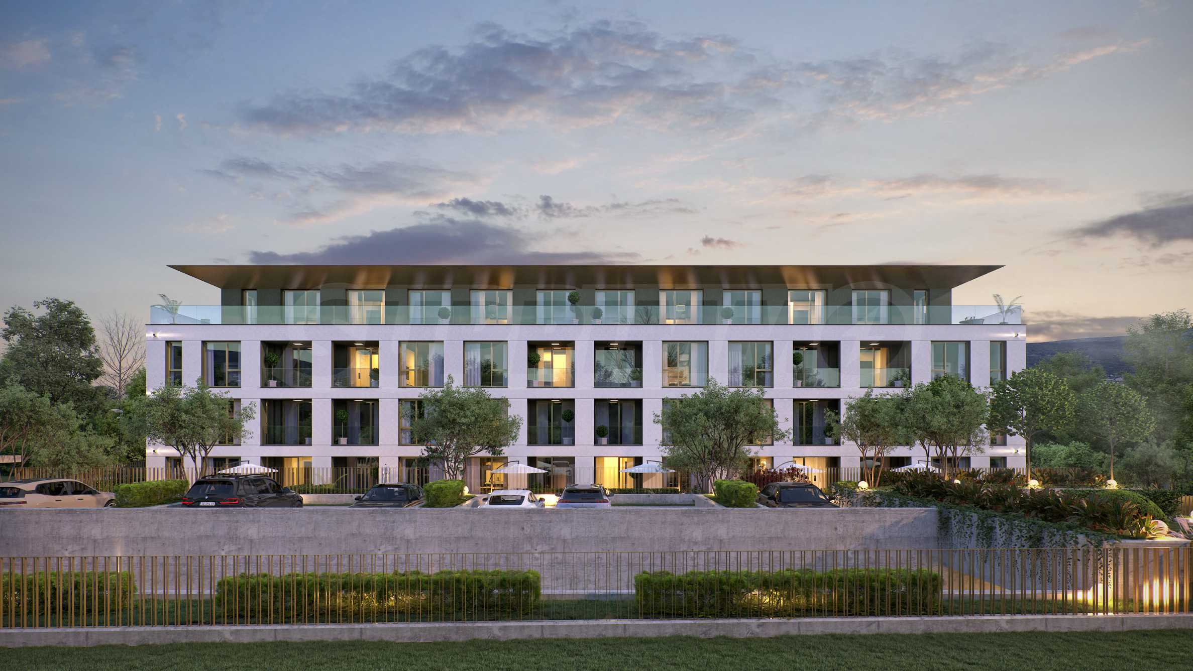 The landscaping is a key element in the overall design of the complex. The spaces around the building include rich vegetation, ornamental trees, shrubs and lawns, which create a sense of harmony and natural environment. Special attention is paid to the green areas with integrated recreation areas, pedestrian alleys, lined with decorative paving and outdoor LED lighting, which highlights the architectural details at night.