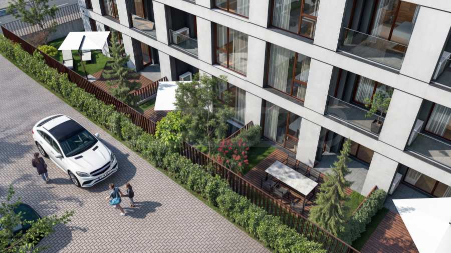 Functionally, the building is designed on four levels with a last terraced floor, with each floor designed with maximum comfort and optimal distribution of the apartments. The ground (first) floor includes affordable apartments with individual green courtyards, as well as a main entrance with a modern and welcoming design. The standard floors offer apartments with spacious loggias and French windows, which increase the connection with the outside space. The apartments on the top floor are designed as luxury penthouses with panoramic terraces, offering unique views and exclusive living. Vertical communication is solved with two elevators and one stairwell, guaranteeing functionality and convenience.