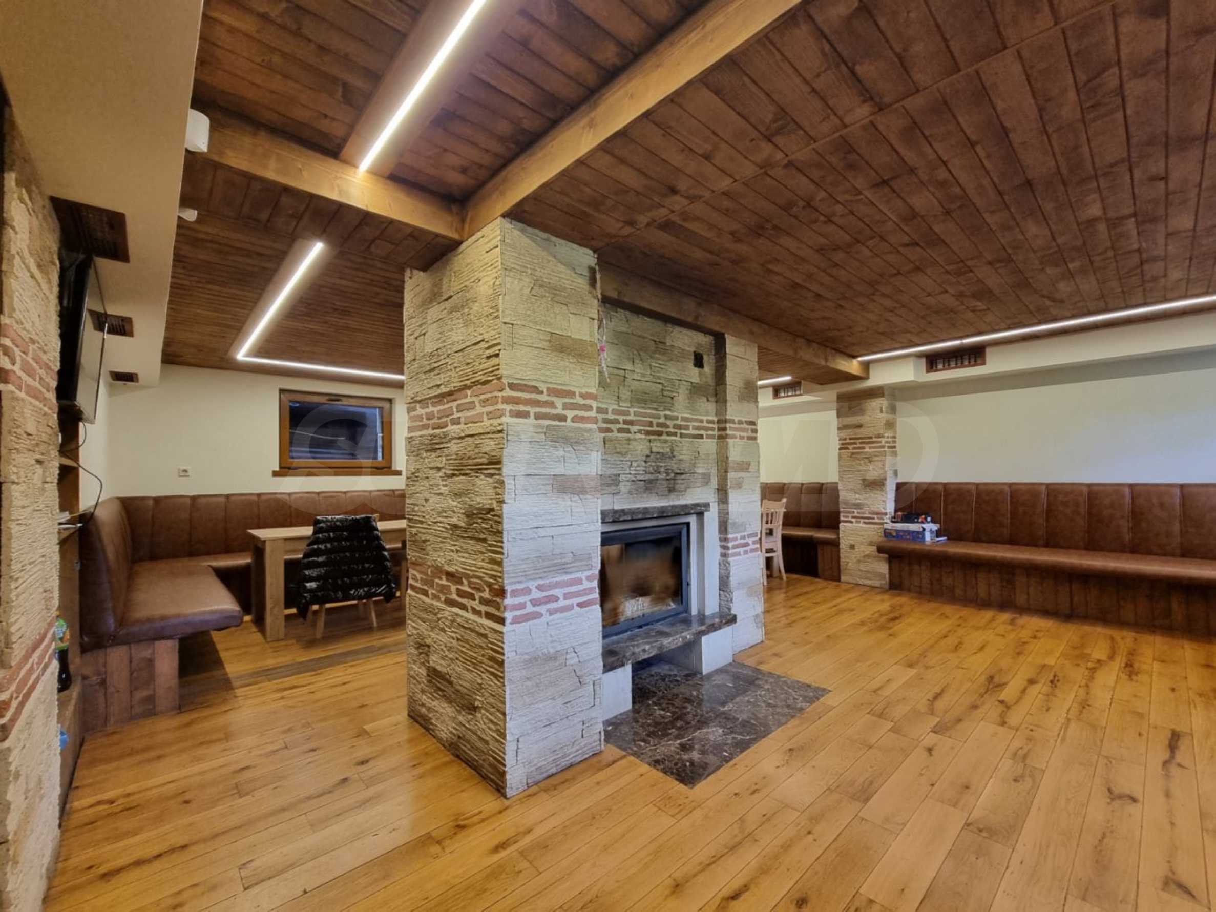 - On the basement floor there is a spacious dining room with a kitchenette, an elegant double-sided fireplace, a bathroom with toilet, an additional toilet and a storage room.