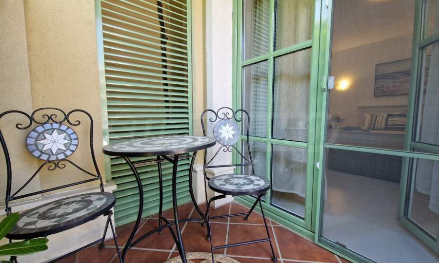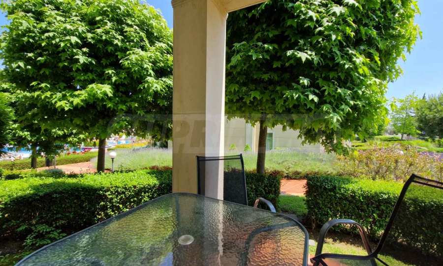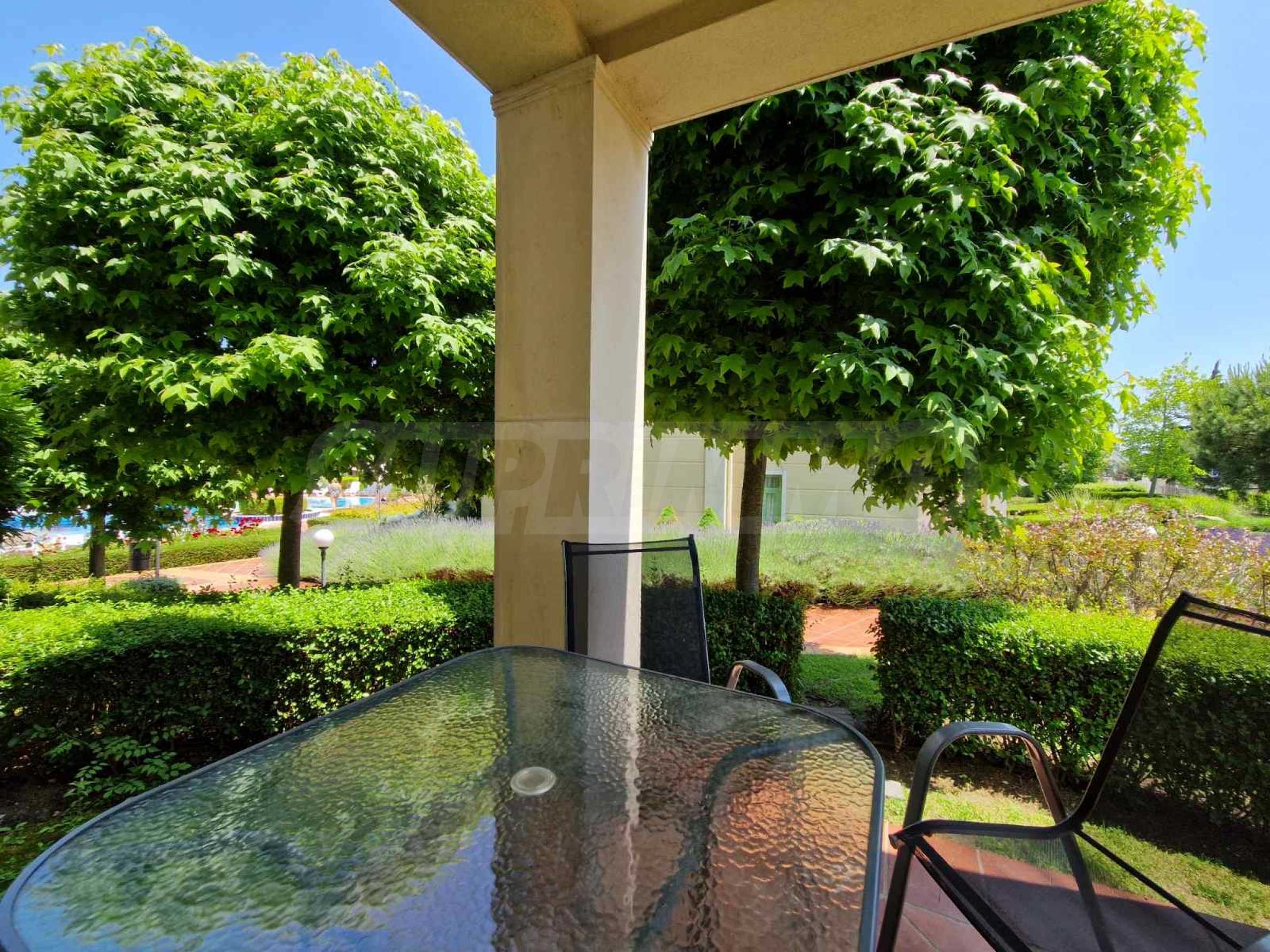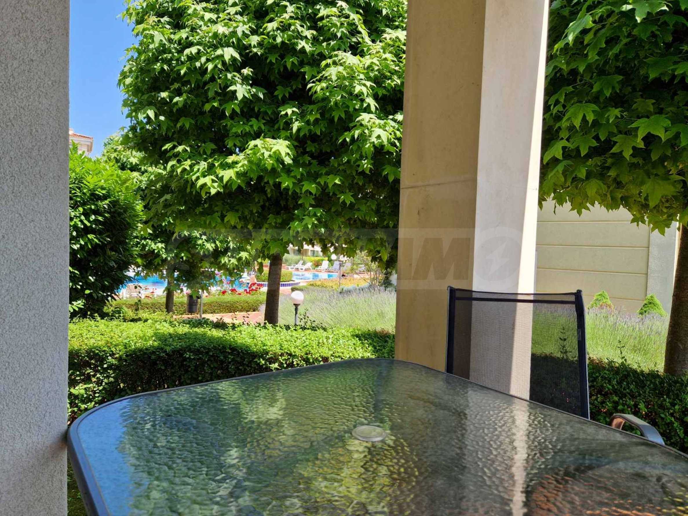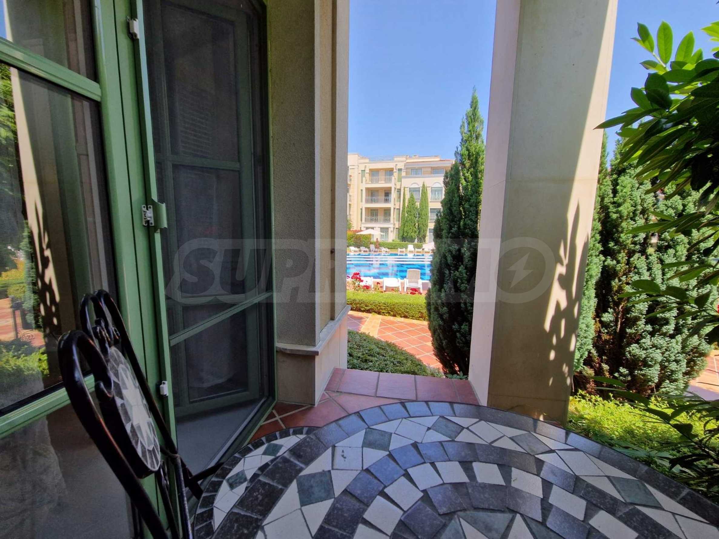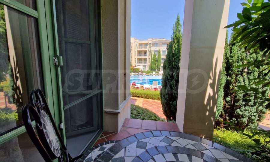 The property is located on the 1st floor with a view of the courtyard and the pool of the complex.