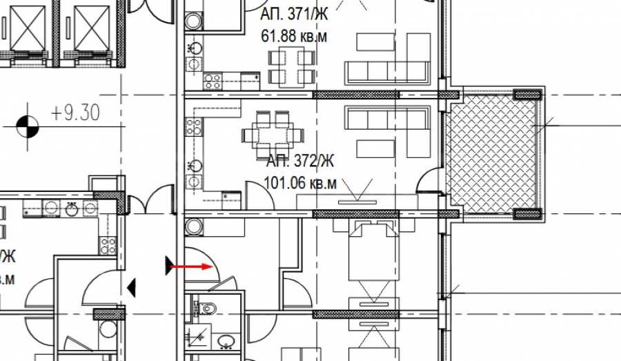 The property is located on the 4th floor and has a favorable south/west exposure. The apartment has a total area of 116.77 m2, net area - 101.06 m2, on which are distributed: entrance hall, bathroom/toilet, living room with kitchen and terrace, one bedroom with private bathroom, second bedroom. The property is being let in a degree of completion according to BDS, with five-chamber PVC joinery Rehau, with triple glazing and an armored entrance door.