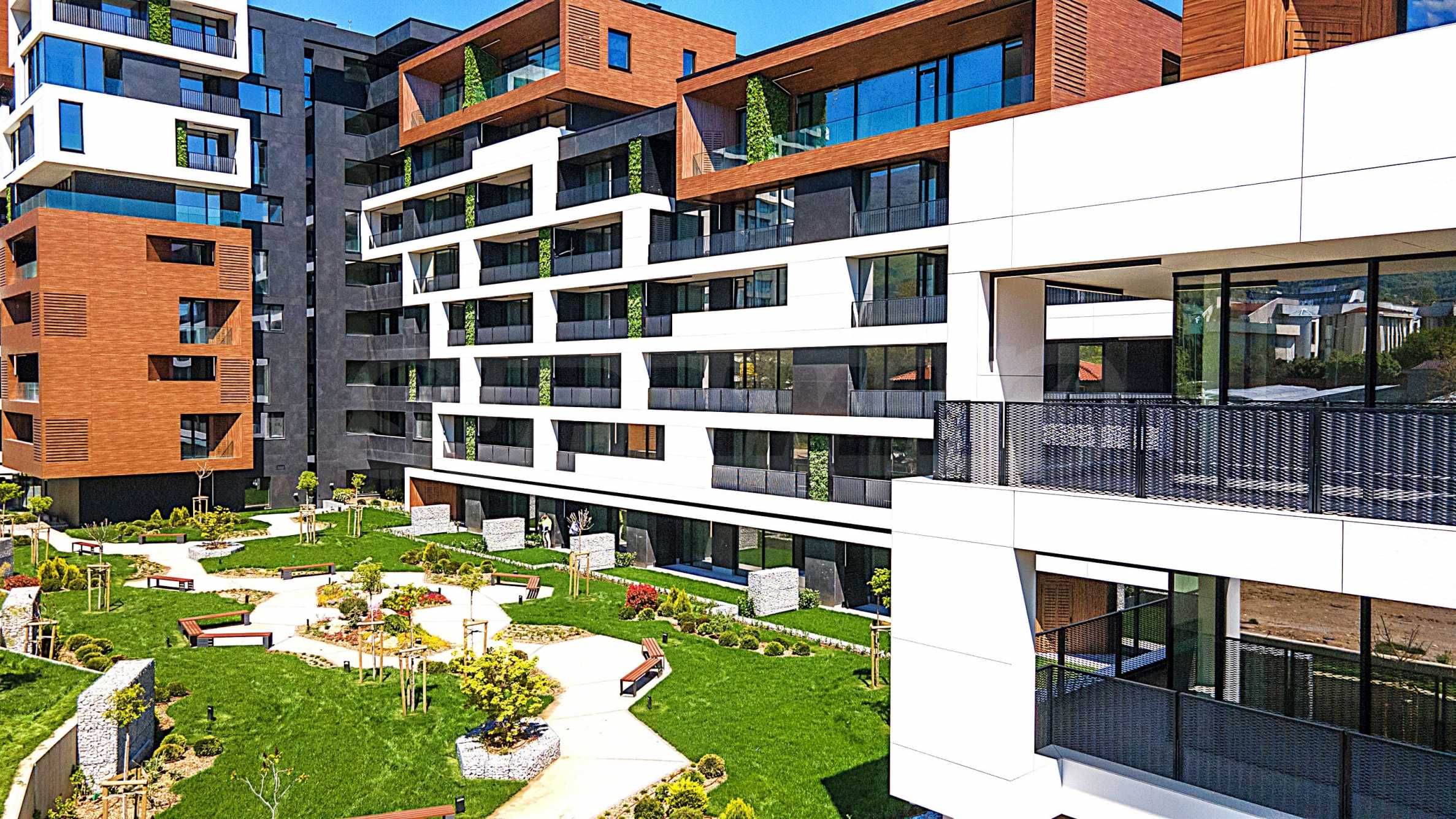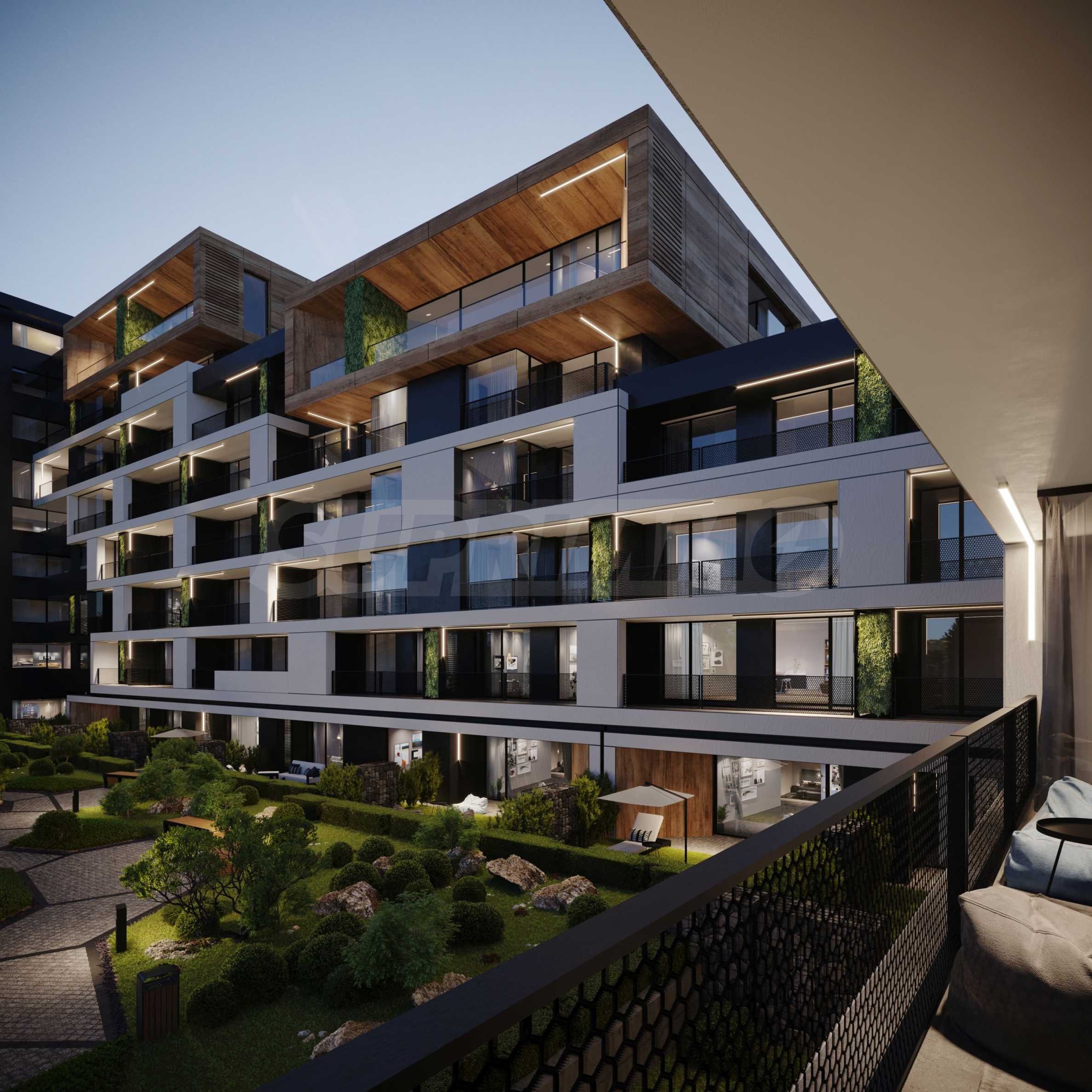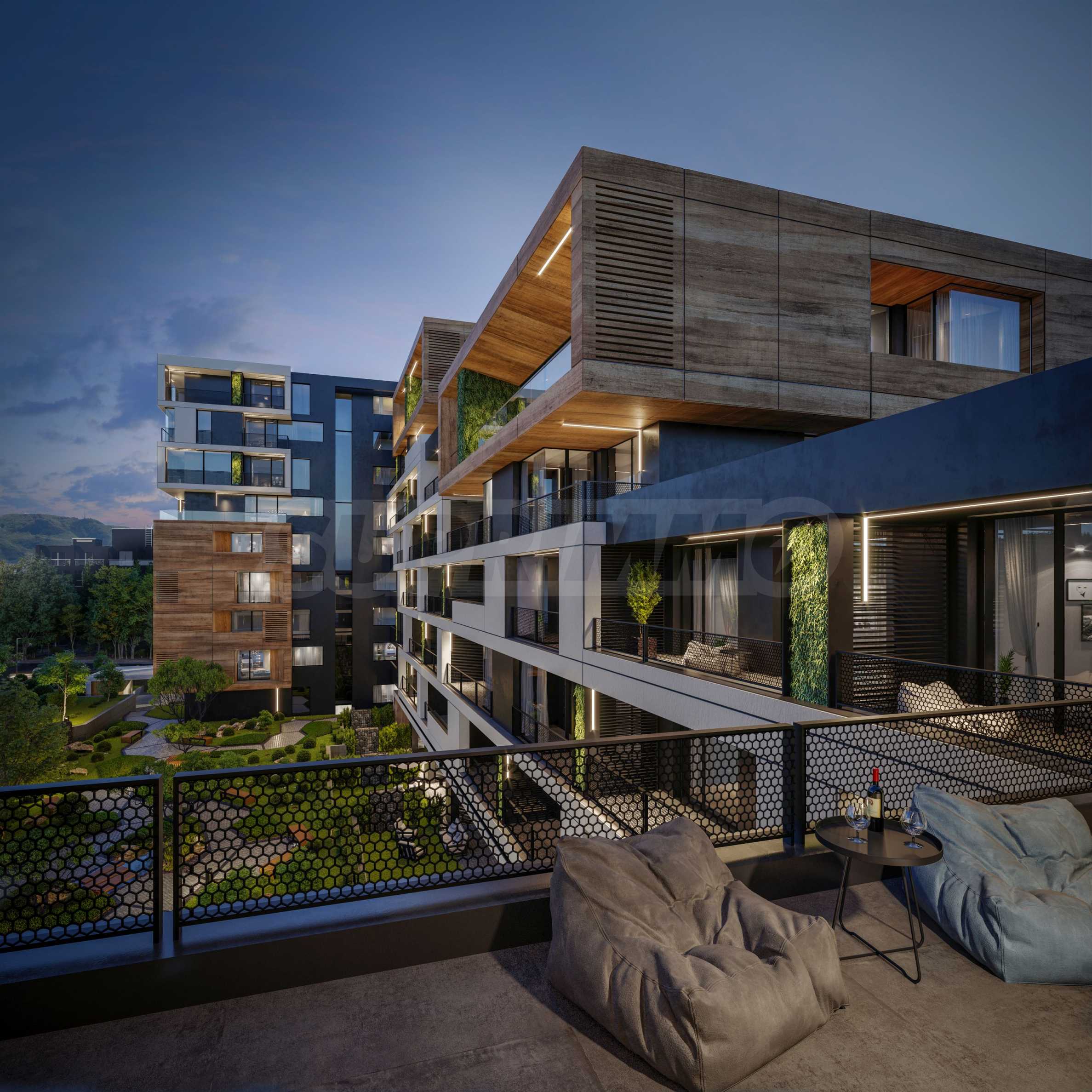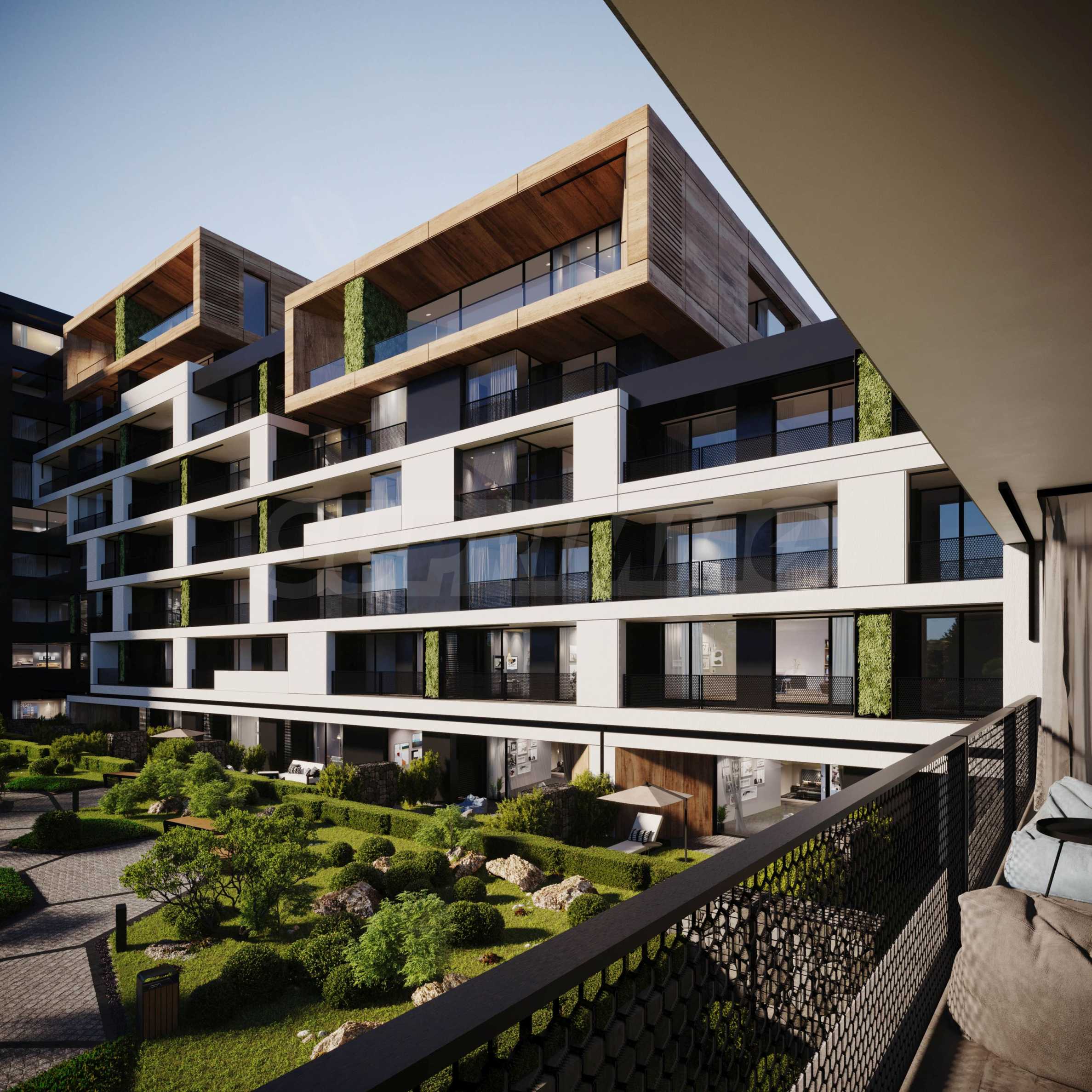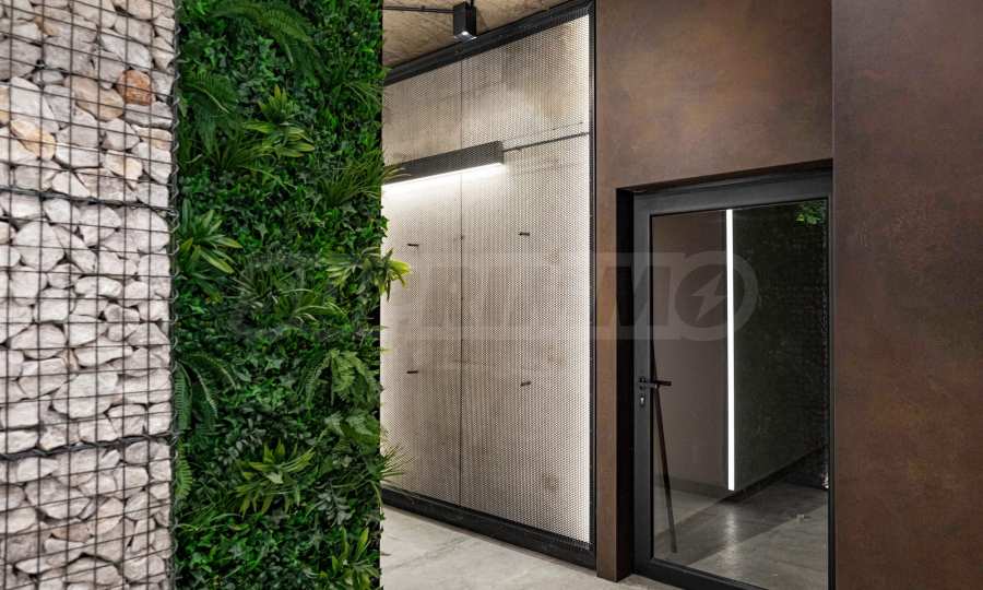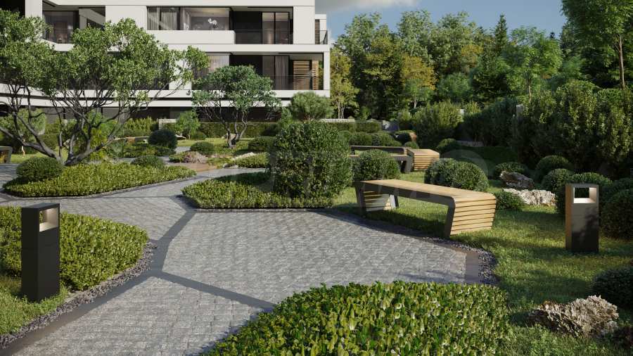 The sought-after play in the plasticity of protruding and sinking glass volumes in the common facade is combined with a motif of vertical green walls, aesthetically hiding air conditioning units. All terraces, including those on the top floor, are designed as covered in view of the sun. The flooring of the terraces is a type of double floor of granite tiles. The openwork railings are made in two versions - glass triplex or with a metal frame with expanded metal mesh in black according to architectural detail, following the compositional idea. The additional composition of the facade linear LED lighting is purposefully sought to emphasize the main idea at night. The idea of the dynamic composition is continued in the project for landscaping the main courtyard of the complex in combination with gabions, park furniture and lighting and a water area.