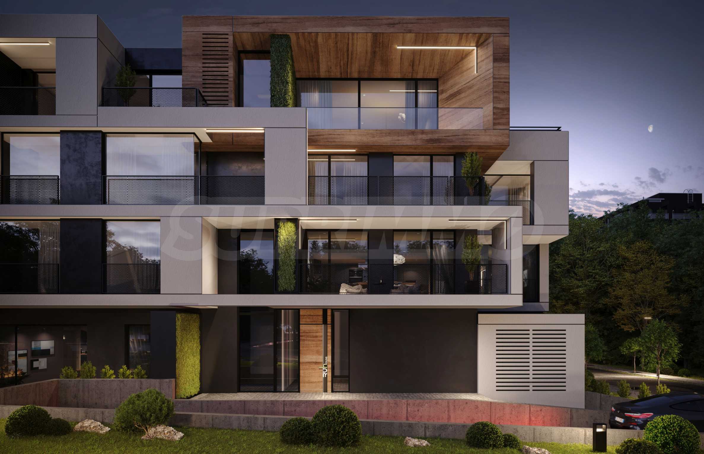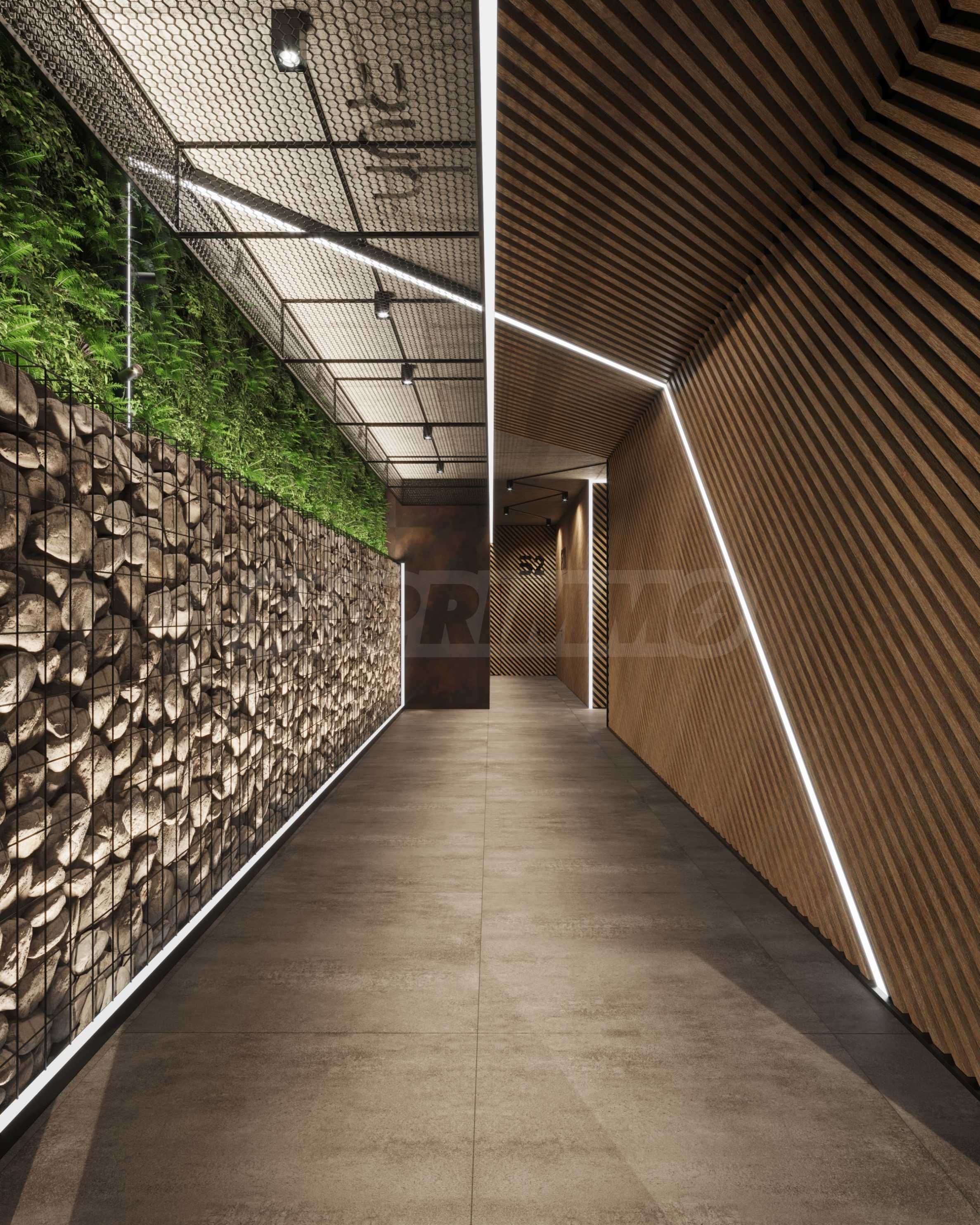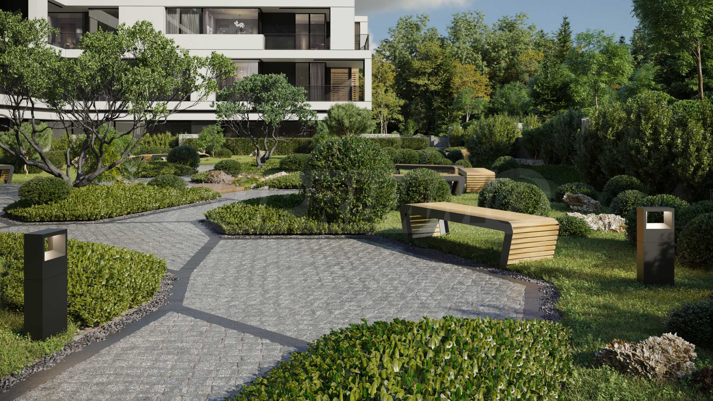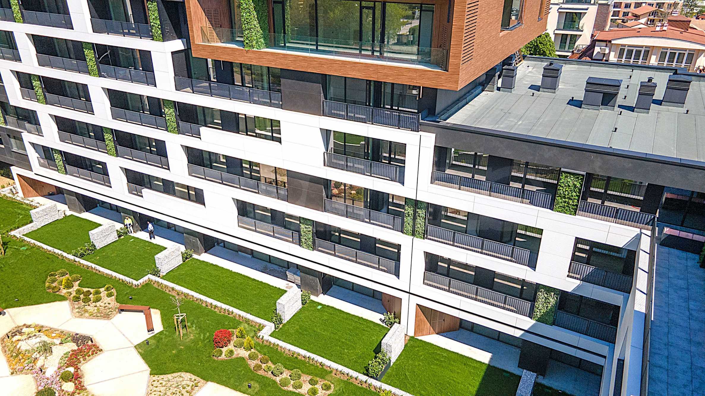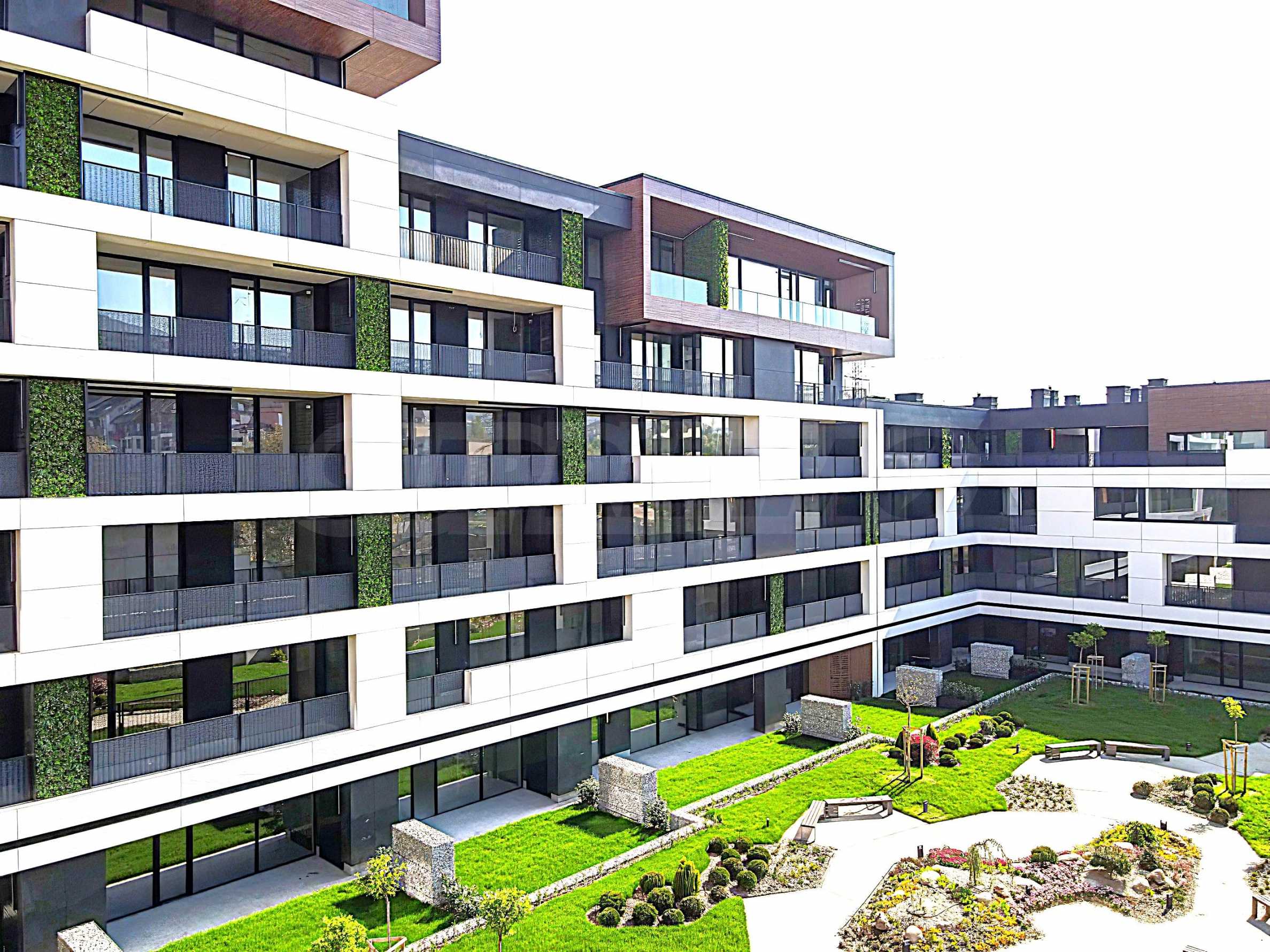 The sought-after play in the plasticity of protruding and sinking glass volumes in the common facade is combined with a motif of vertical green walls, aesthetically hiding air conditioning units. All terraces, including those on the top floor, are designed as covered in view of the sun. The flooring of the terraces is a type of double floor of granite tiles. The openwork railings are made in two versions - glass triplex or with a metal frame with expanded metal mesh in black according to architectural detail, following the compositional idea. The additional composition of the facade linear LED lighting is purposefully sought to emphasize the main idea at night. The idea of the dynamic composition is continued in the project for landscaping the main courtyard of the complex in combination with gabions, park furniture and lighting and a water area.