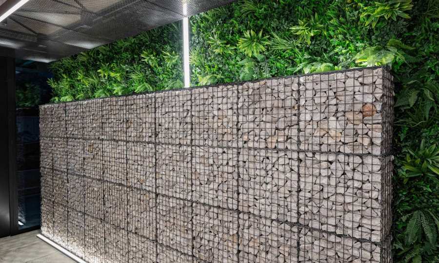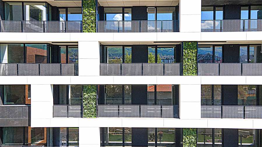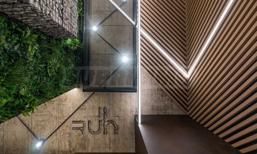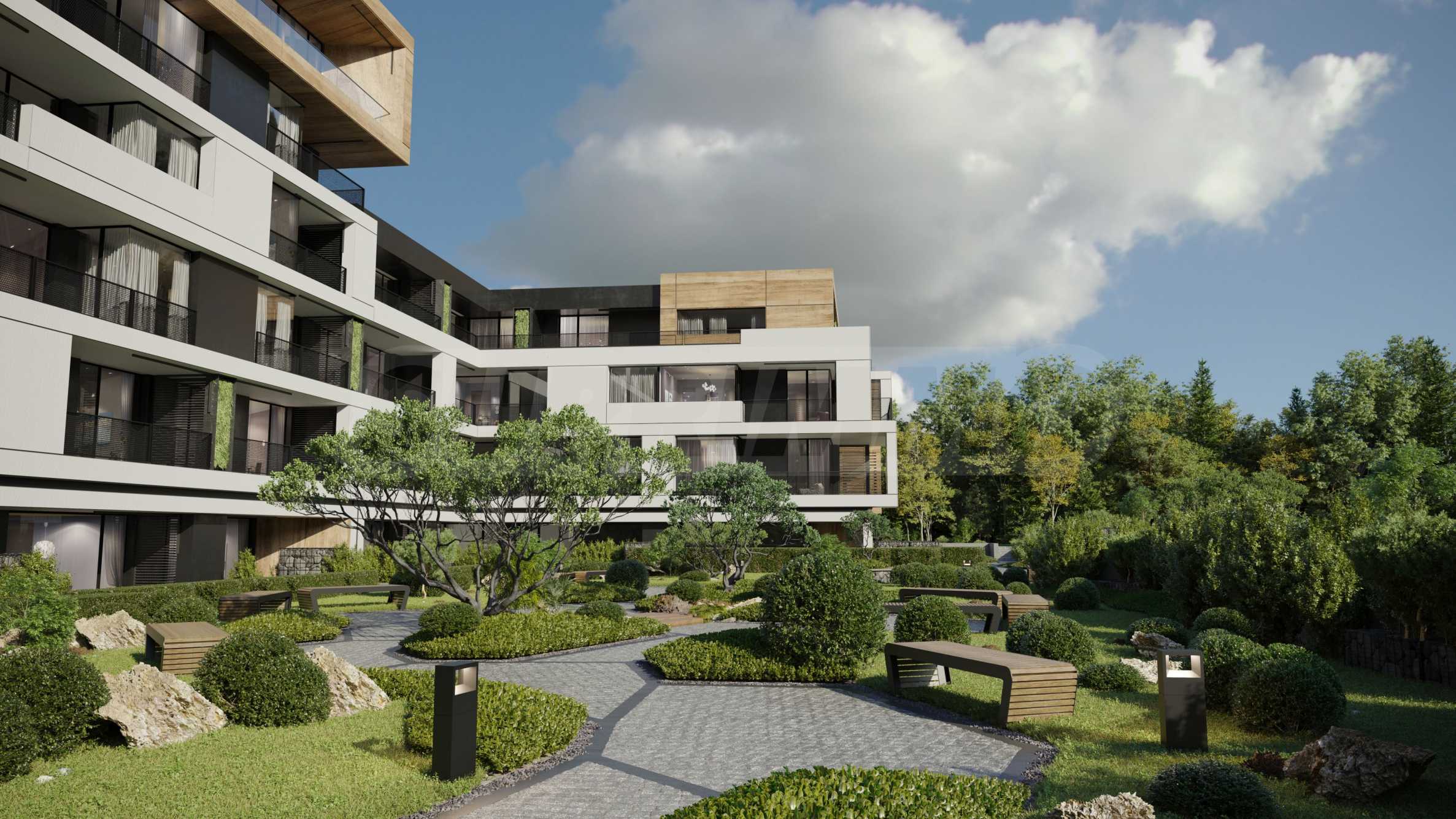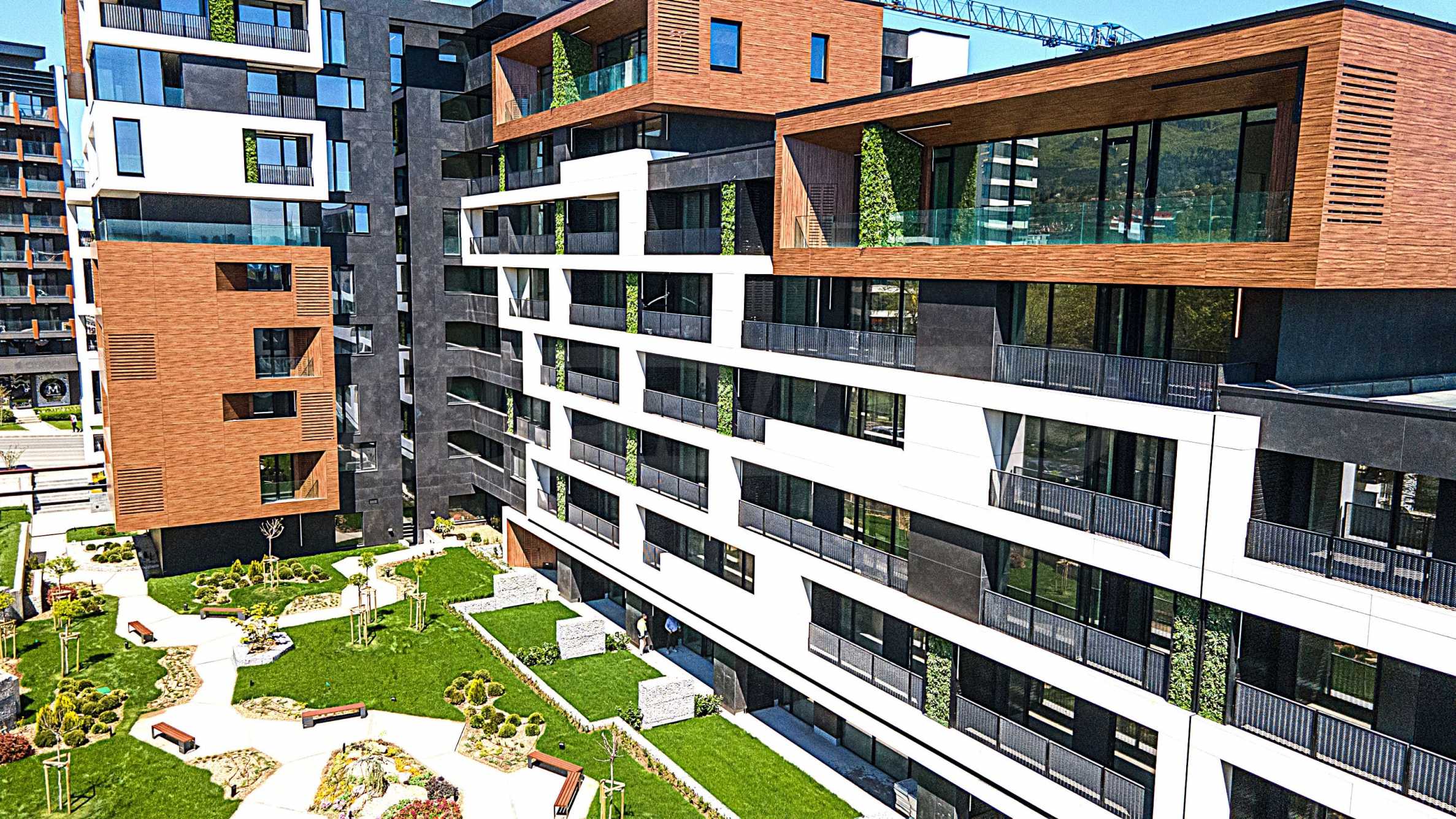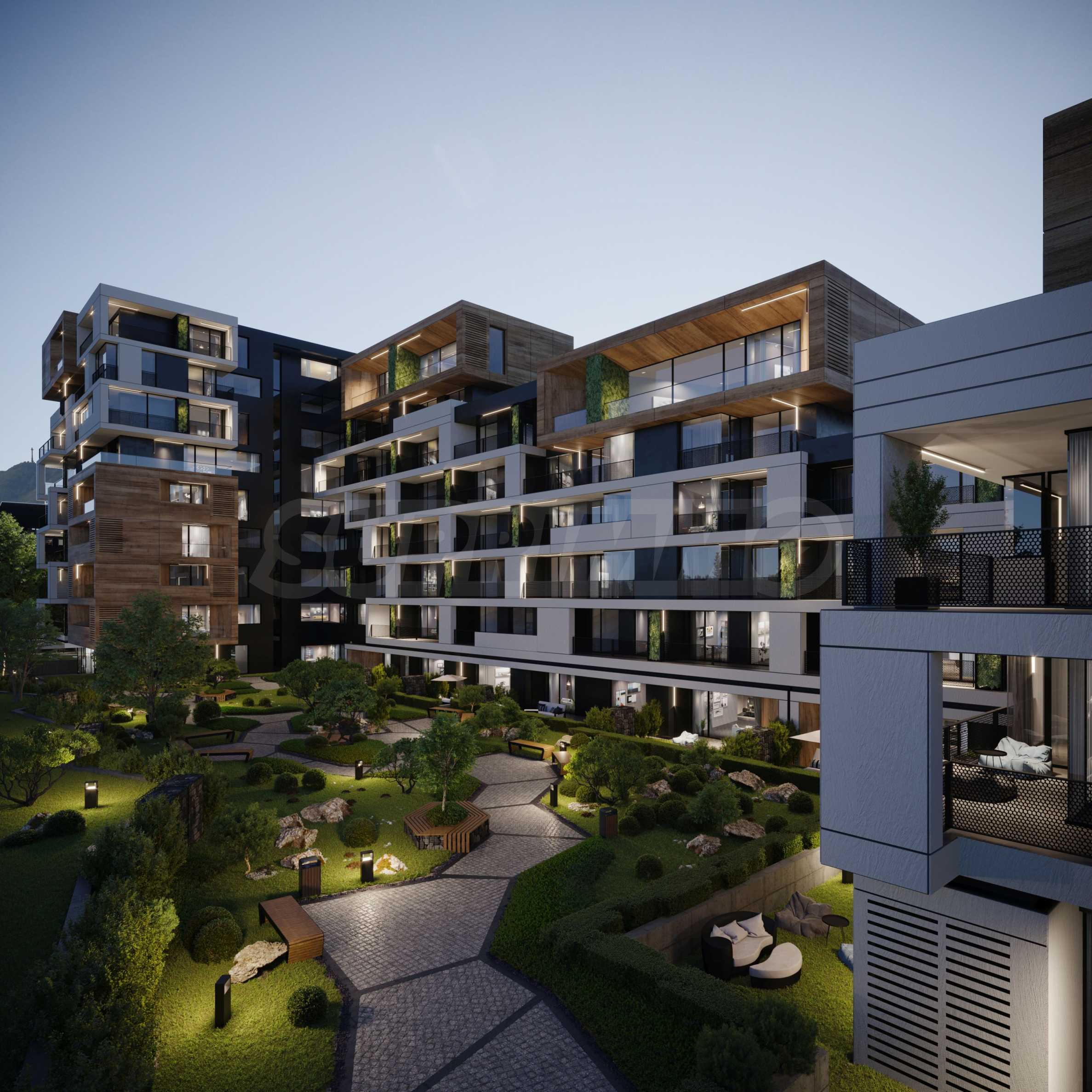 The sought-after play in the plasticity of protruding and sinking glass volumes in the common facade is combined with a motif of vertical green walls, aesthetically hiding air conditioning units. All terraces, including those on the top floor, are designed as covered in view of the sun. The flooring of the terraces is a type of double floor of granite tiles. The openwork railings are made in two versions - glass triplex or with a metal frame with expanded metal mesh in black according to architectural detail, following the compositional idea. The additional composition of the facade linear LED lighting is purposefully sought to emphasize the main idea at night. The idea of the dynamic composition is continued in the project for landscaping the main courtyard of the complex in combination with gabions, park furniture and lighting and a water area.