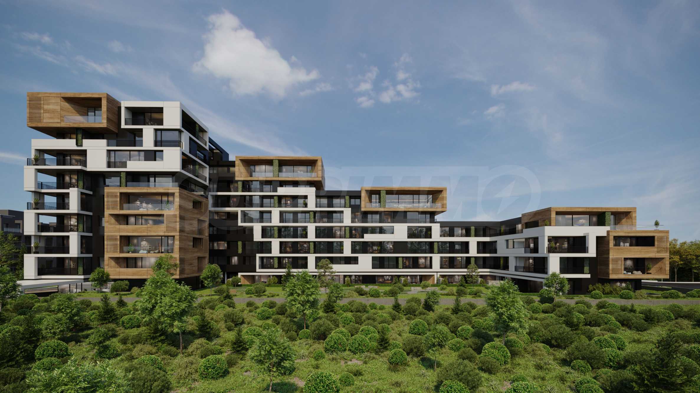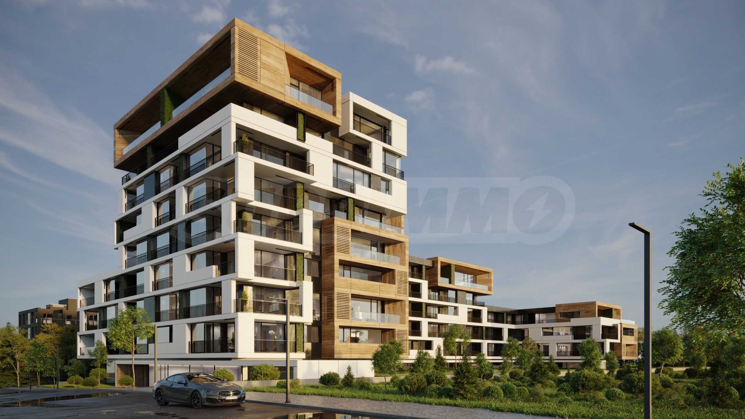 The concept of the dynamics in the urban environment is sought in terms of volume, space and facade. The project is a composition of 9-, 8-, 6- and 4-storey volumes in a common stepped structure, descending to the east towards the future Lozenets Park. Additional accents in the composition are the volumes of the penthouses as peculiar boxes, filled with HPL panels FUNDERMAX walnut, which house luxury apartments with a greater clear floor height (3.30 m).