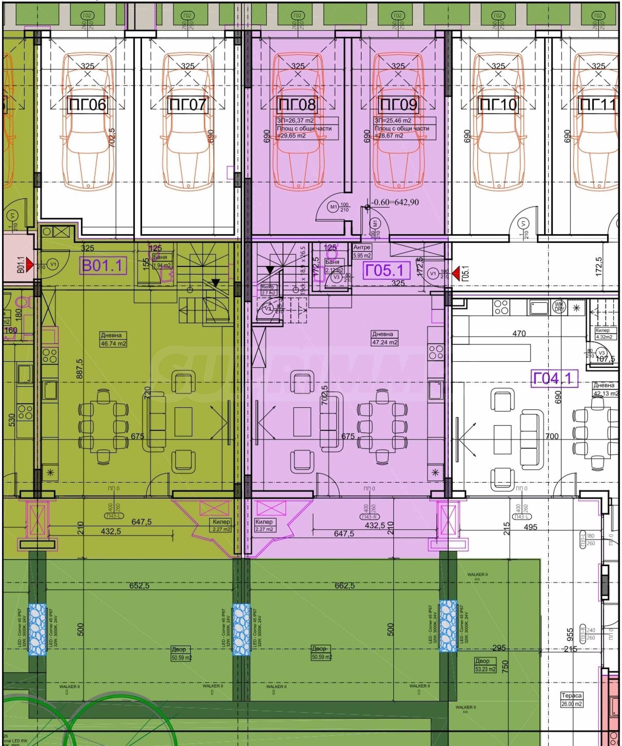 The maisonette is located on the first and second floors and has a southern exposure (without one northern bedroom). It has a 50.59 sq m spacious adjoining yard and two ground-level garages with direct entrance to the apartment. Two more cars can be parked in front of the garages. The price of the garages - 55,000 euros (107,569 leva) excluding VAT each.