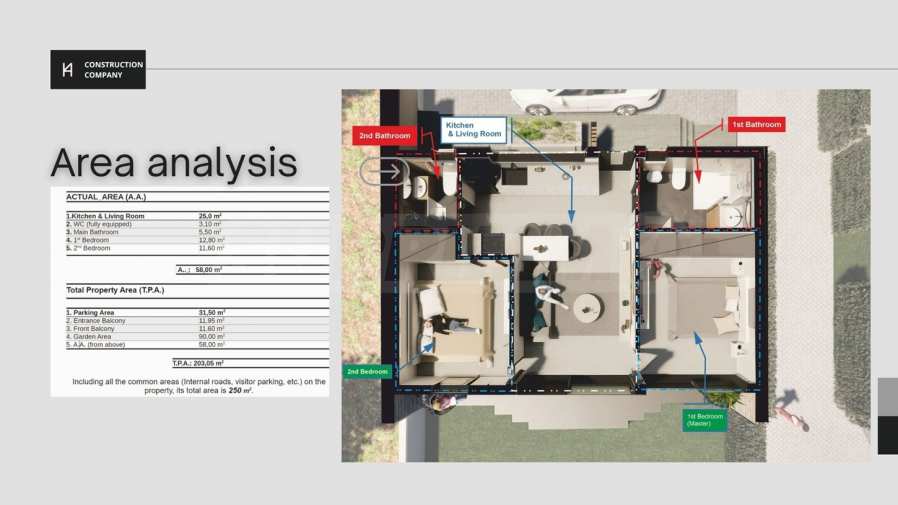 The project consists of seven (7) detached holiday homes, the construction of which is scheduled to start in January 2026. It is located in the area of Nea Kerdilia (one (1) hour from Thessaloniki and 40 minutes from Kavala). The area is undergoing great development for two main reasons, firstly, it is on the periphery of the archaeological site of Amphipolis and the new Macedonian tomb on the hill of Kastas, and secondly, the long coastline of the entire area (continuous coastline - beaches from Asprovalta to Kavala). Also, easy access to Halkidiki (2nd and 3rd legs) in just one (1) hour via Stavros.