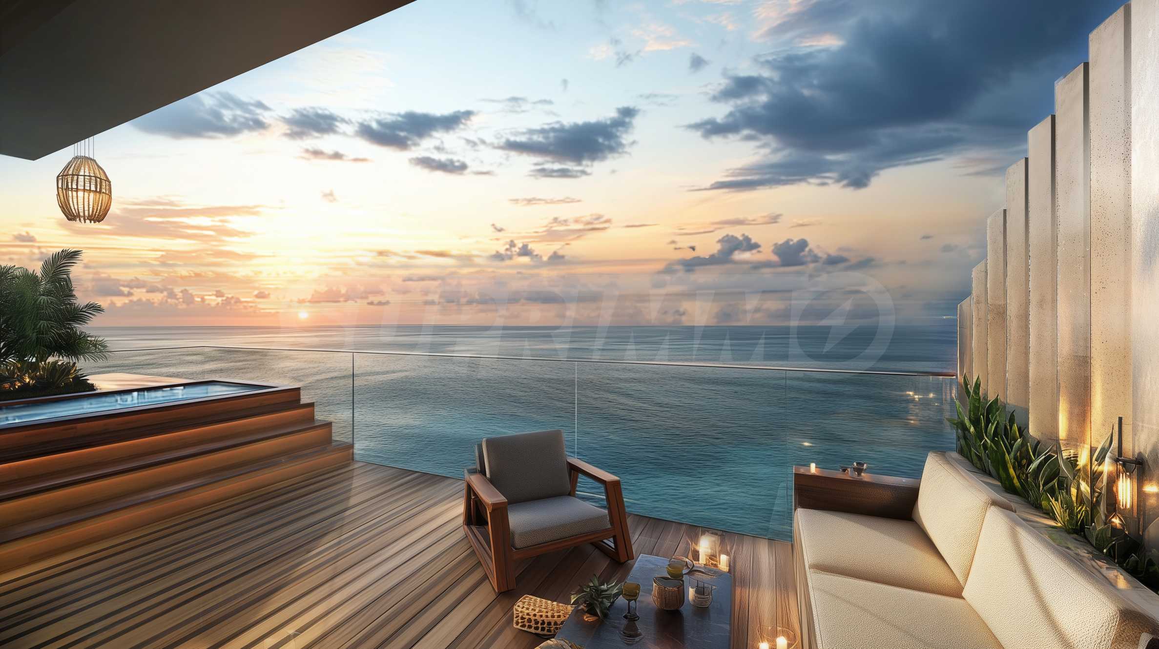 The apartment is located on the 9th floor of the building and has a total area of 98 sq m, of which 93 sq m are intended for the interior and 5 sq m for the exterior space. With high ceilings and floor-to-ceiling windows that serve as frames capturing the incredible landscapes that the sea will paint for you every day. The layout of the property is extremely comfortable and functional, including a spacious open-plan living room, combined kitchen and dining room, master bedroom with en-suite bathroom and walk-in closet, second bedroom with bathroom, guest toilet and balcony.
