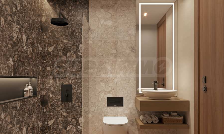 The kitchen is equipped with a natural stone countertop (the specific material is yet to be specified), MDF cabinets with melamine or Formica thermo-adhesive finish, as well as flat doors, the color of which will be specified at a later stage. Stainless steel faucets, a gas hob and a built-in oven are provided - a combination of functionality, durability and a contemporary look.
