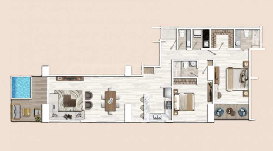We present a spacious two-bedroom apartment with a beautiful pool on the terrace in Uniko Residences - an architectural masterpiece located on the shores of the Caribbean Sea, in one of the most desirable destinations in the Caribbean - Santo Domingo. The building rises 32 floors and impresses with a bold vision, exceptional views of the sea and spacious apartments in the heart of the Dominican Republic.