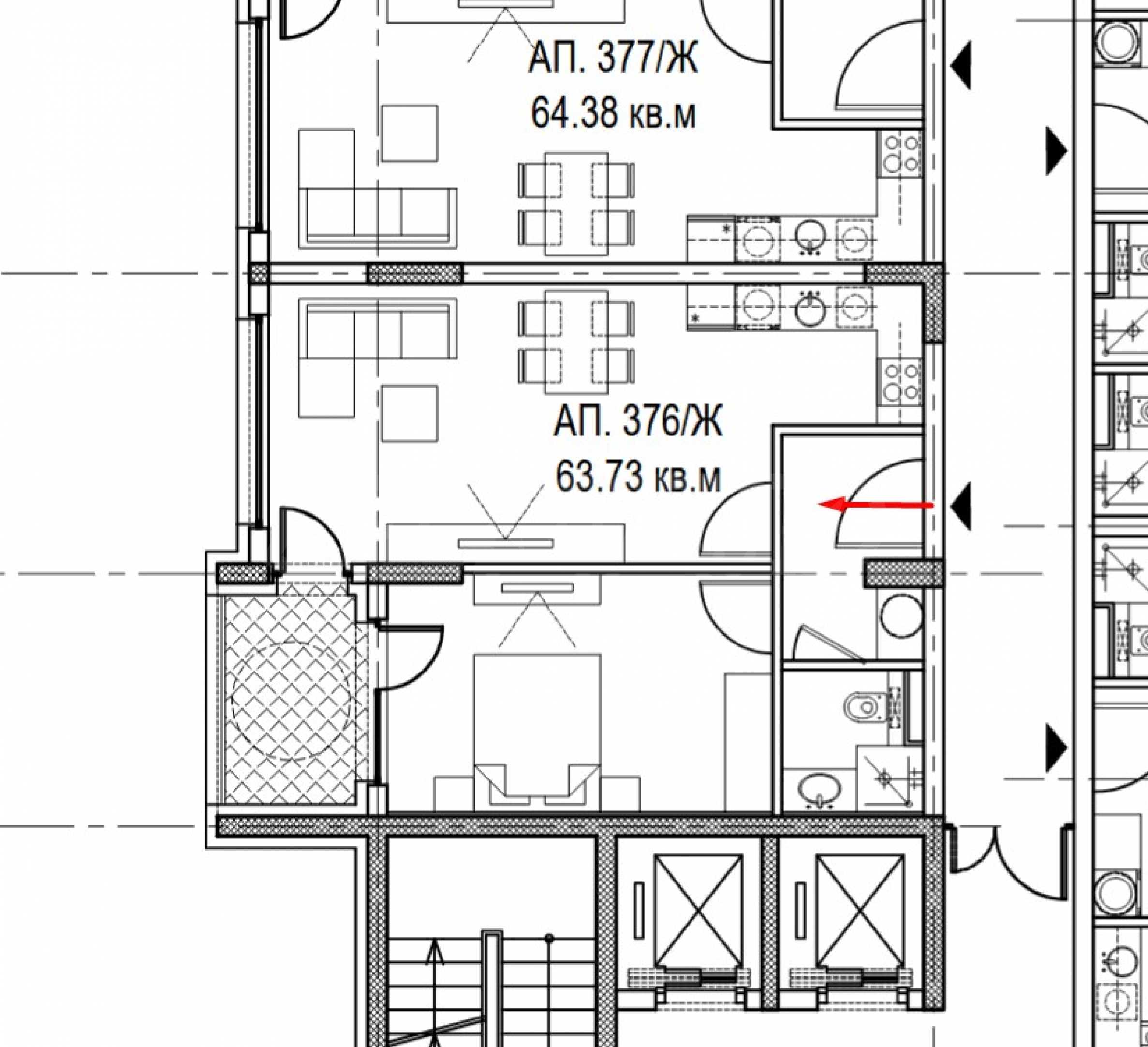 The property is located on the 5th floor and has a total area of 73.63 m2, net area - 63.73 m2, on which are distributed: entrance hall, bathroom with toilet, living room with kitchen, terrace, one bedroom. It is being let in a degree of completion according to Bulgarian Standards, with five-chamber PVC joinery Rehau, with triple glazing and an armored entrance door.