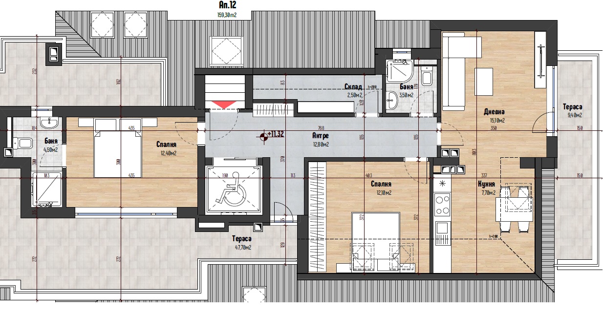 •A total of 12 apartments, distributed over 3 apartments per floor;