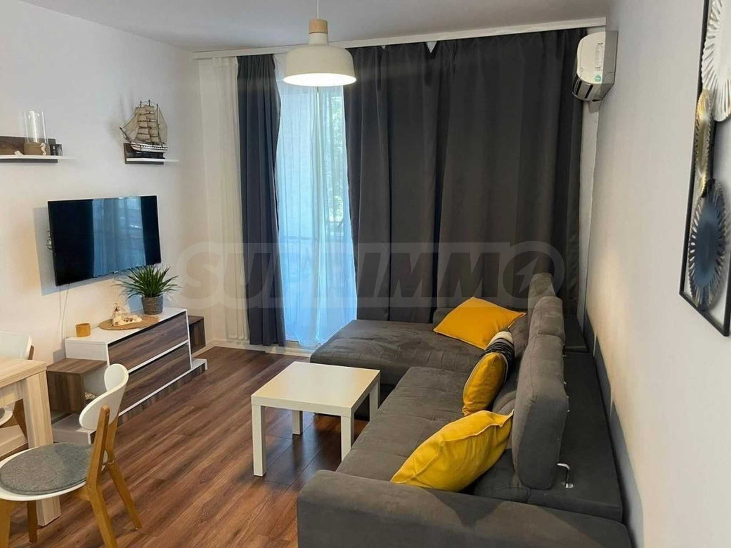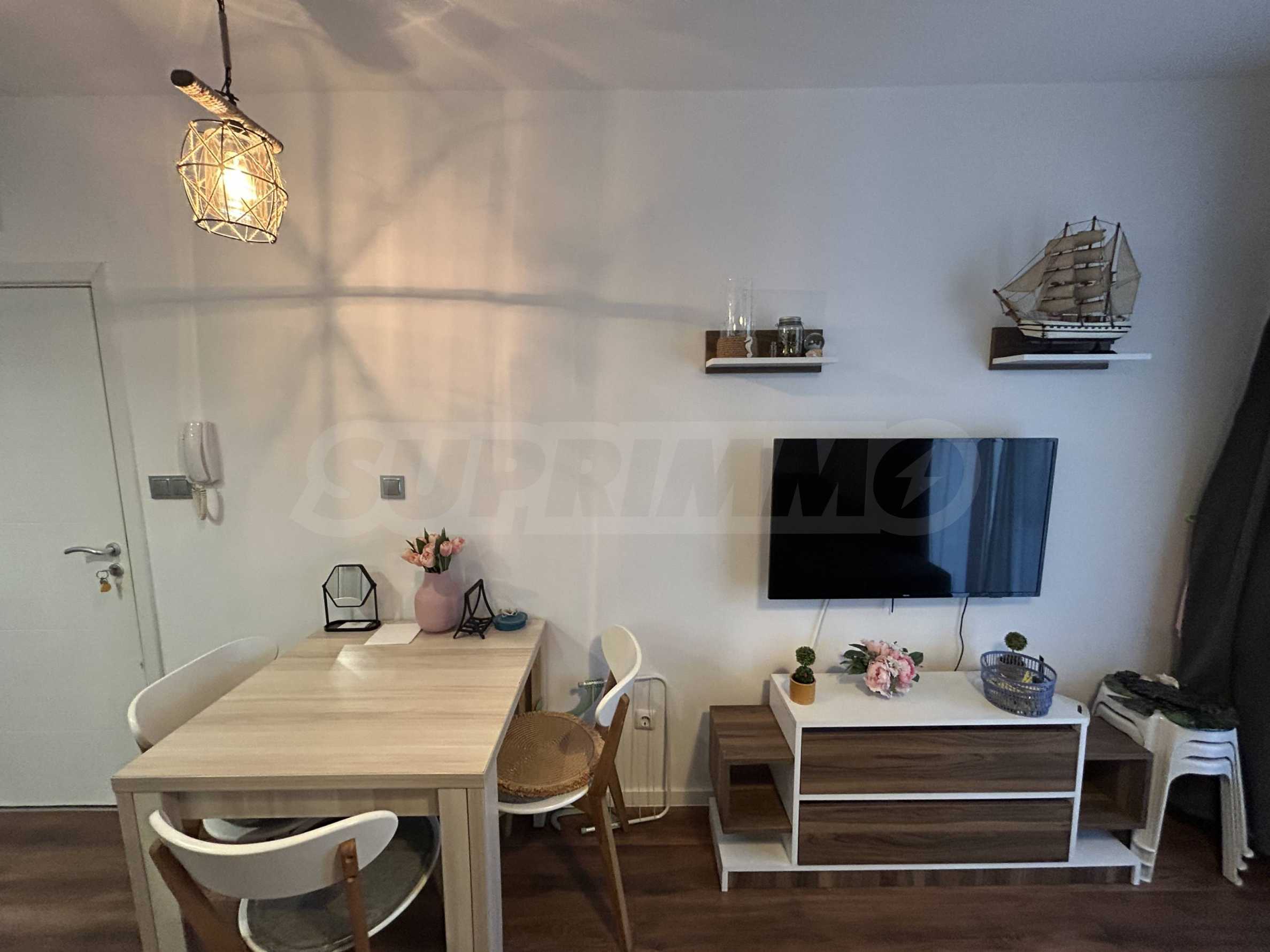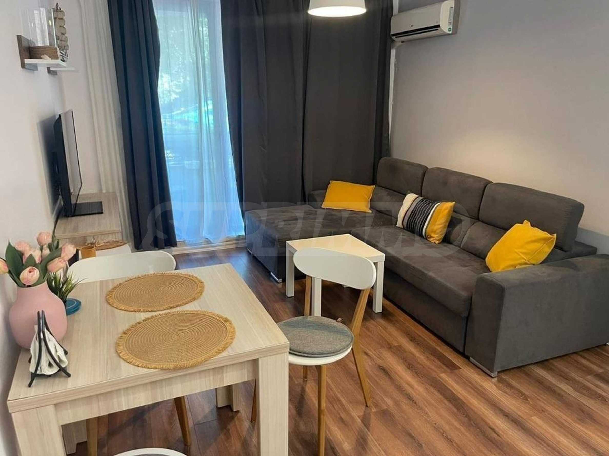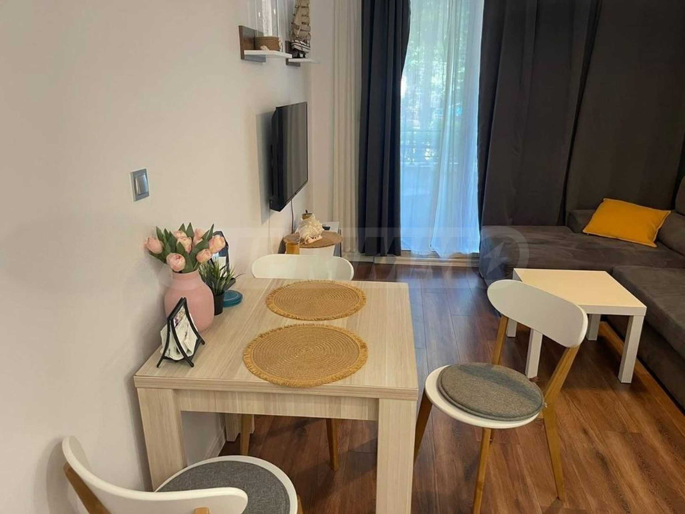 The apartment is located on the 1st floor, fully furnished and equipped, ready to move in. The space is functionally distributed between a bright living room with a fully equipped kitchenette, a dining area, a relaxation area, a separate bedroom, a bathroom and a terrace. The panoramic windows provide natural light throughout the day and create a feeling of spaciousness.