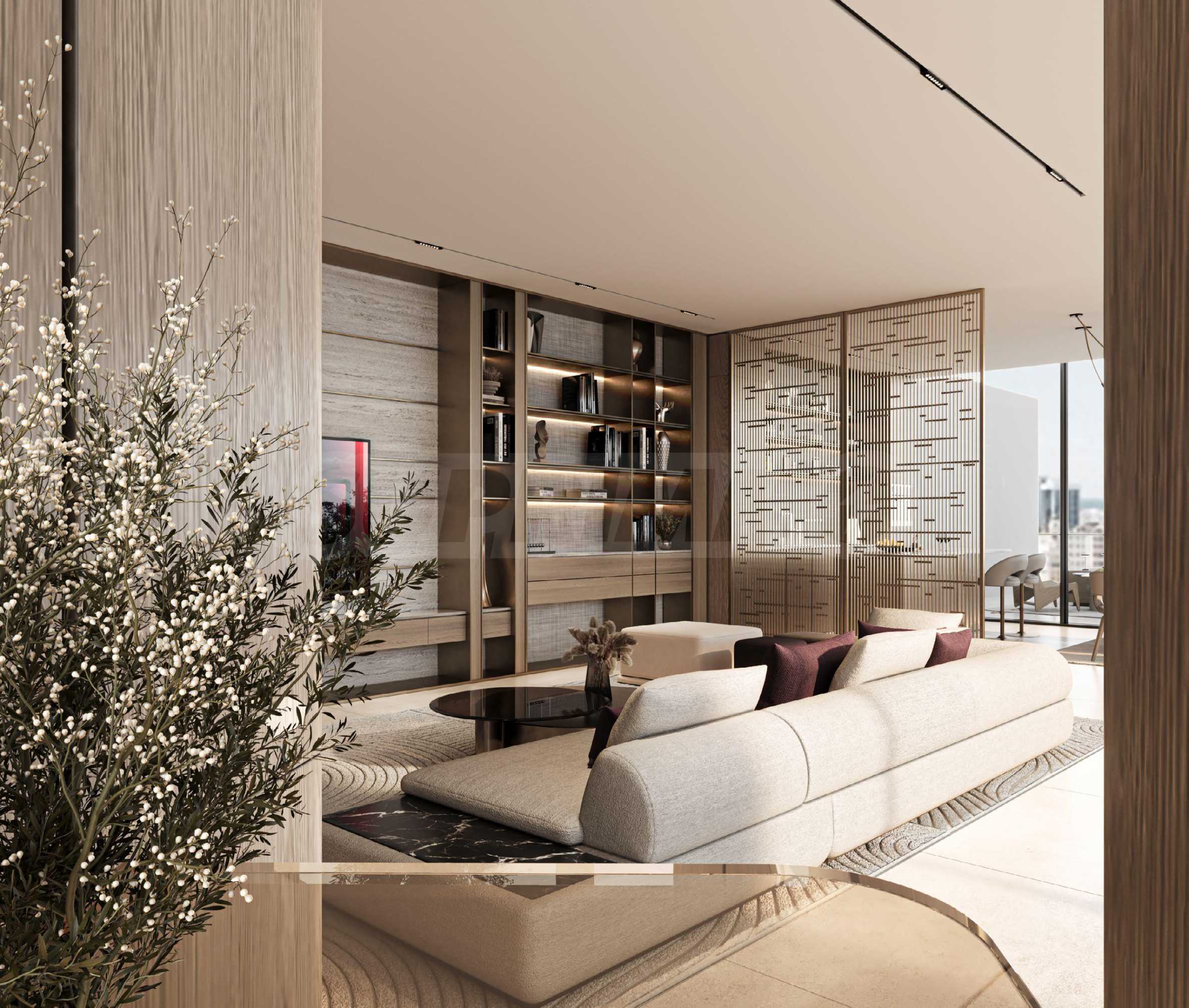 We present a functional and stylish one-bedroom apartment, located on the fourth floor of the building, with a total area of 76.34 sq m, including a terrace of 13.25 sq m. The layout includes a spacious living room with kitchen and dining area, bedroom, bathroom, separate guest toilet and terrace. The apartment is designed to provide the perfect balance between modern luxury, comfort and practicality. High ceilings and panoramic floor-to-ceiling windows fill the space with natural light and create a pleasant feeling of spaciousness.